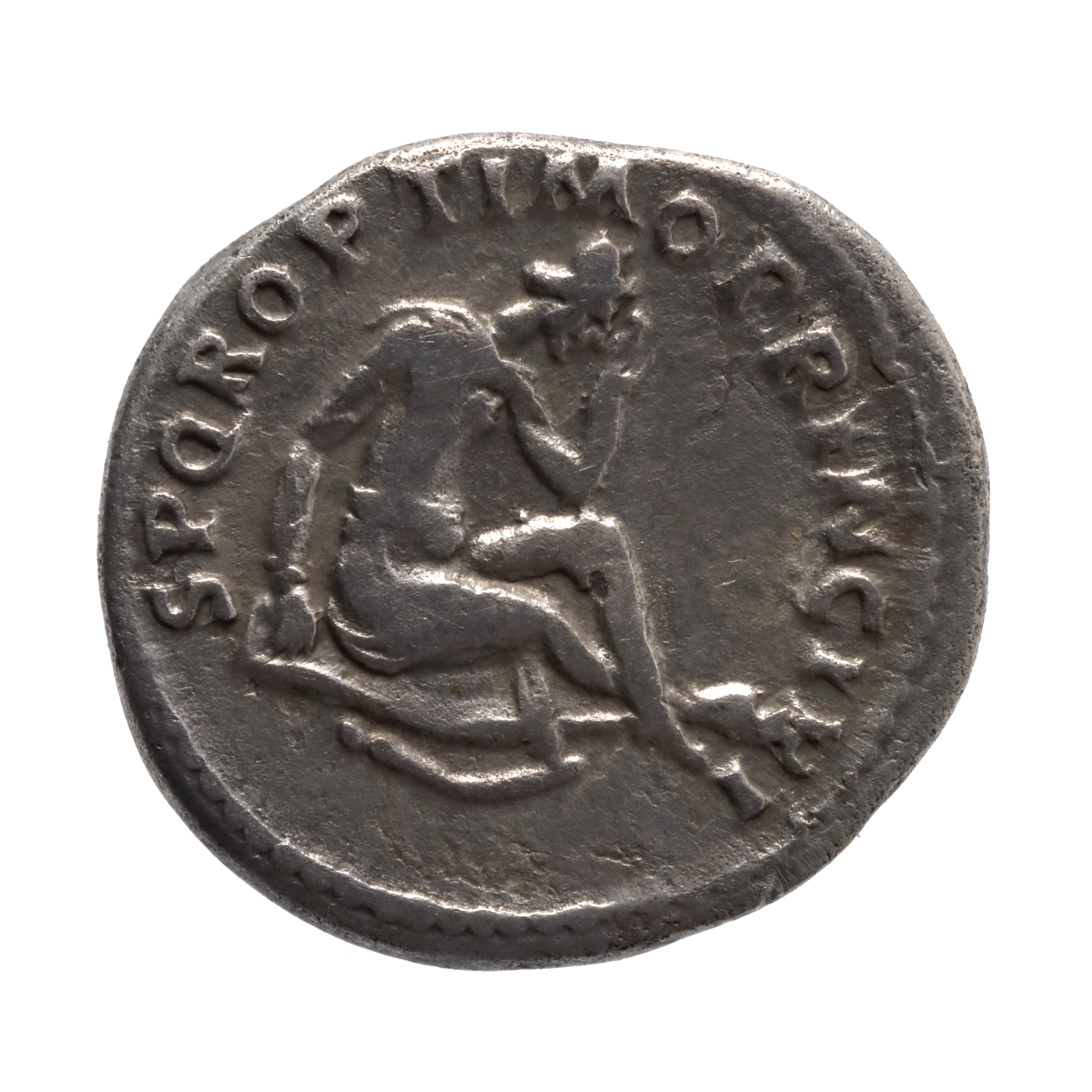 Legendă avers: IMP TRAIANO AVG GER DAC P M TR P COS V P P Legendă revers: SPQR OPTIMO PRINCIPI Pe aversul monedei este reprezentat bustul Împăratului Traian, orientat spre dreapta și cu o cunună de lauri, alături de sintagma abreviată din latină însemnând „Imperator, Caesar, Nervae Traiano Augustus, Germanicus, Dacicus, Pontifex Maximus, Tribunicia Potestate, Consul Quintum, Pater Patriae", în timp ce pe reversul acesteia se regăsește figura unui dac îndurerat, după pierderea bătăliei, lângă un falx dacic și înconjurat de inscripția „Senatus Populusque Romanus Optimo Principi".
