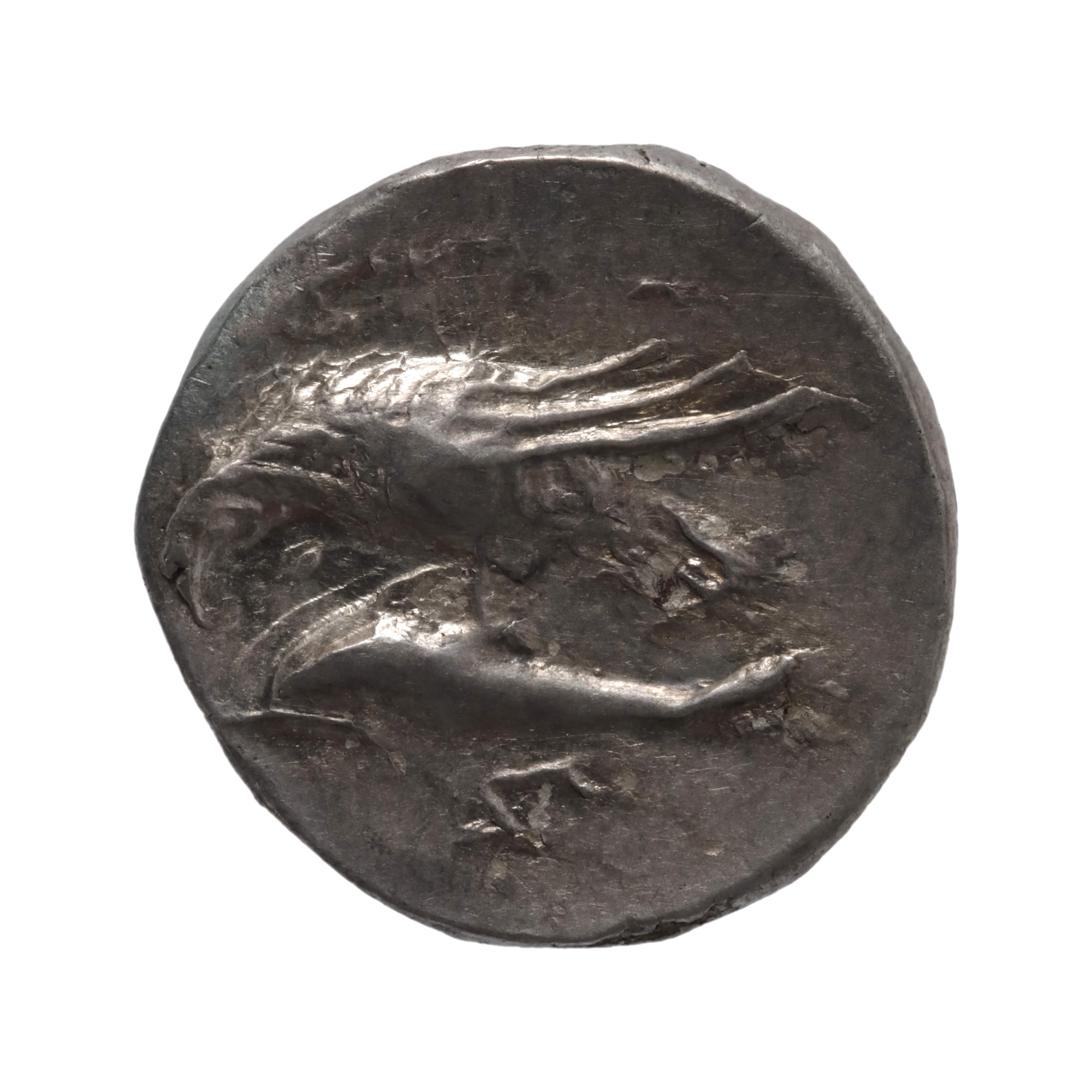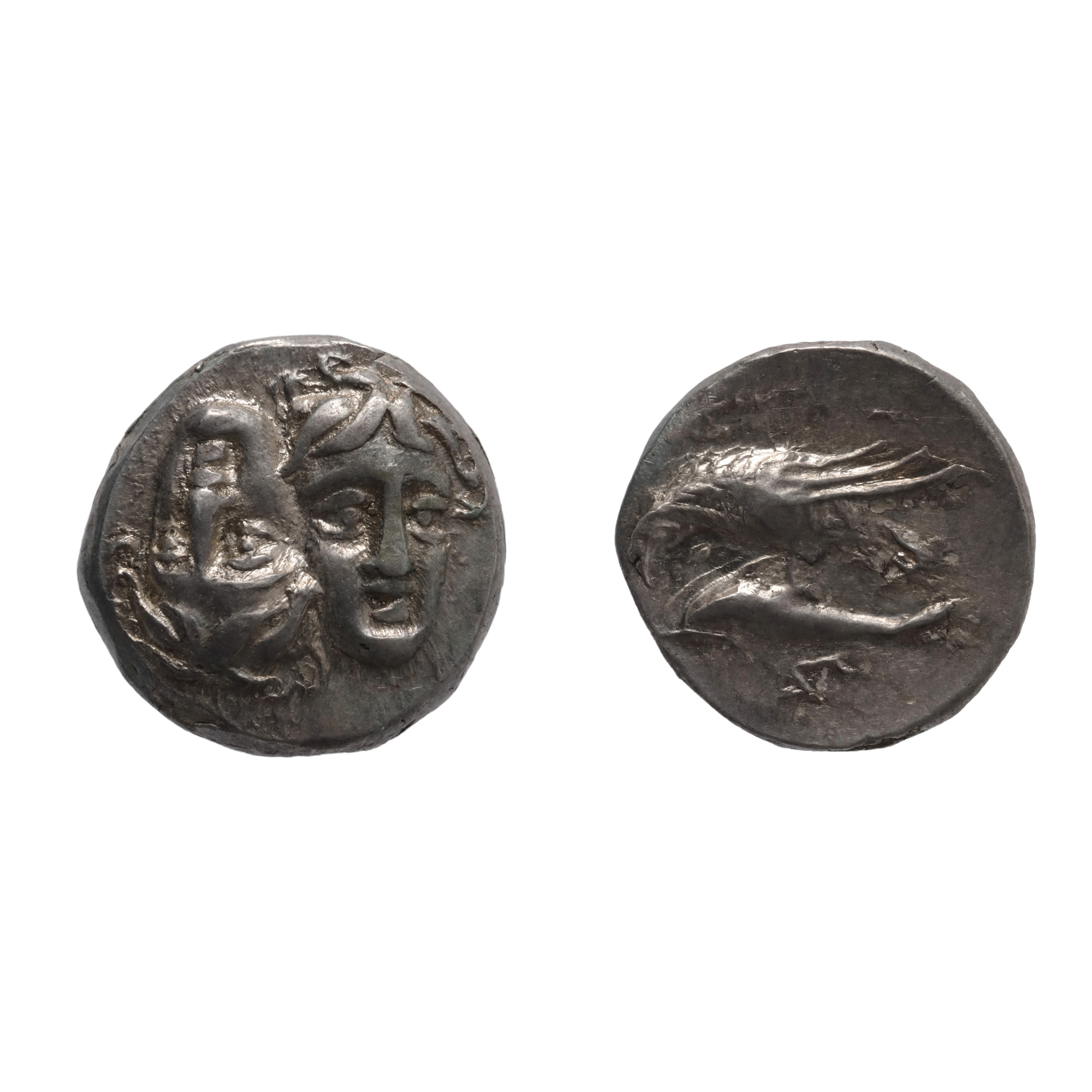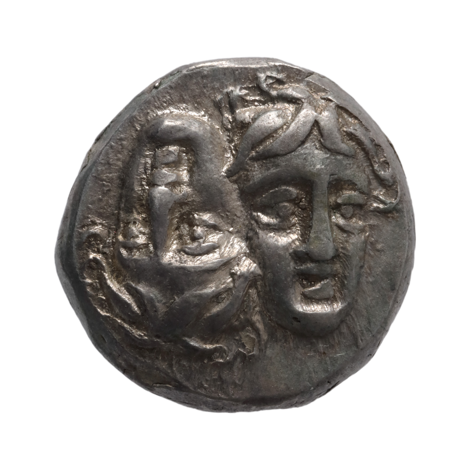 102F. Monedă Drahmă, tip Gemenii - cele două fețe ale Dunării, Histria, 313-280 î.e.n., prima monedă bătută pe teritoriul actual al României, argint