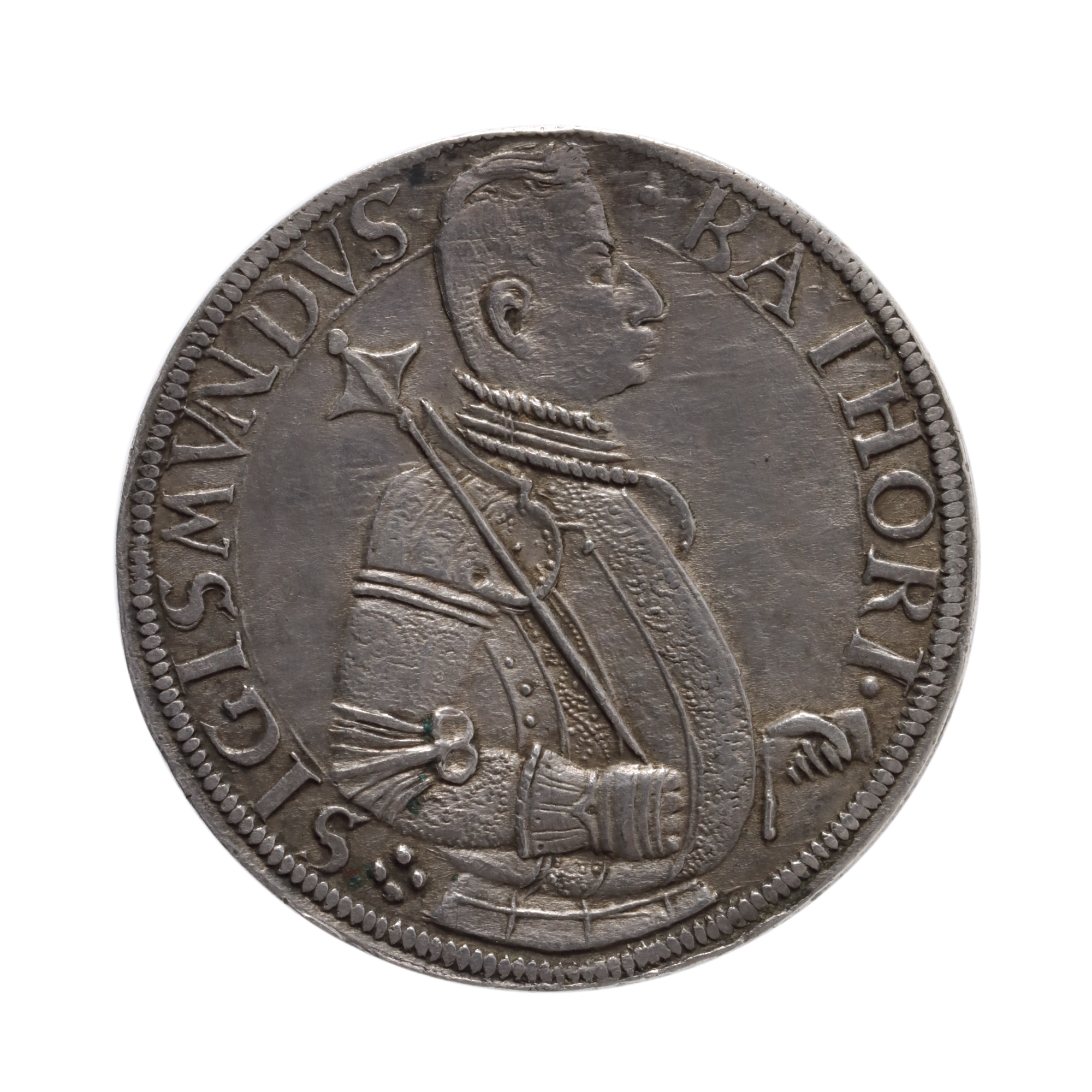 Legendă avers: BATHORI • SIGISMVNDVS, alături de bustul acestuia cu sceptru, orientat spre stânga Legendă revers: PRINCEPS * TRANSSYLVANIA * 1591, alături de stemă În anul baterii talerului îl găsim activ în cadrul monetăriei orașului Baia Mare pe celebrul Johannes Banfi Hunyades (1576-1646), argintar, chimist, alchimist și profesor la Colegiul Gresham din Londra.