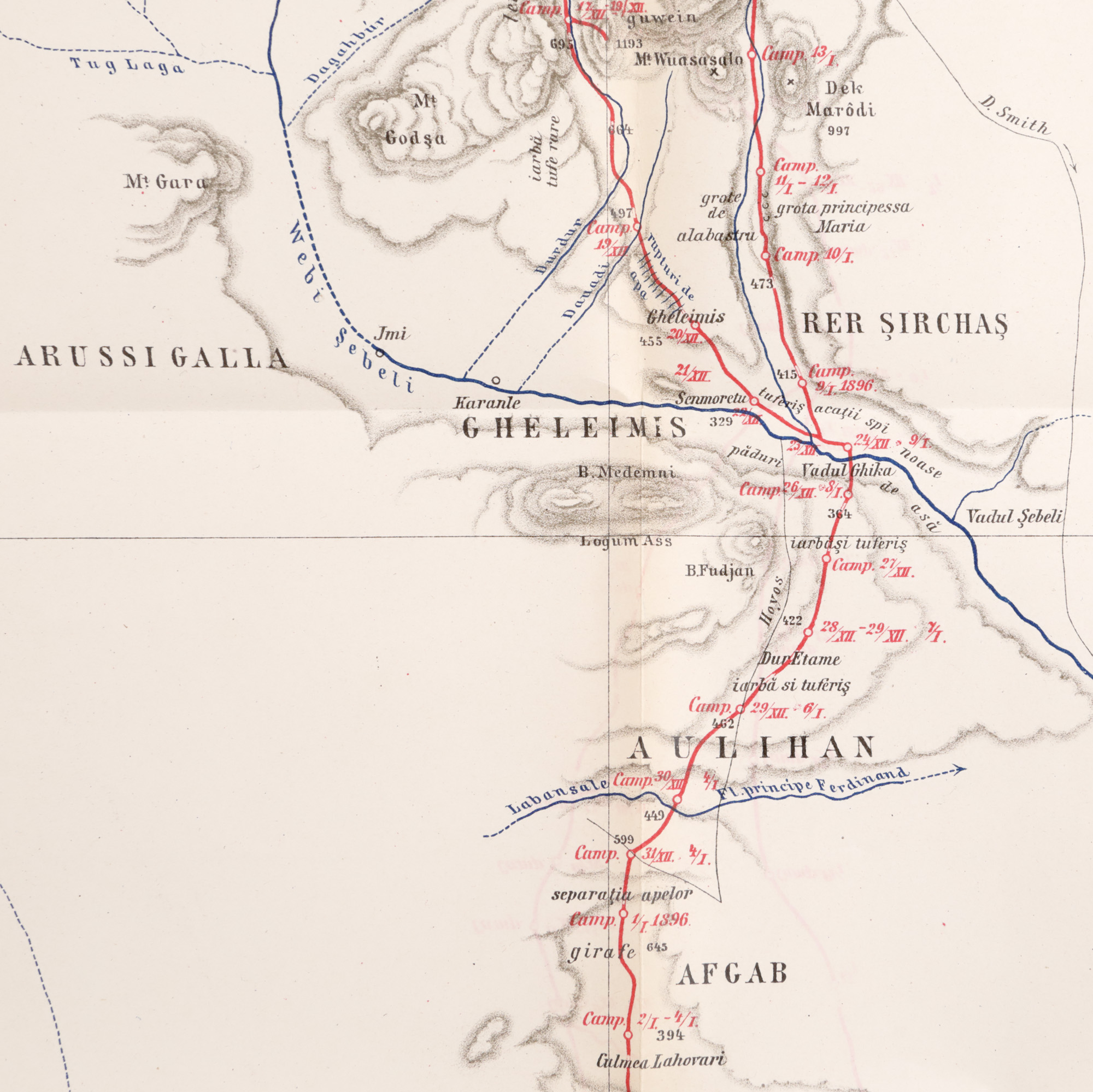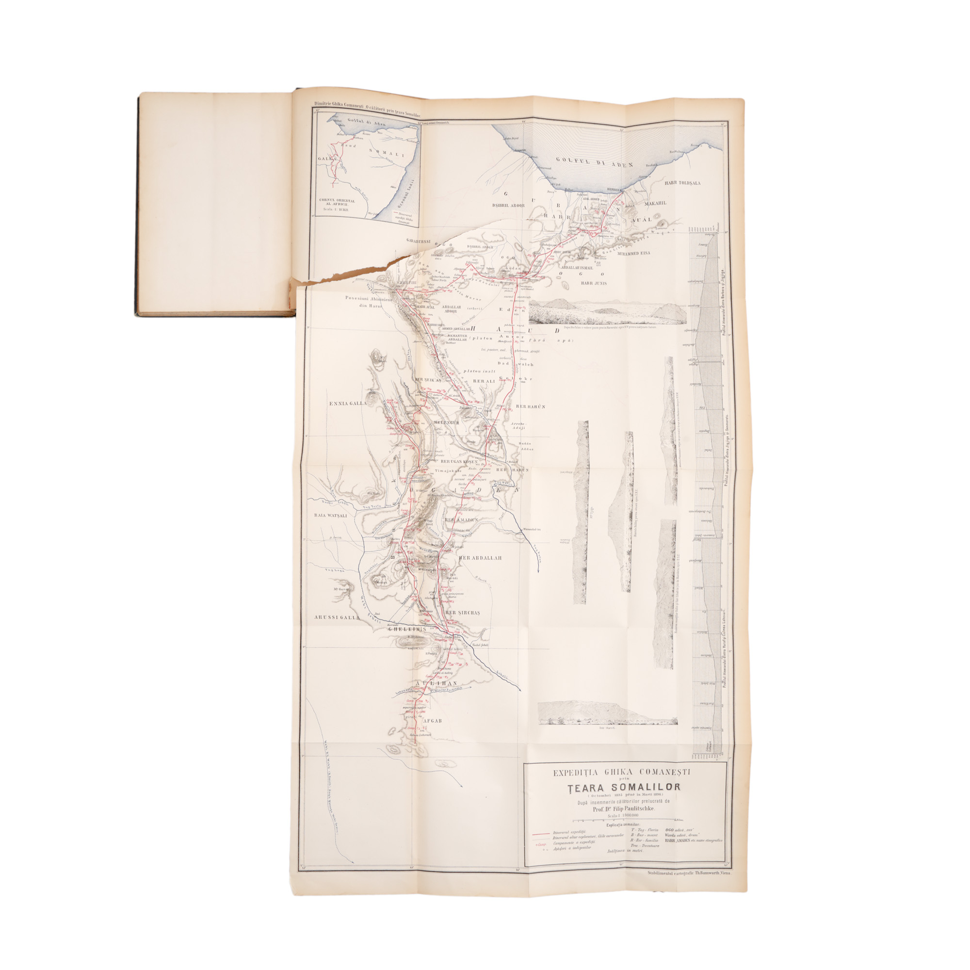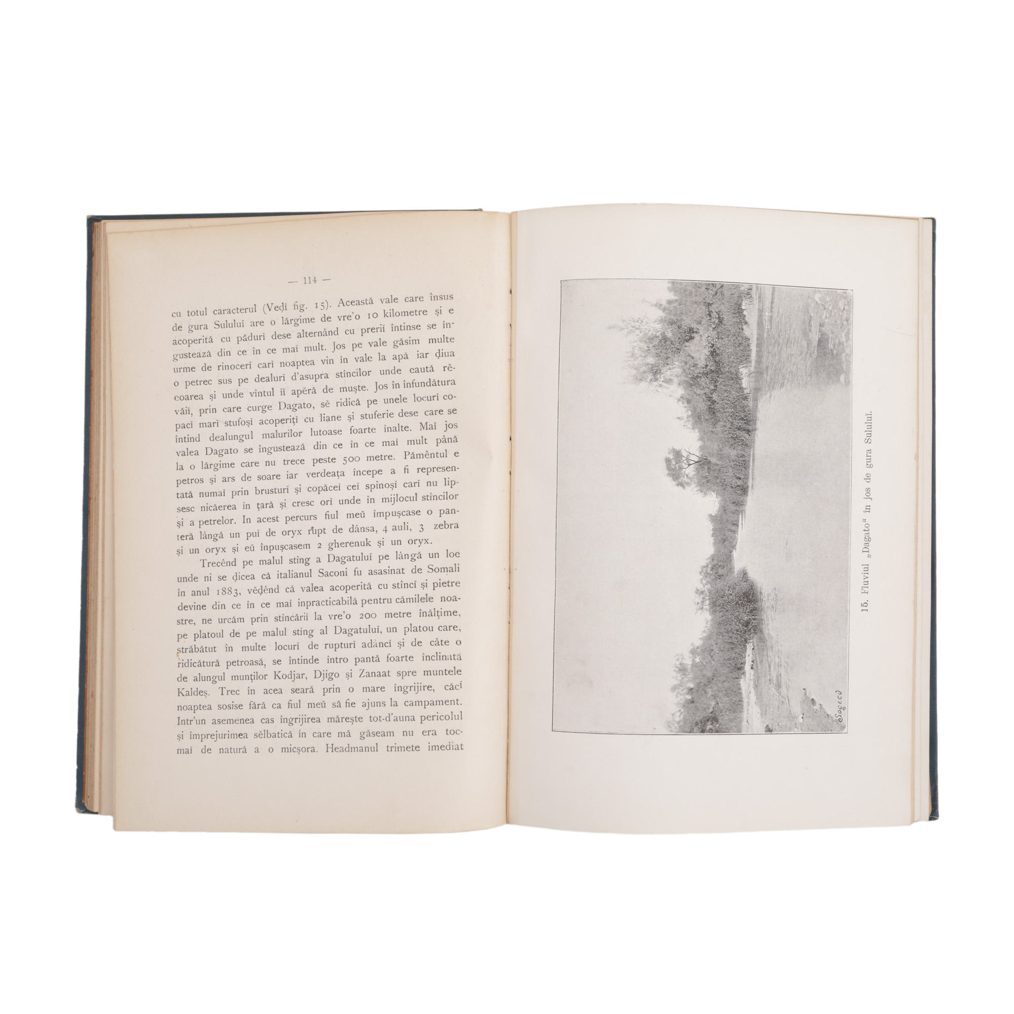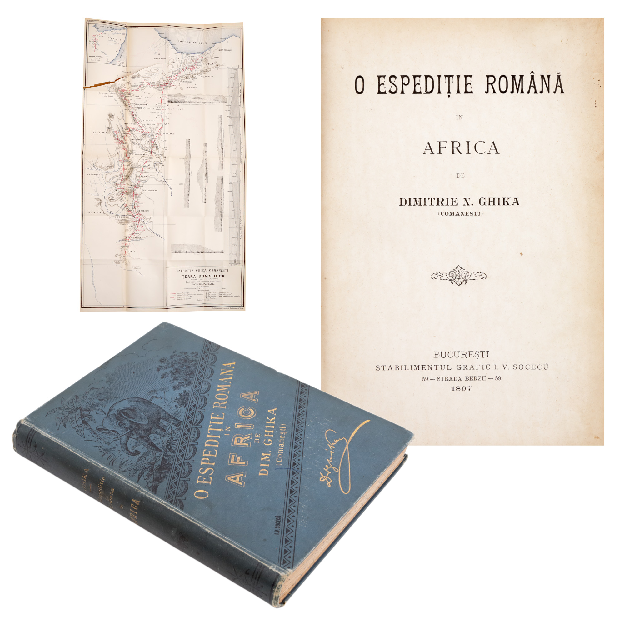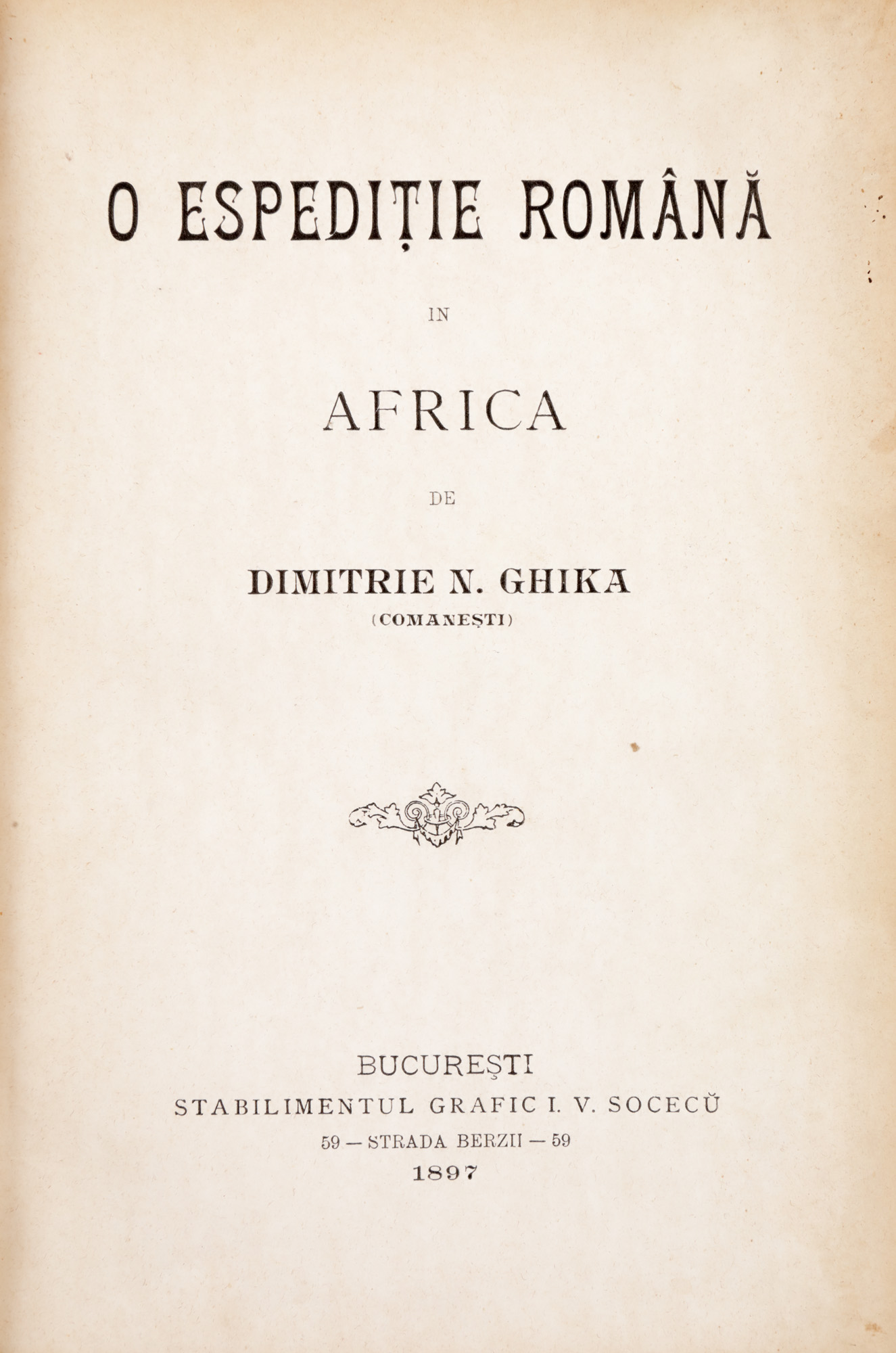 Dimitrie Ghica Comânești (1839-1923) deși a studiat Dreptul, a rămas în posteritate datorită eforturilor lui de explorator al Africii. El, alături de fiul său Nicolae, a întreprins o călătorie de explorare sistematică a cornului oriental al Africii (Somalia și Etipia). După întoarcerea acasă a publicat această lucrare în două ediții, una la Paris, cealaltă la București. Opera i-a adus o recunoaștere unanimă și i-a asigurat o celebritate europeană. Exemplarul face parte din ediția românească, apărută la editura Socec din București în 1897 într-o variantă elegantă. Coperțile sunt cele originale din pergamoid. În interior se află numeroase ilustrații fotografice realizate în timpul expediției de autor, precum și o hartă a traseului urmat.