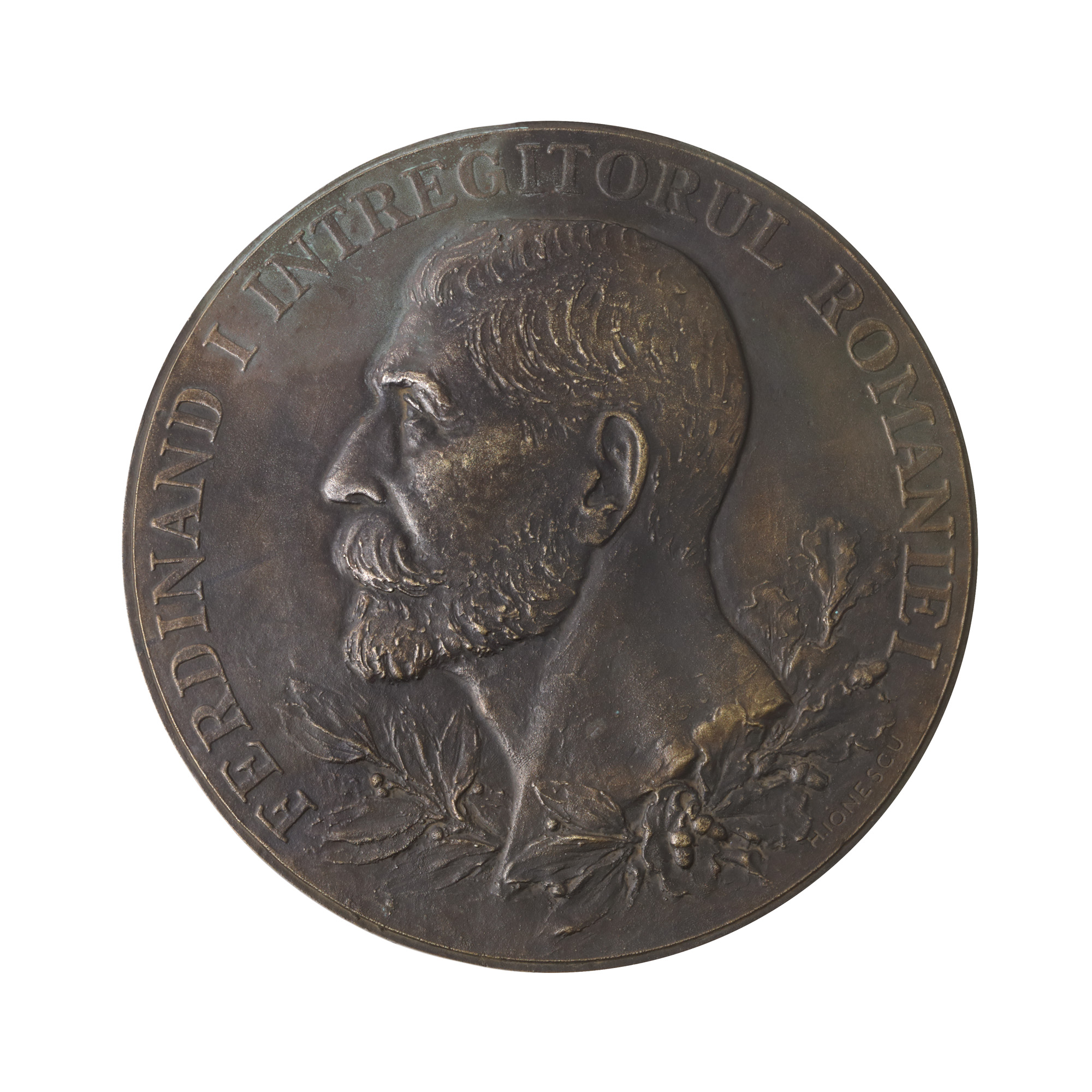 222. Plachetă de mari dimensiuni ilustrându-l pe Regele Ferdinand, gravor Haralamb Ionescu, cca. 1935