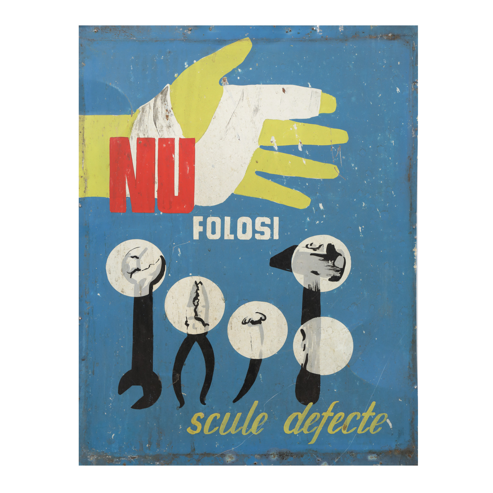 243. Plachetă metalică, de protecția muncii, "Nu folosi scule defecte", perioada comunistă