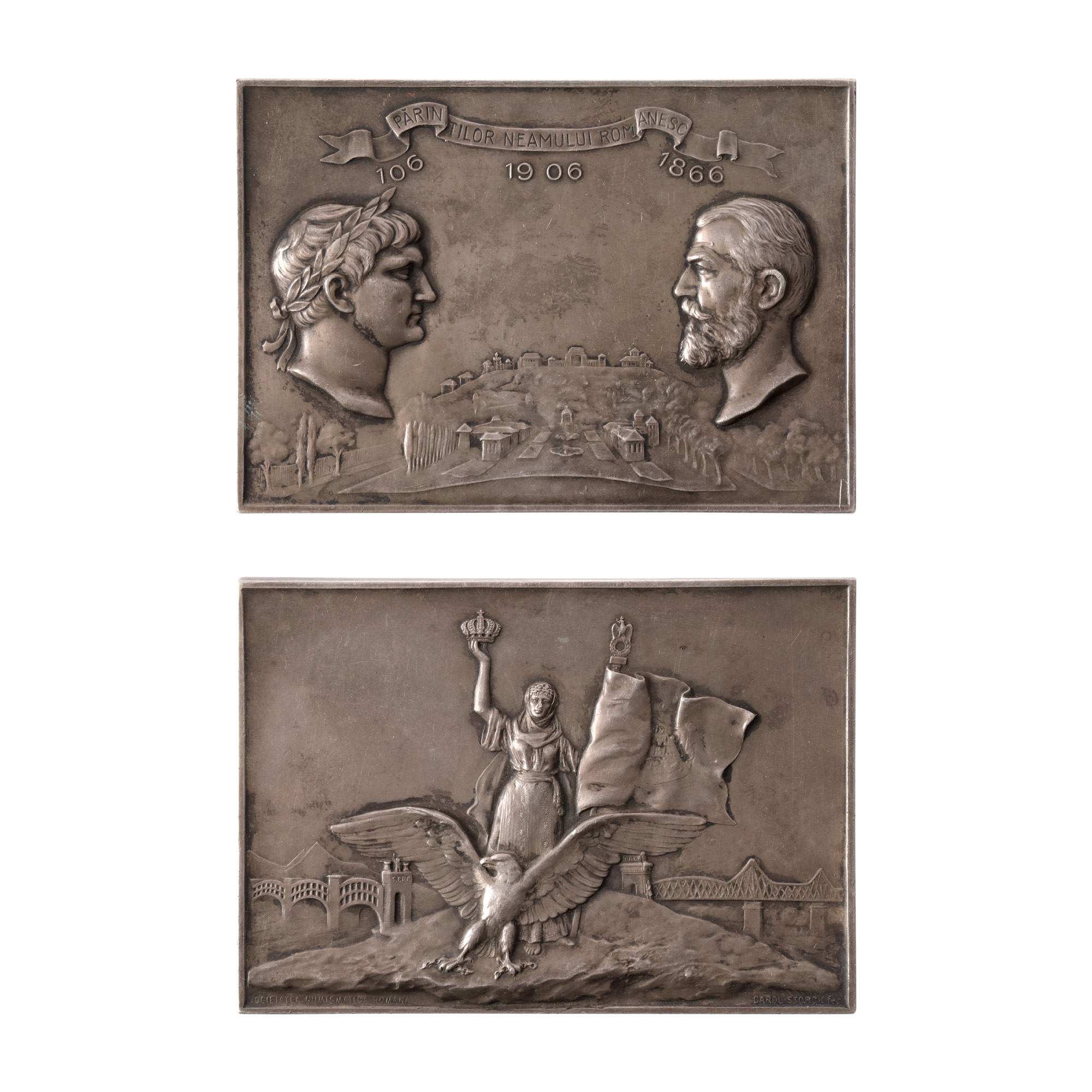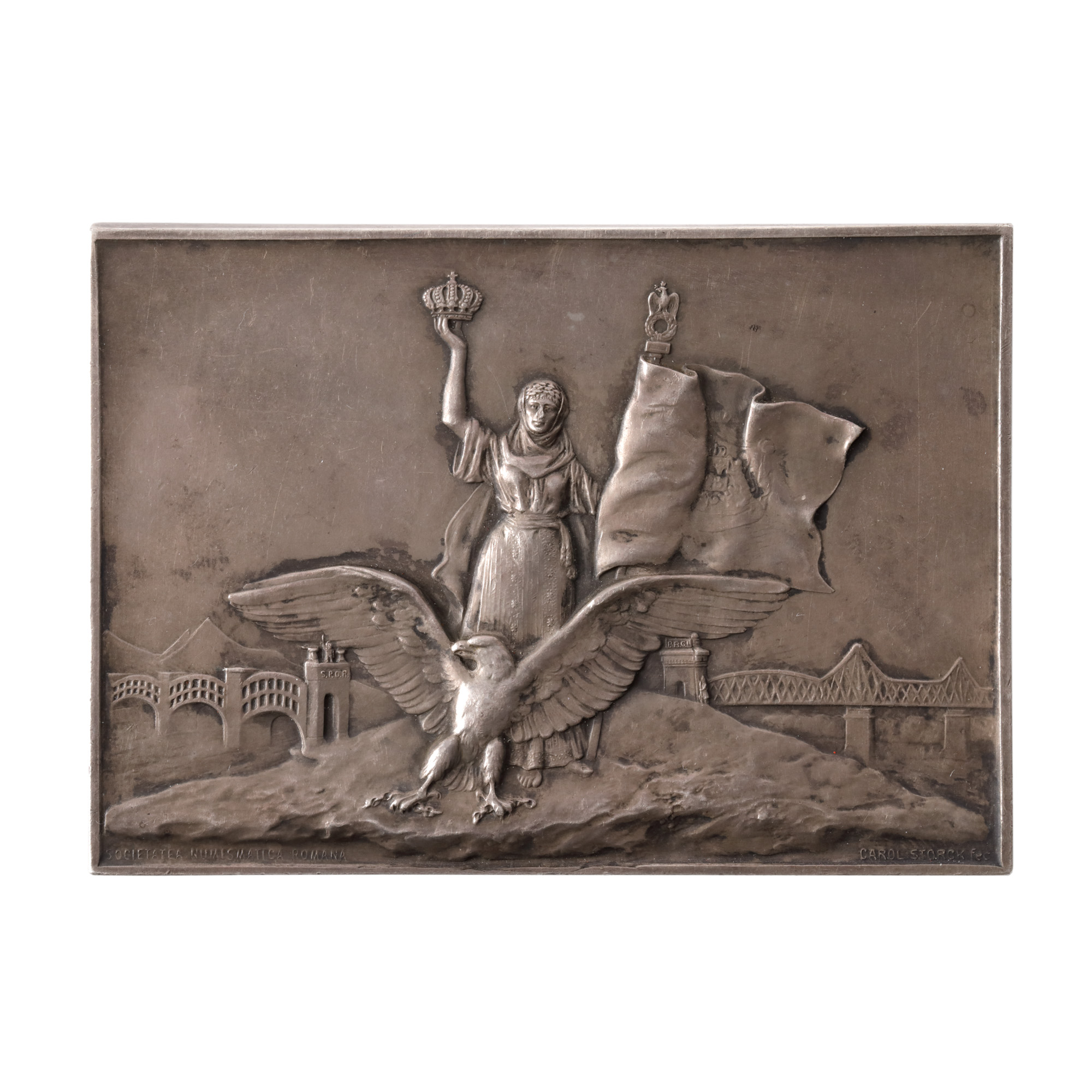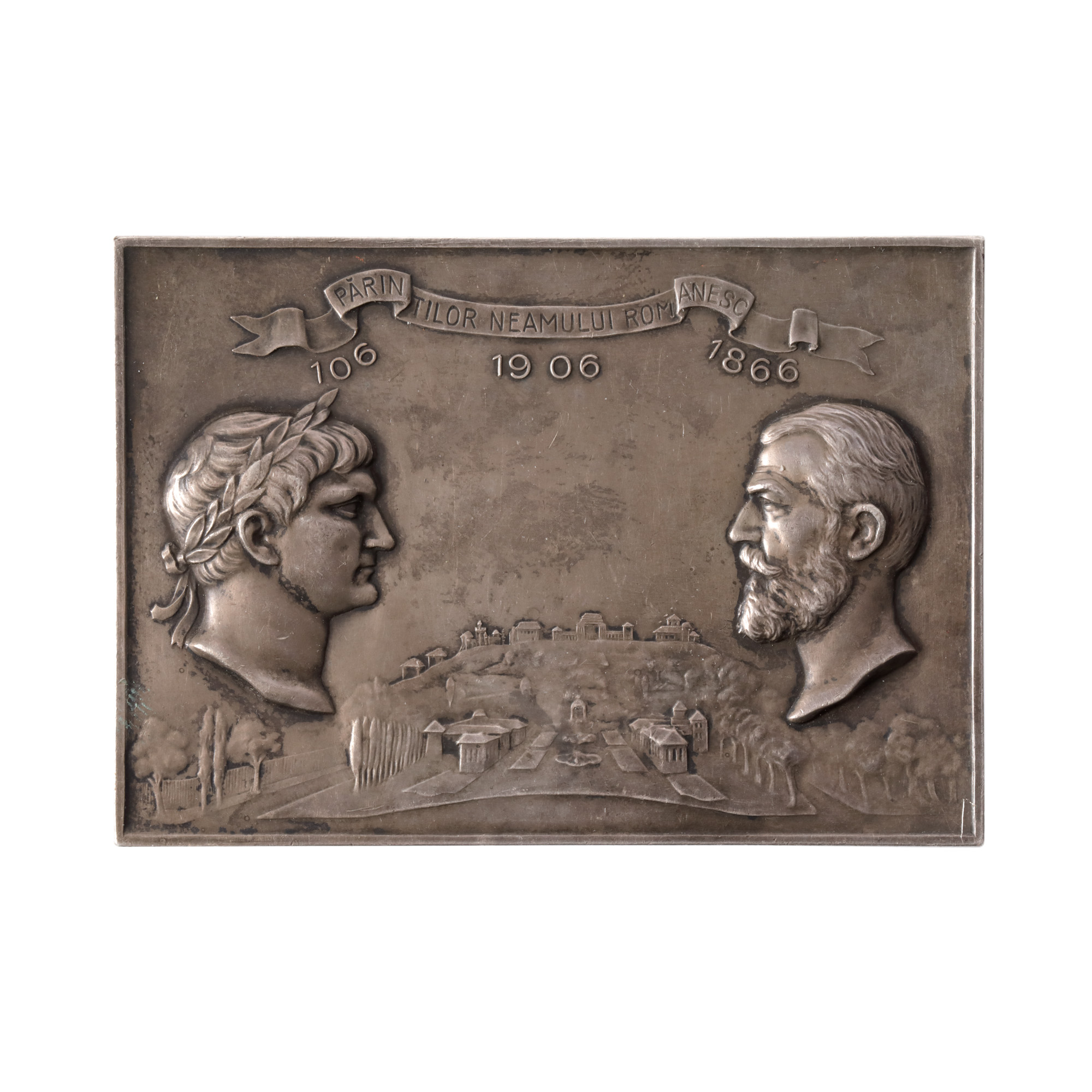 Placheta a fost bătută cu ocazia Expoziției jubiliare din 1906 de la București care trebuia să celebreze realizările României în timpul celor 40 de ani de domnie ai regelui Carol I. Pe avers domină portretele împăratului Traian și al regelui Carol I. Pe revers este figurată în plan central națiunea română sub forma unei figuri feminine care este flancată de podul lui Apolodor din Damasc și podul de la Cernavodă realizat de Anghel Saligny, inaugurat în 1895. La baza piesei se află o acvilă cu aripile desfășurate, simbol al puterii și curajului națiunii române. Placheta era realizată de către Societatea Numismatică Română în semn de respect față de persoana regelui. Exemplarul se păstrează într-o bună stare de conservare.