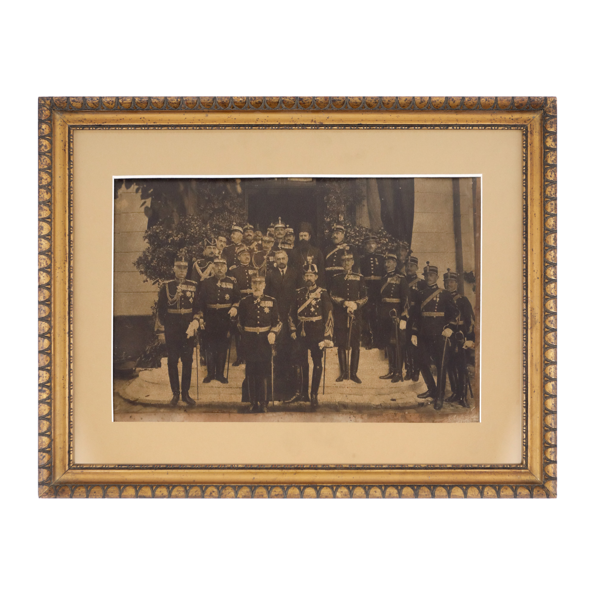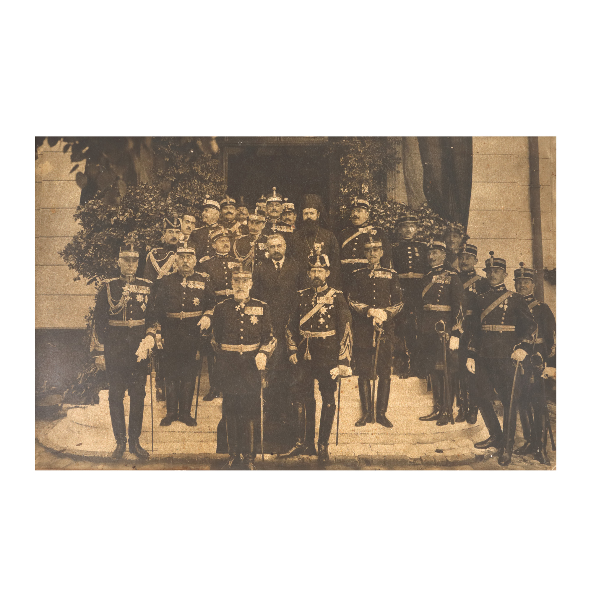 Regele Carol I apare alături de prințul moștenitor al tronului Ferdinand și primul ministru Ion I. C. Brătianu. Ei sunt înconjurați de mai mulți generali și ofițeri superiori în uniforme de mare ținută. Brătianu fusese numit de rege prim ministru în ianuarie 1914 și tot el condusese guvernul care a decis intrarea României în Primul Război Mondial.