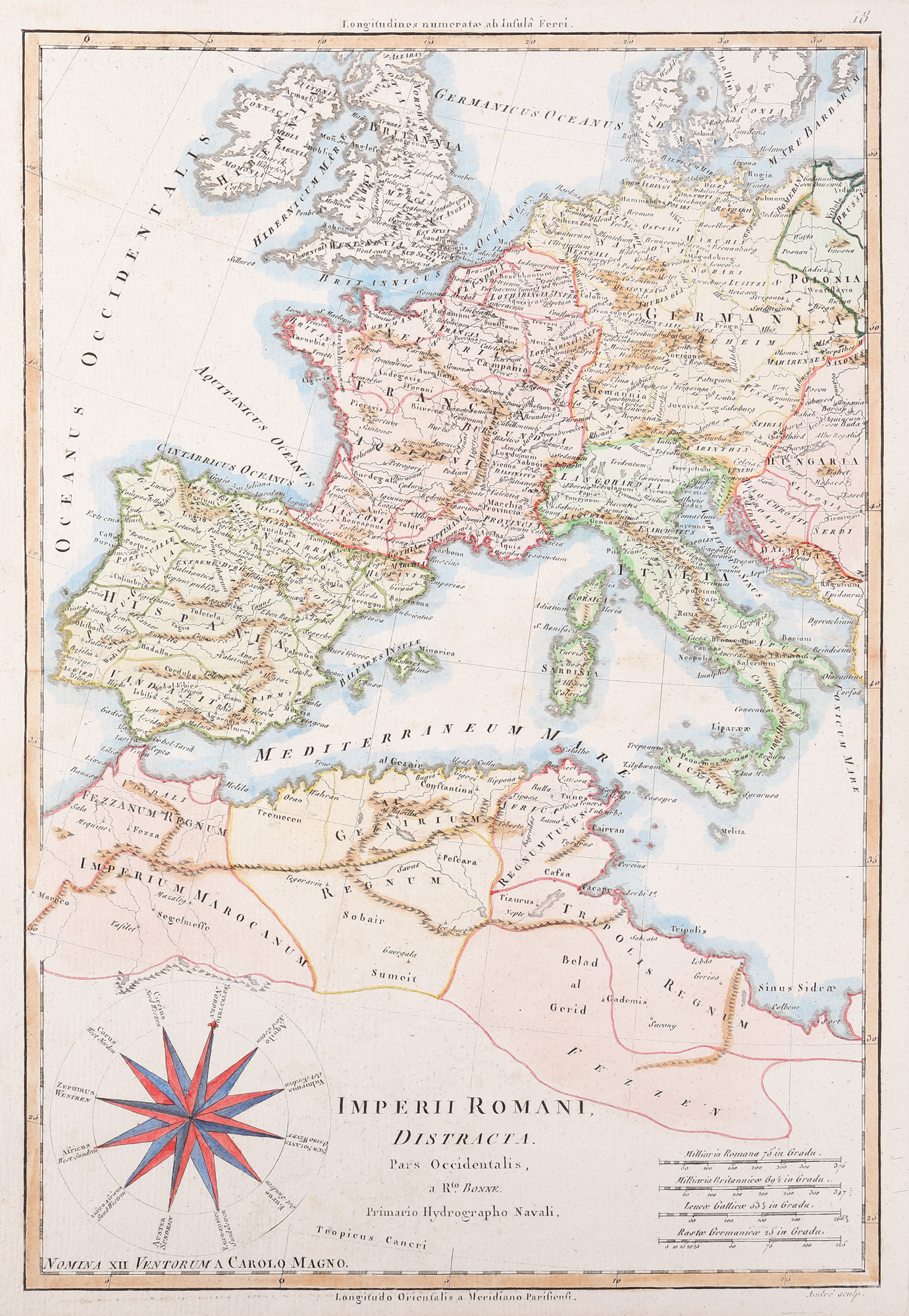 Cartograful francez Rigobert Bonne (1727-1794) publica la Paris în 1788 o foarte cunoscută lucrare, "Atlasul Enciclopedic", din care face parte și piesa de față. Harta înfățișează posesiunile Imperiului Roman din Europa și nordul Africii în perioada maximei expansiuni romane în aceste regiuni.
