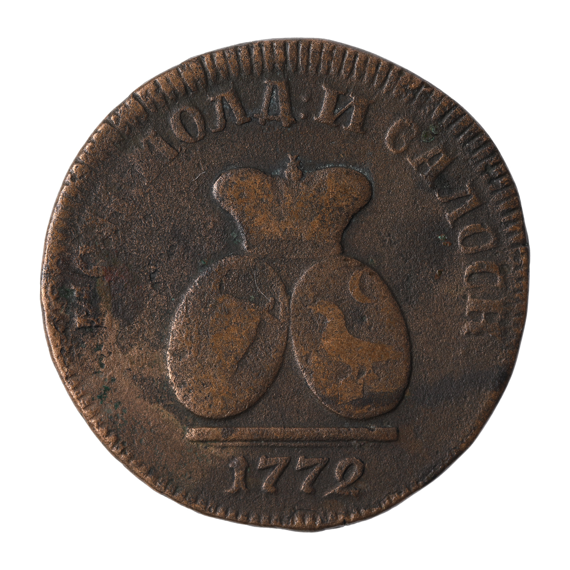 Avers: Două scuturi ovale înclinate unul spre celălalt, înconjurate de ghirlandele de trandafiri, în cel din stânga capul de bour al Moldovei, în cel din dreapta acvila Munteniei având Crucea cu două braţe în cioc, alături de o lună, iar pe linia solului, o coroană, deasupra scuturilor coroana domnească, în exergă linie orizontală şi anul 1773 / 1772, în partea de sus inscripţia semicirculară în limba rusă „MON. MOLD: I VALOSK." și cerc zimţat exterior cu o muchie ornamentată. Revers: Inscripţia cu litere chirilice „2 PARA (PARA subliniat cu una sau două linii apropiate) 3 KOPIEKI" într-un pătrat cu laturile torsadate și cerc zimţat exterior sau „1 PARA / 3 DINGHI". În timpul războiului ruso-turc (1768-1774), încheiat prin pacea de la Kuciuk-Kainargi, mareşalul P.A. Rumeanţev - comandantul trupelor de ocupaţie ruseşti în Moldova şi Ţara Românească - a luat măsuri de organizare pe linie economică şi fiscală cu care ocazie au apărut pentru prima oară monede comune ambelor Principate, denumite de numismaţi monede Sadagura. Monedele au fost bătute la Sadagura, lângă Cernăuţi, în monetăria înfiinţată acolo de aventurierul baron Nicolae Gartenberg (Sadogurschi). Ele urmau să aibă exprimată valoarea nominală atât în valută turcă, precum şi în cea rusească. Iniţial, în 1771 s-au executat o serie de probe monetare, cu cifrul împărătesei Ecaterina II, după care s-a ajuns la tipul oficial aprobat, purtând numai stemele celor două principate.