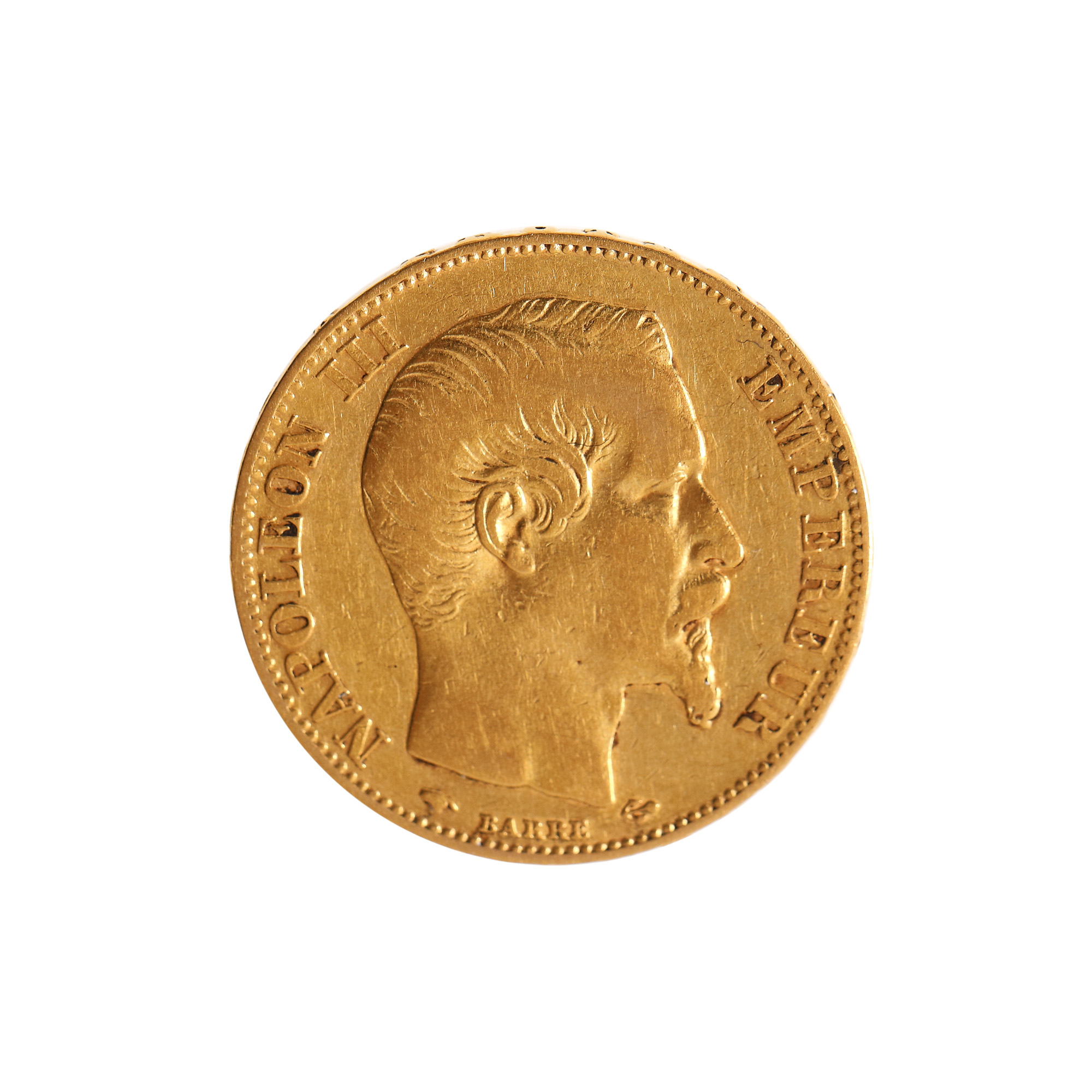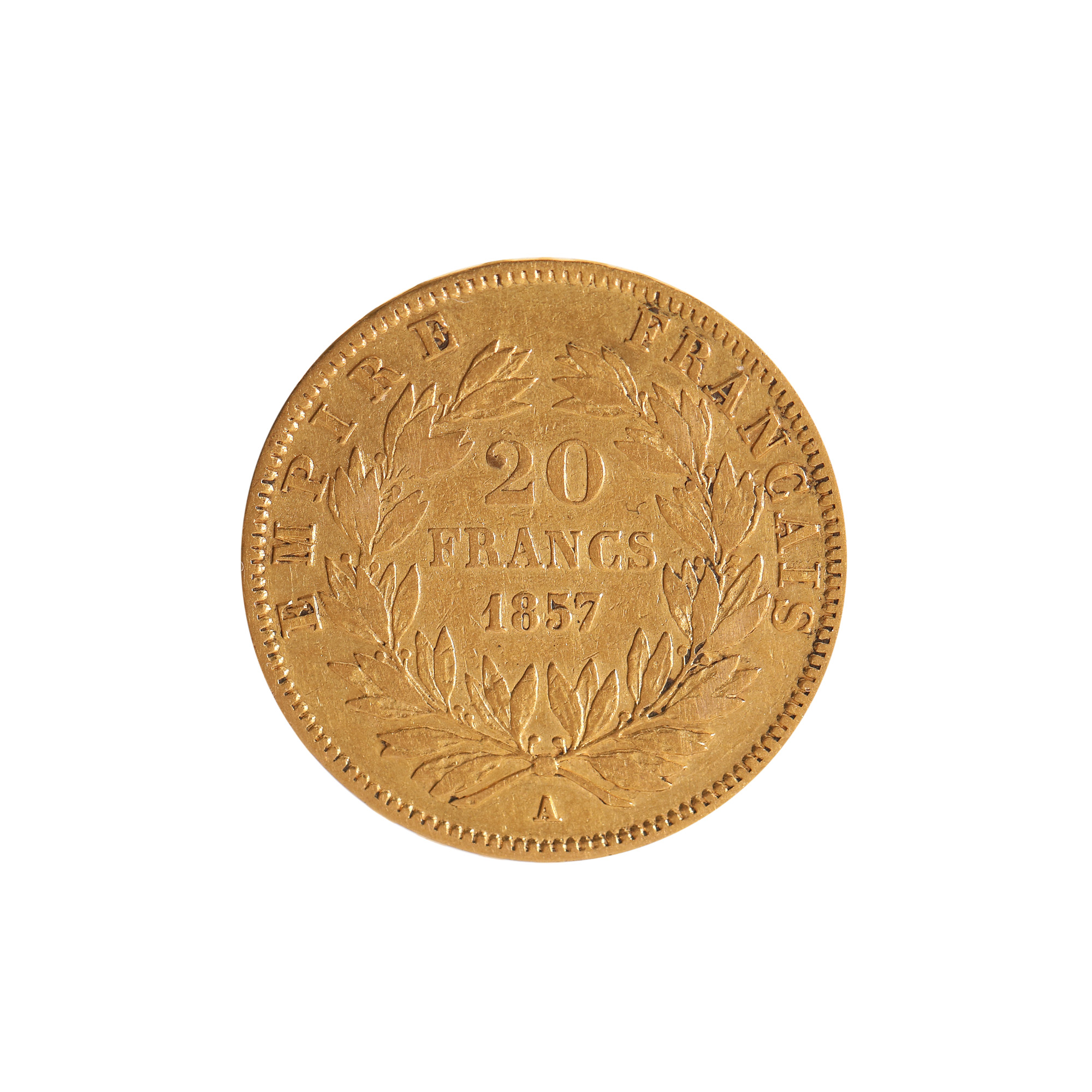 74. Monedă din aur, 20 franci, 1857, cu efigia împăratului Napoleon III, Franța
