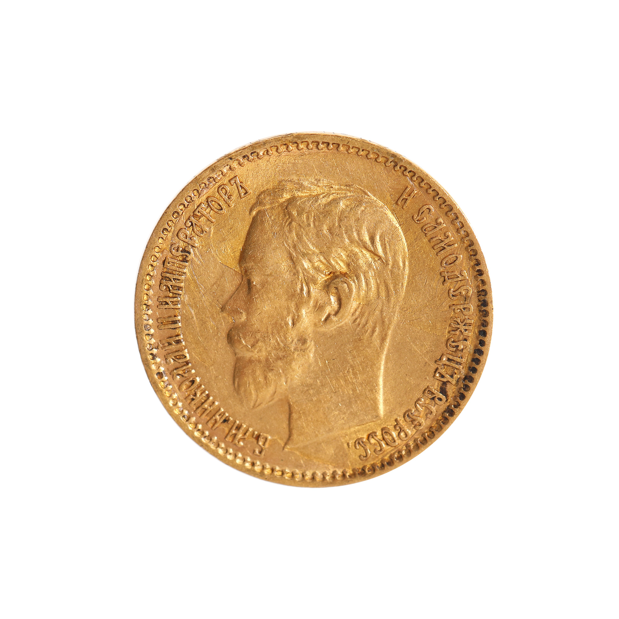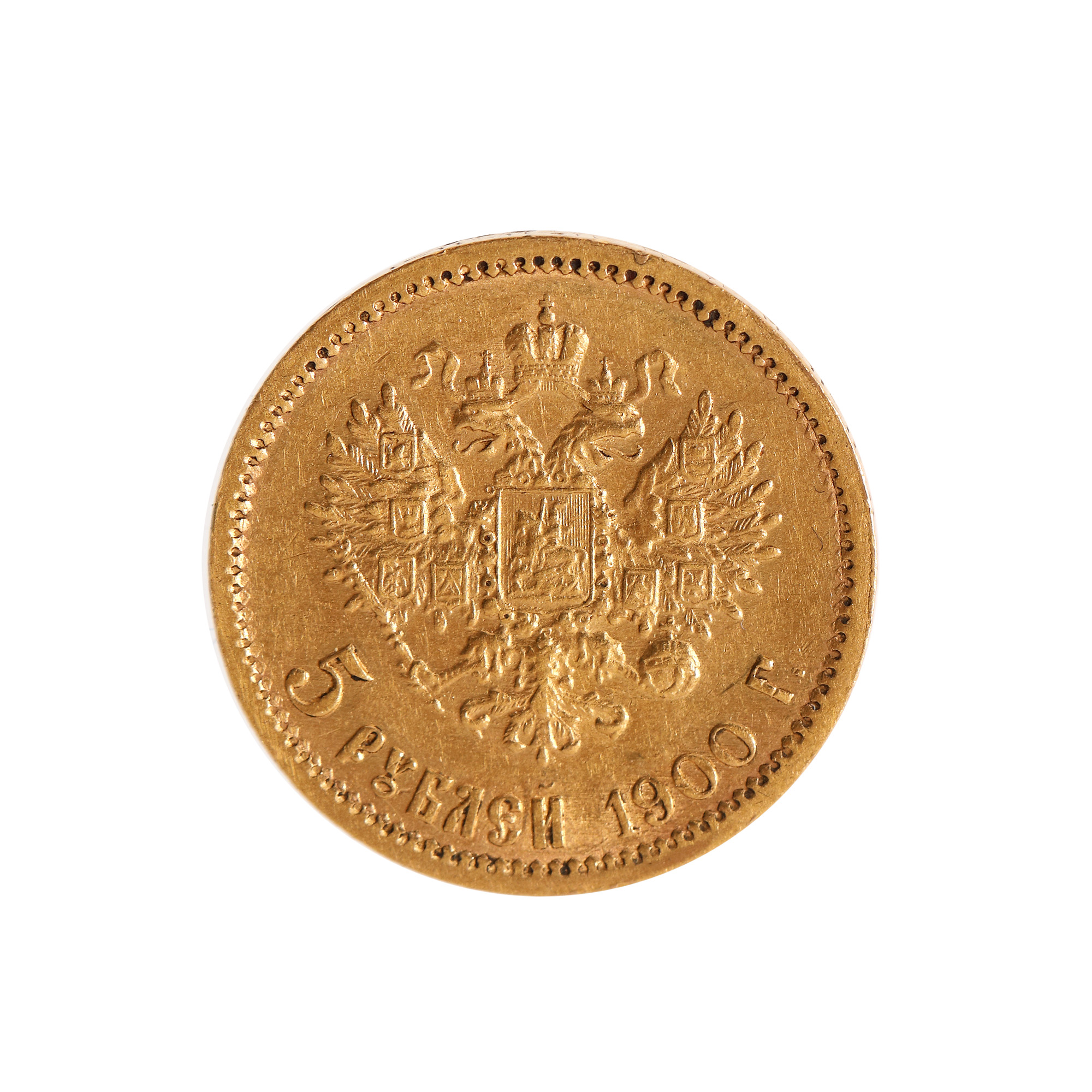 64. Monedă din aur, 5 ruble, 1900, cu efigia împăratului Nicolae II, Rusia