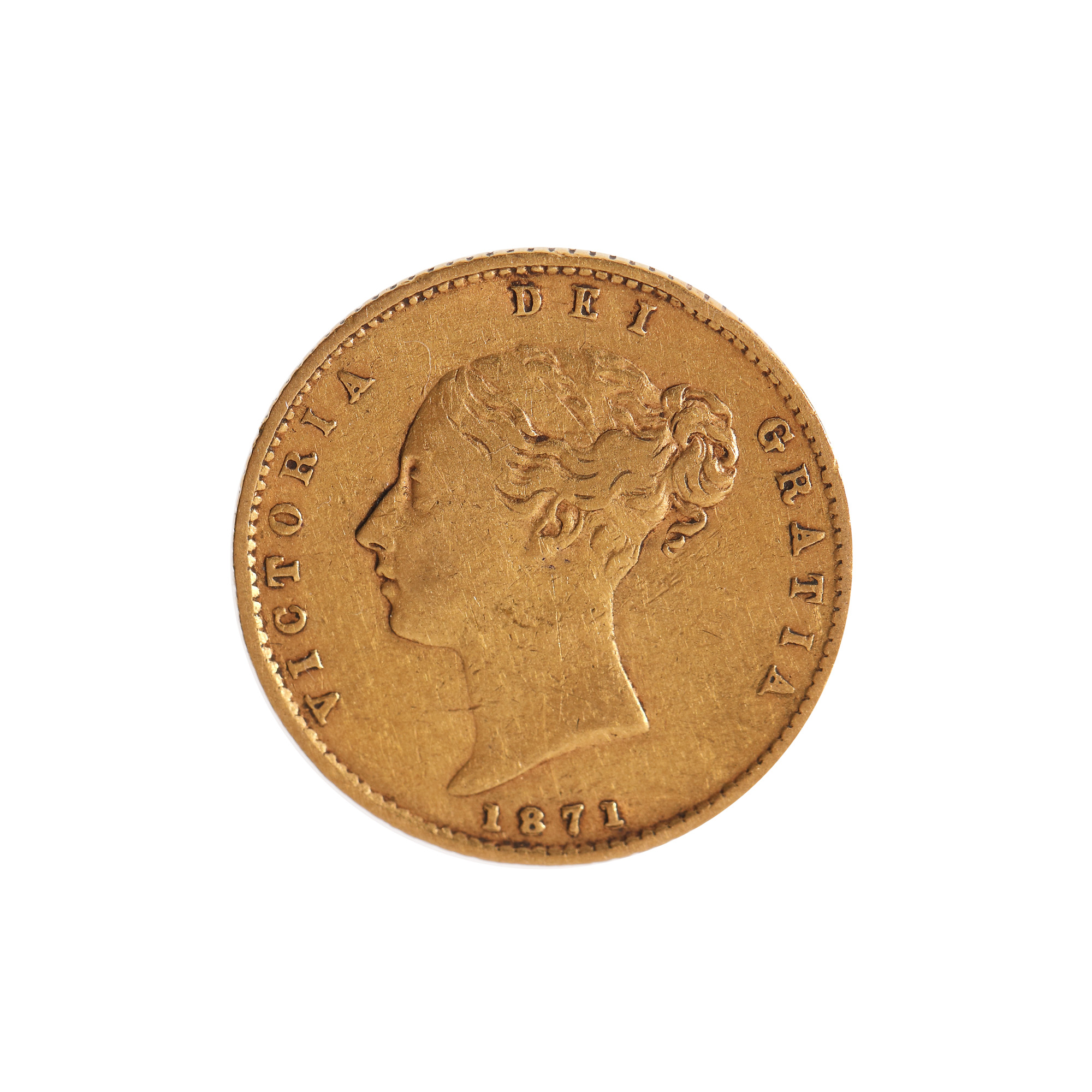 65. Monedă din aur, jumătate de sovereign, 1871, cu efigia reginei Victoria, Marea Britanie