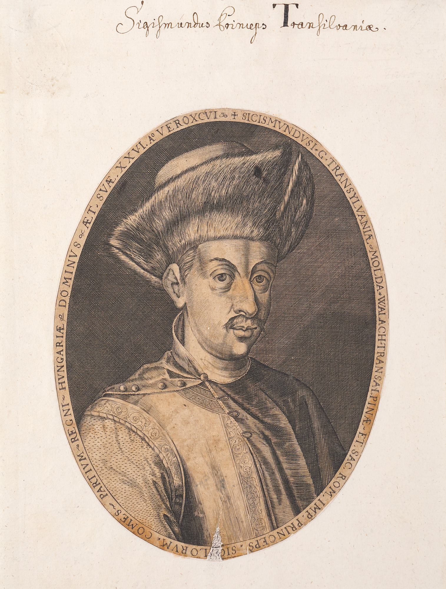 Figura principelui transilvănean Sigismund Báthory a rămas în imaginarul colectiv în primul rând datorită legăturilor sale cu voievodul Țării Românești Mihai Viteazul. El a condus Transilvania în mai multe rânduri între 1586 și 1602. Din punct de vedere politic a oscilat între Imperiul Otoman și Imperiul Habsburgic, alăturându-se în final Ligii Sfinte și căsătorindu-se cu una din nepoatele împăratului Rudolf al II-lea, Maria Cristina de Austria. În contextul aproprierii sale de politica habsburgică erau tipărite mai multe gravuri de propagandă cu portretul său, printre care și aceasta realizată în 1596 probabil într-un atelier austriac după un original de gravorul german Hans von Aachen (1552-1616).