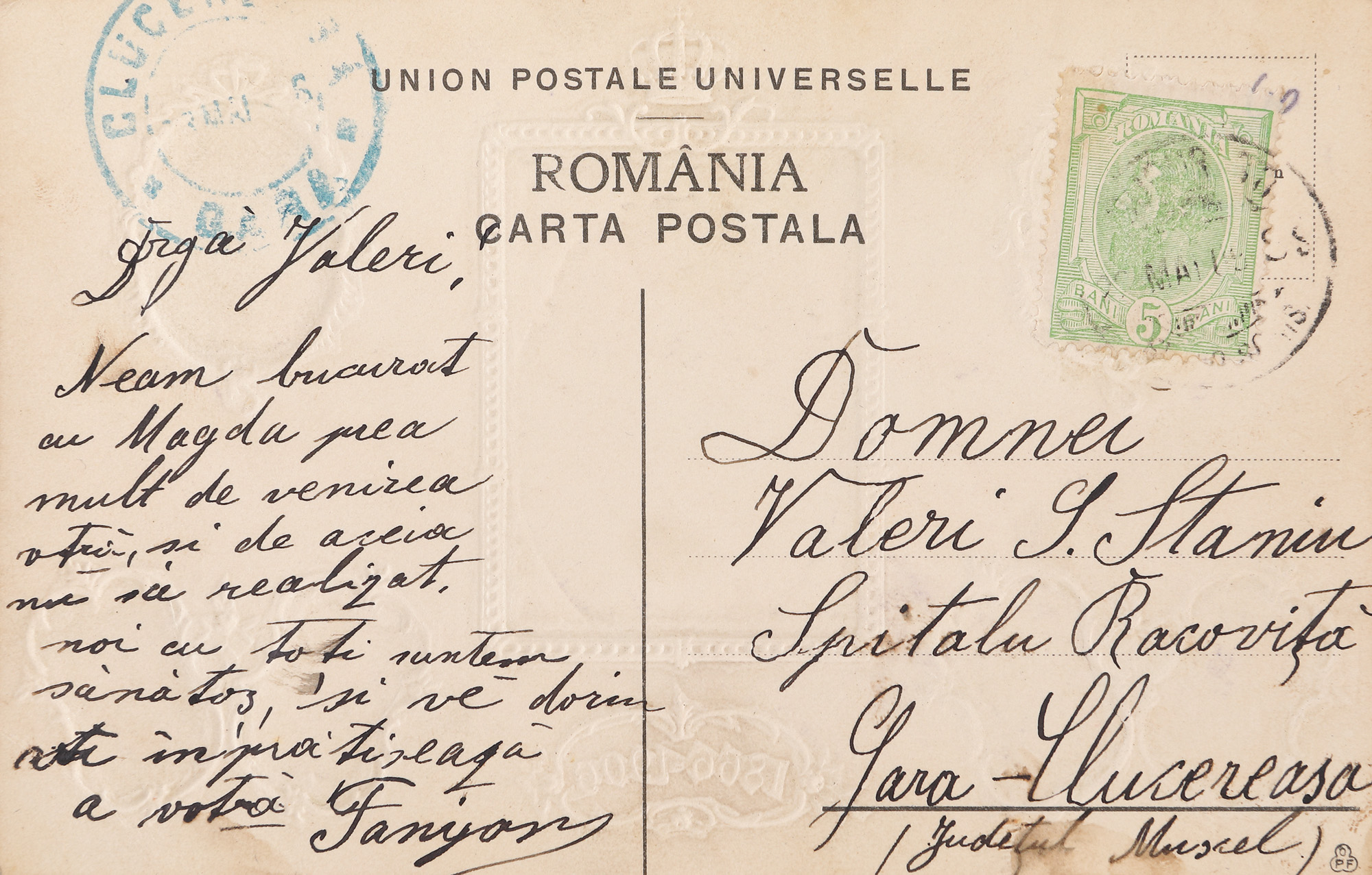 Cartea poștală era tipărită cu ocazia deschiderii Expoziției Jubiliare din parcul Carol în 1906 și este ilustrată cu portretele membrilor familiei regale a României. De asemenea, piesa este circulată pe ruta București-Clucereasa, județul Muscel și conține o rară ștampilă poștală, aceea a oficiului poștal al gării Clucereasa.