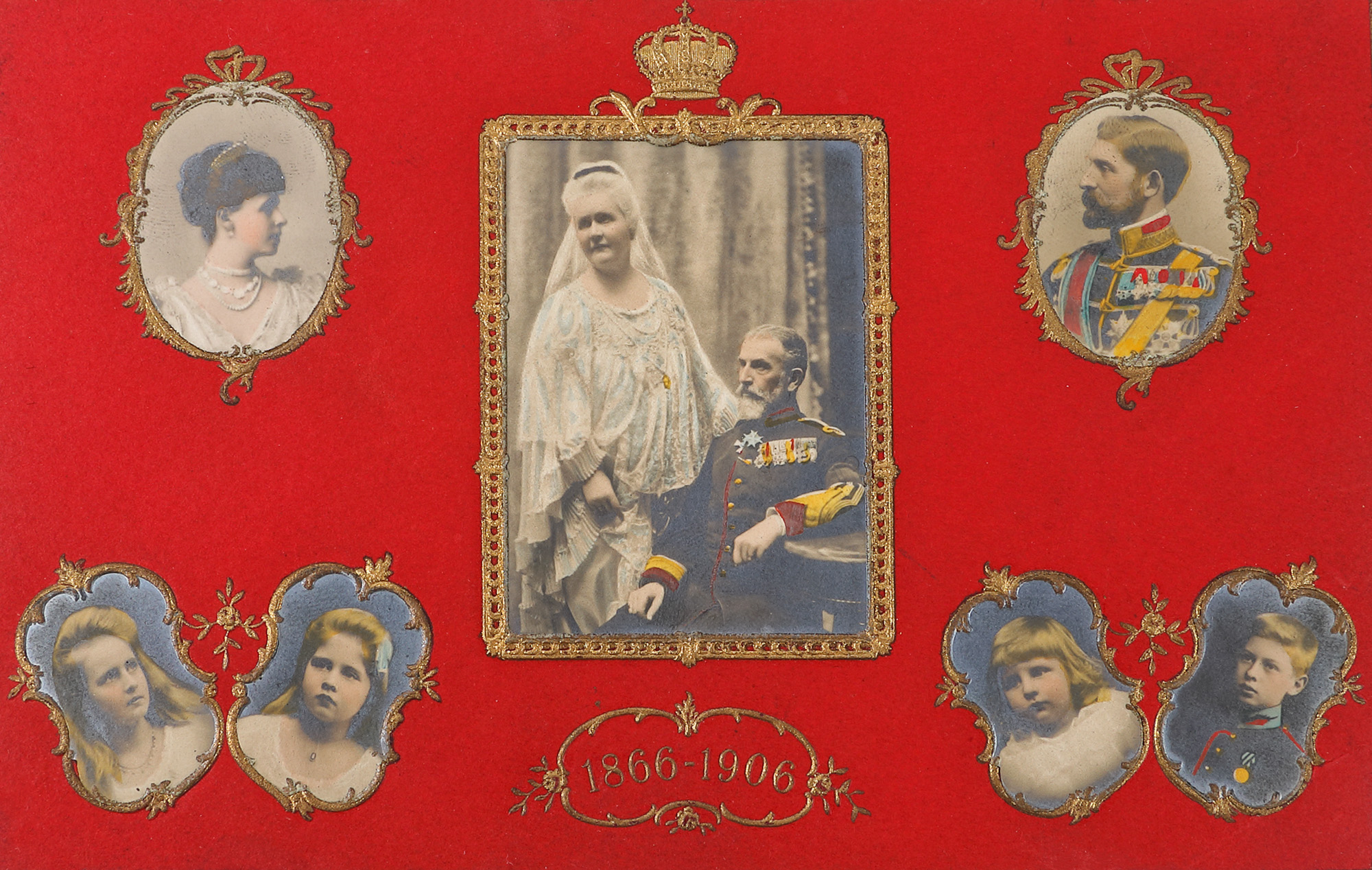 277. Carte poștală ”Jubileu de 40 de ani”, ilustrându-i pe membri familiei regale române, București, 1906, cu o rară ștampilă poștală