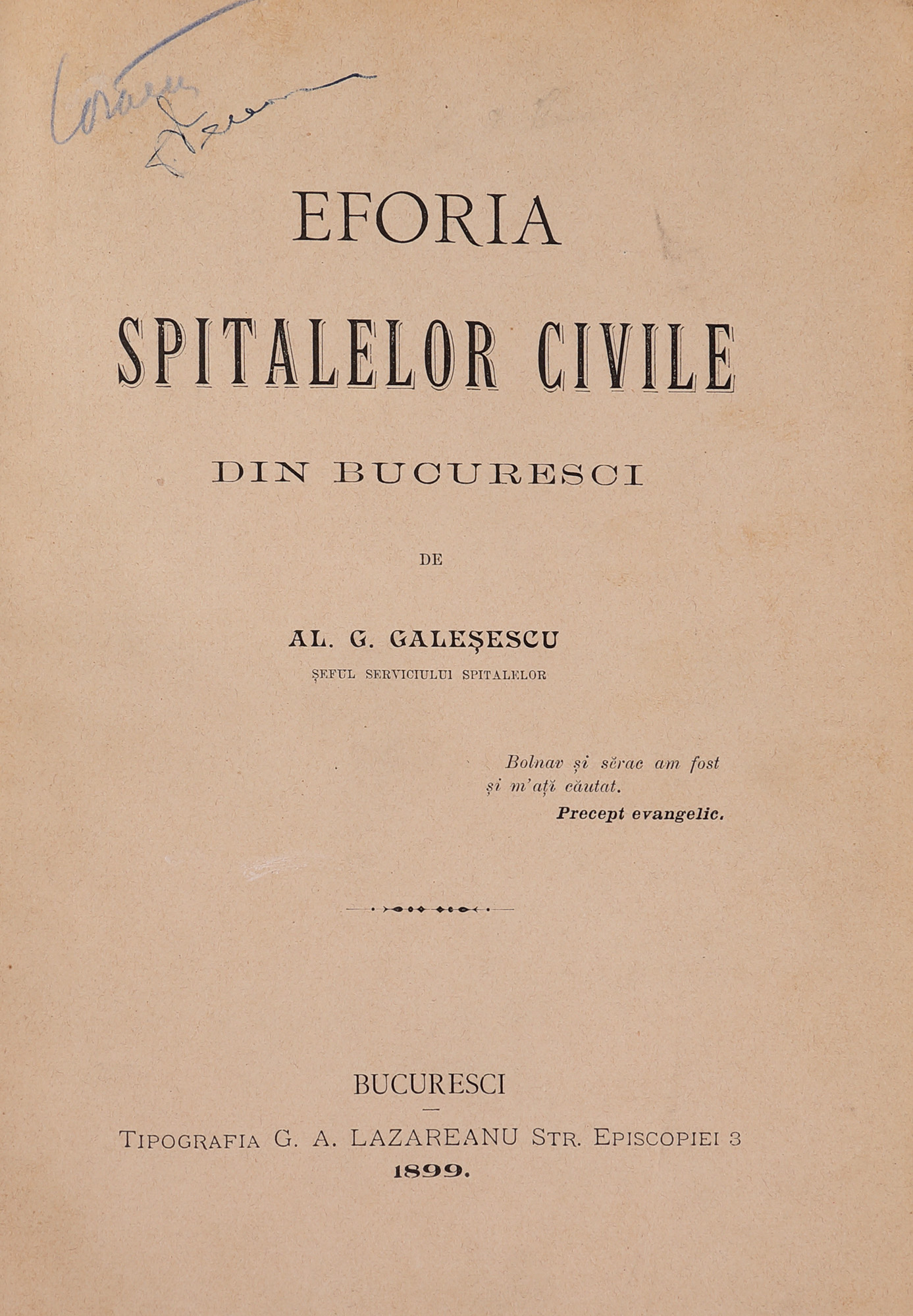 292. ”Eforia Spitalelor Civile din București”, de Alexandru G. Gălășescu, București, 1899