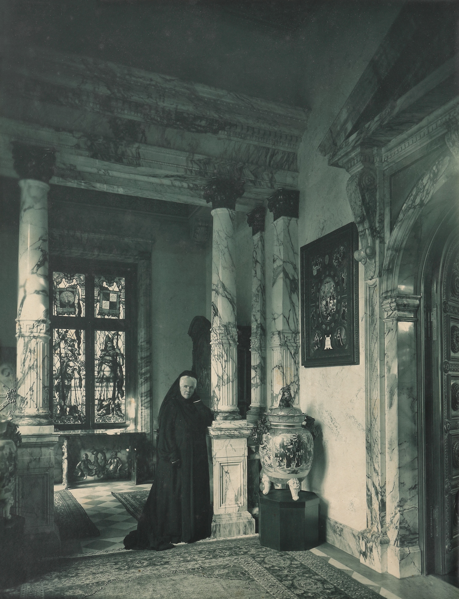 Regina Elisabeta apare în veșminte de doliu la parterul castelului Peleș, la câteva luni după decesul soțului său, regele Carol I. Fotografia de mari dimensiuni poartă semnătura olografă a reginei scrisă cu creion negru în partea dreaptă jos. Piesa este lipită pe un carton de epocă.