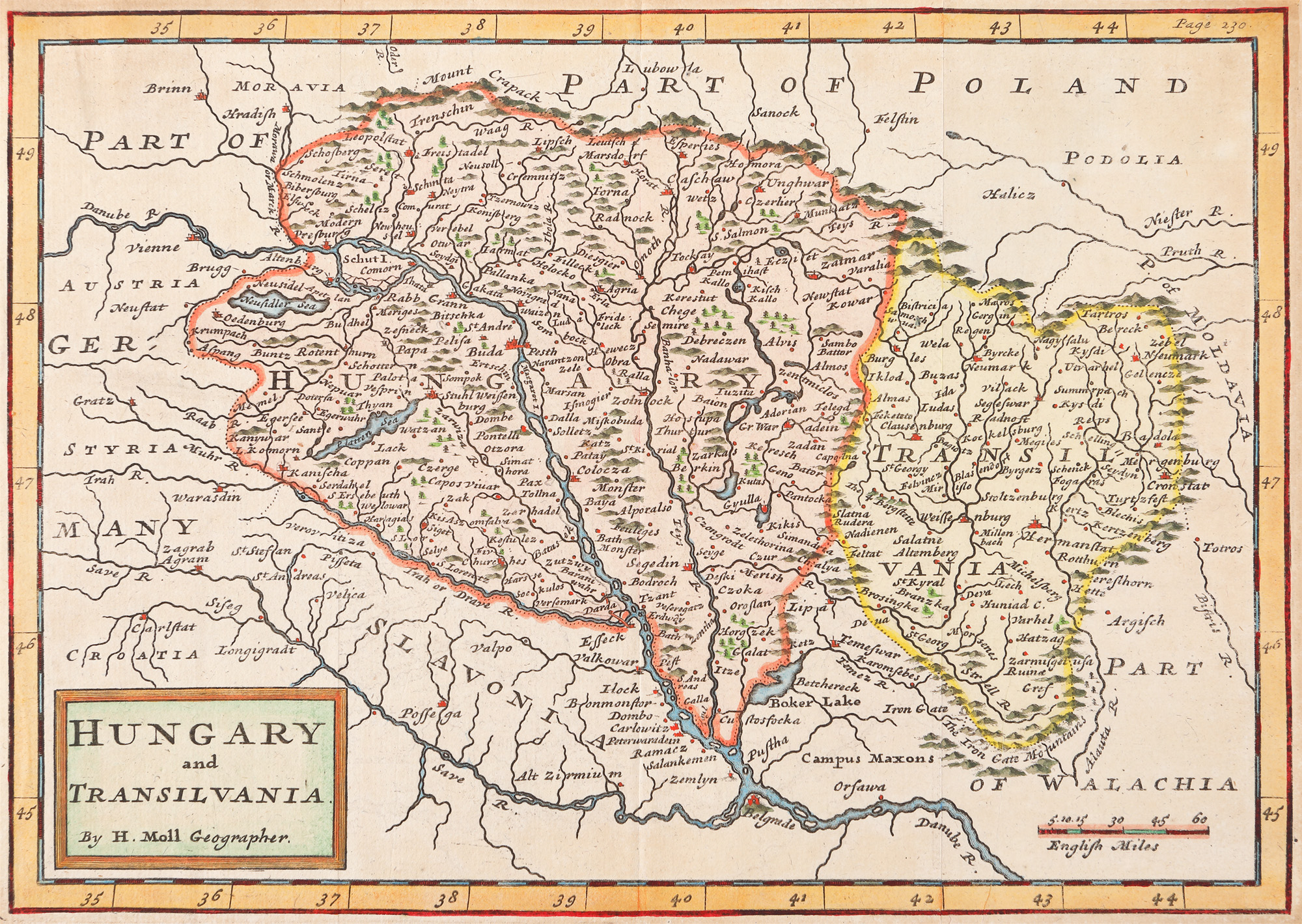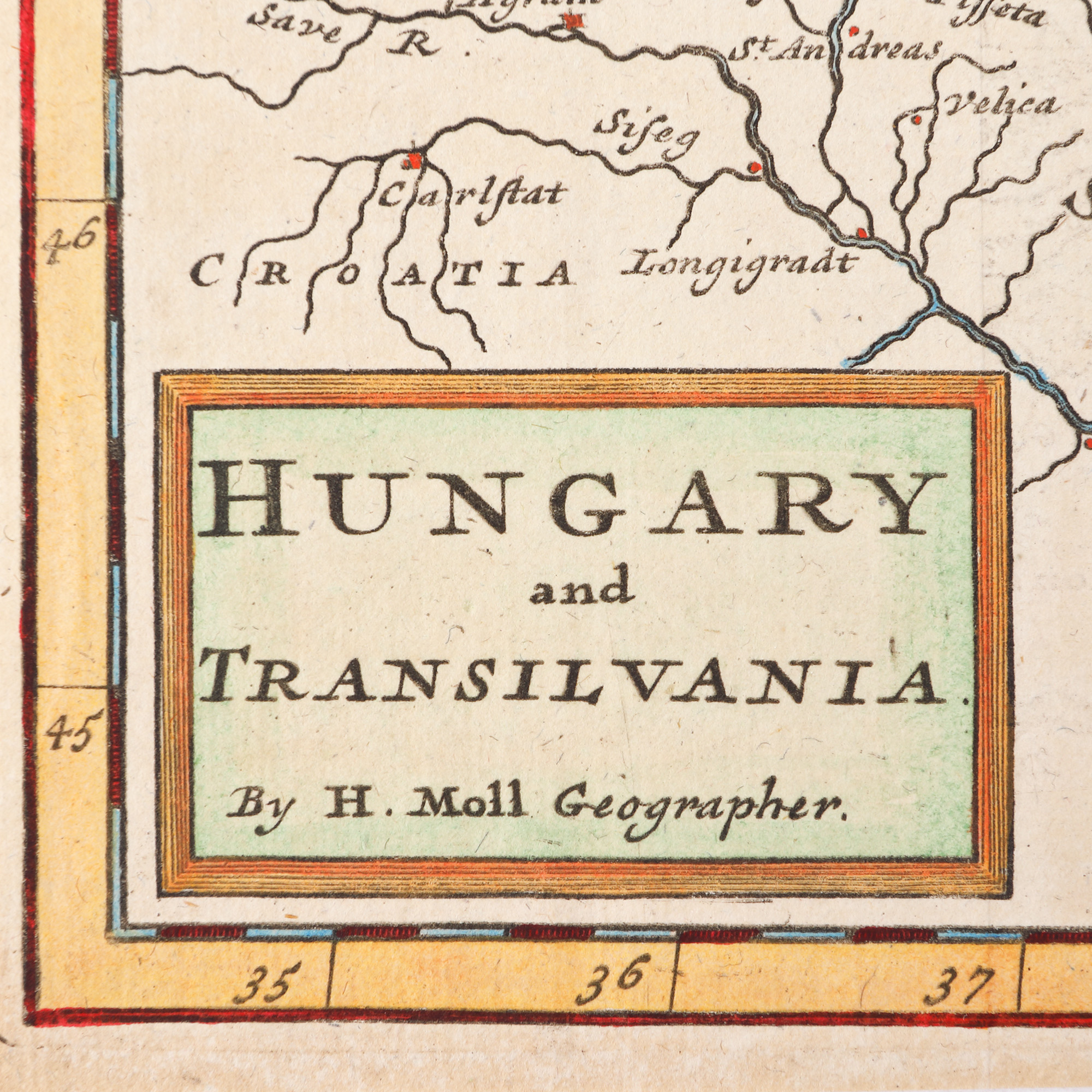 Cartograful de origine germană Herman Moll (?-1732) publica la Londra în 1715, unde s-a stabilit, s-a afirmat și a fost recunoscut, prima ediție din celebra sa lucrare "Descierea Lumii", care a cunoscut mai multe editări. Piesa de față face parte din ediția a doua apărută în 1721 și cuprinde o splendidă descriere a Ungariei și Transilvaniei. Gravură pe cupru colorată manual după imprimare.