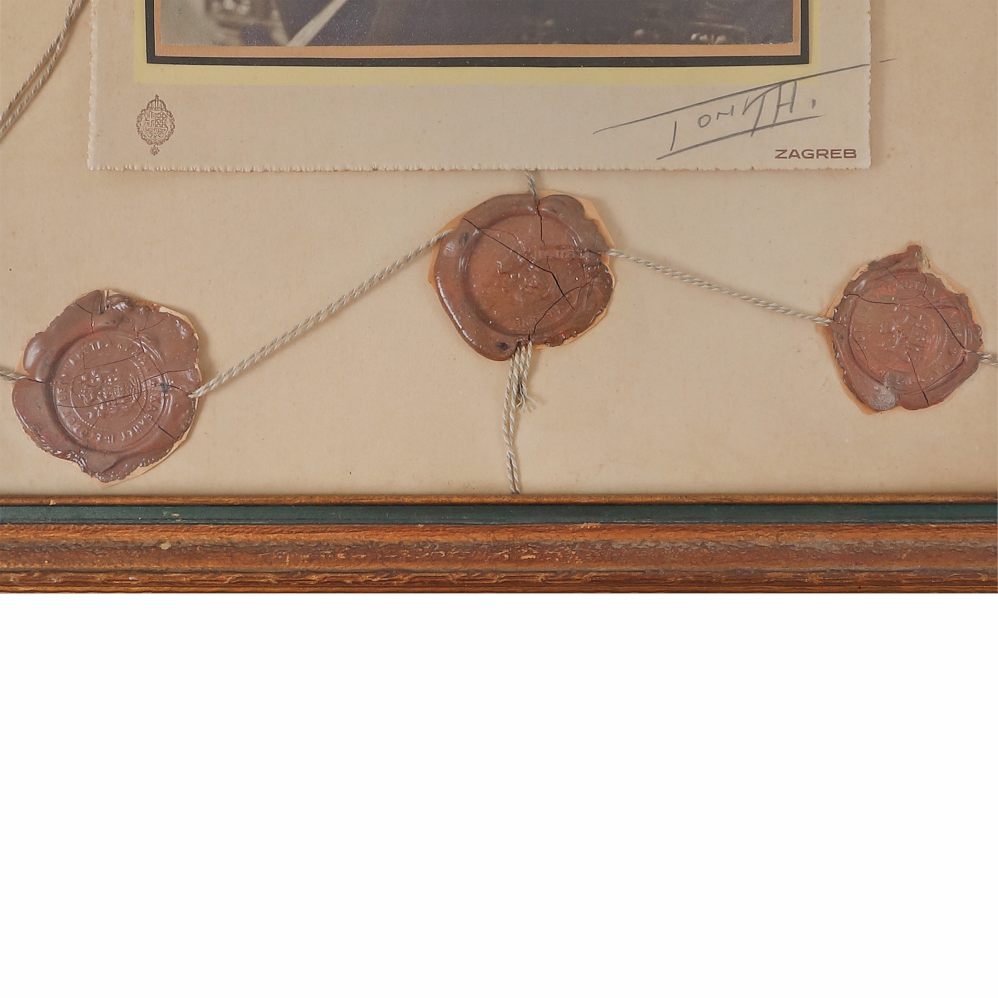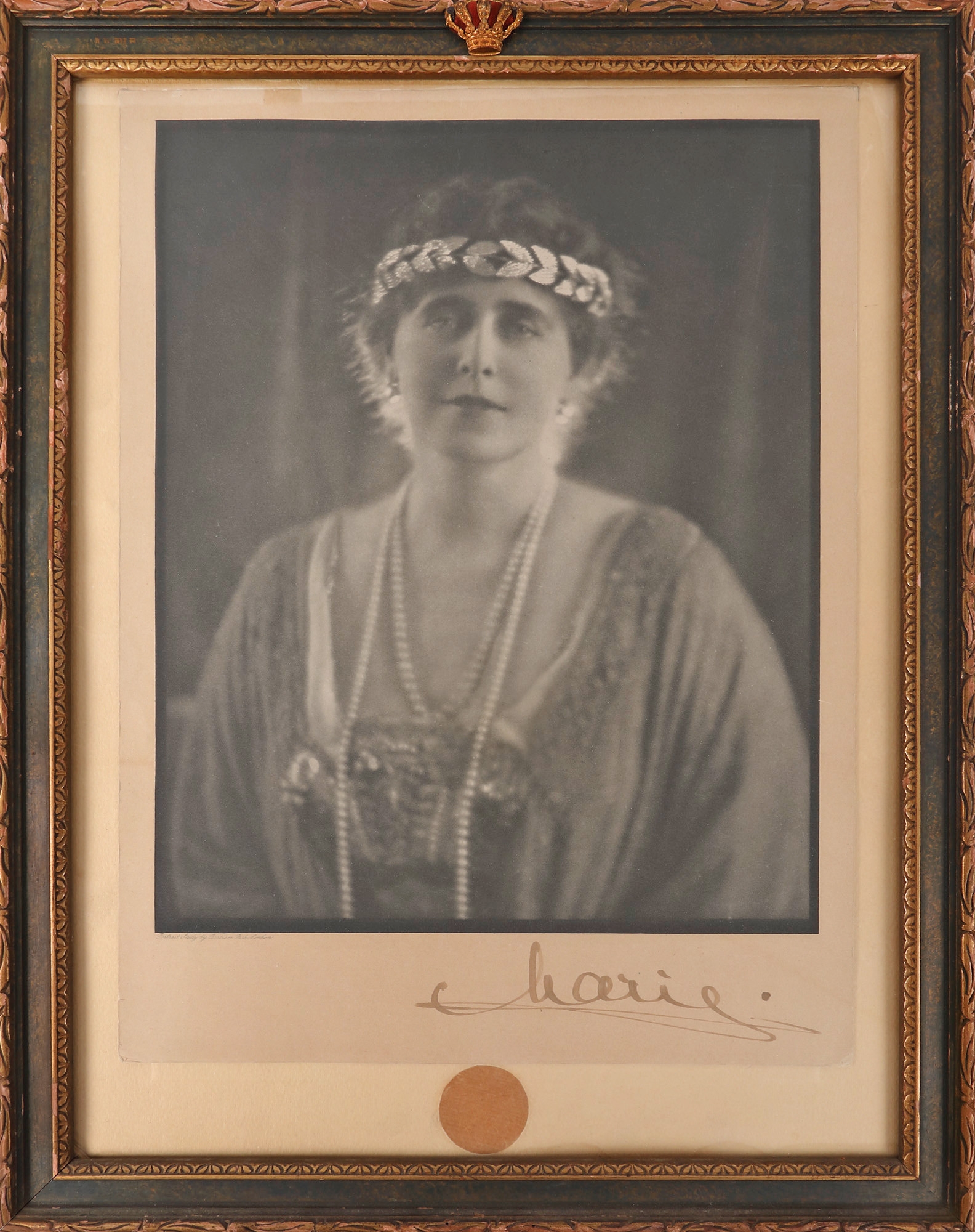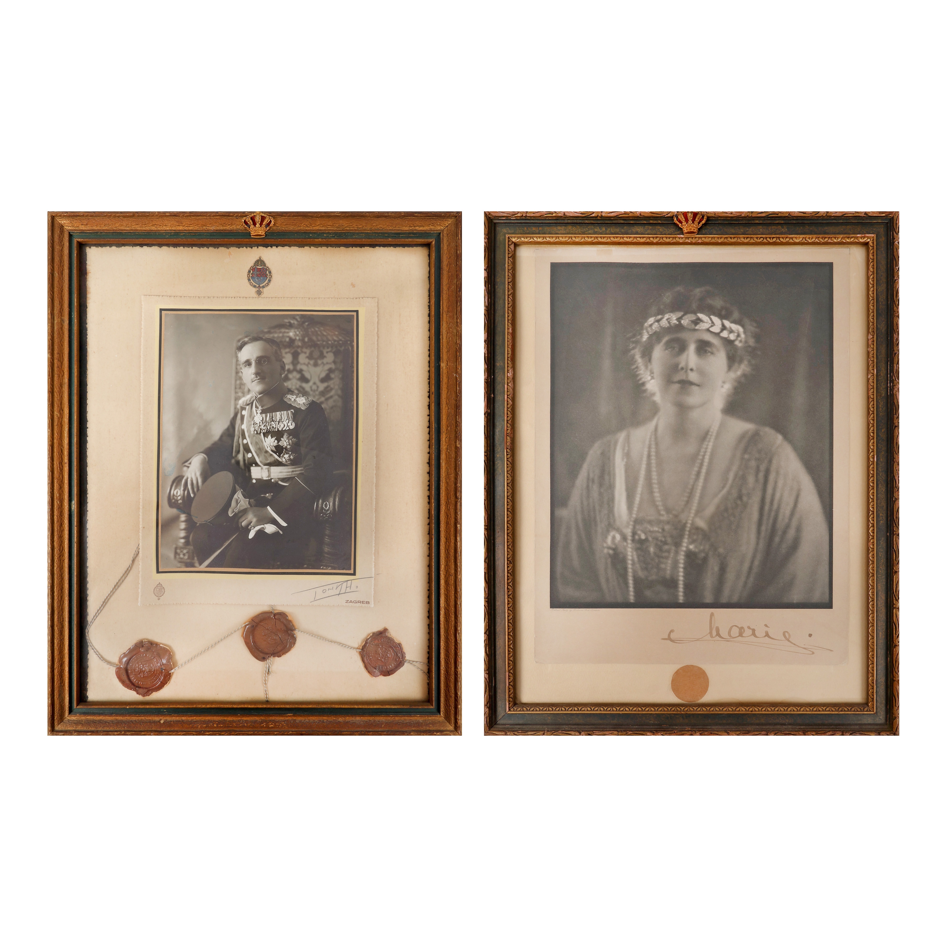 283. Lot format din două fotografii ilustrând pe Regina Maria și pe ginerele acesteia, regele Alexandru I al Regatului Iugoslaviei, primite de baronul Waldemar de Barcow, 1933-1934, cu semnătura olografă a reginei și ramă cu coroana regală surmontată, piese deosebite