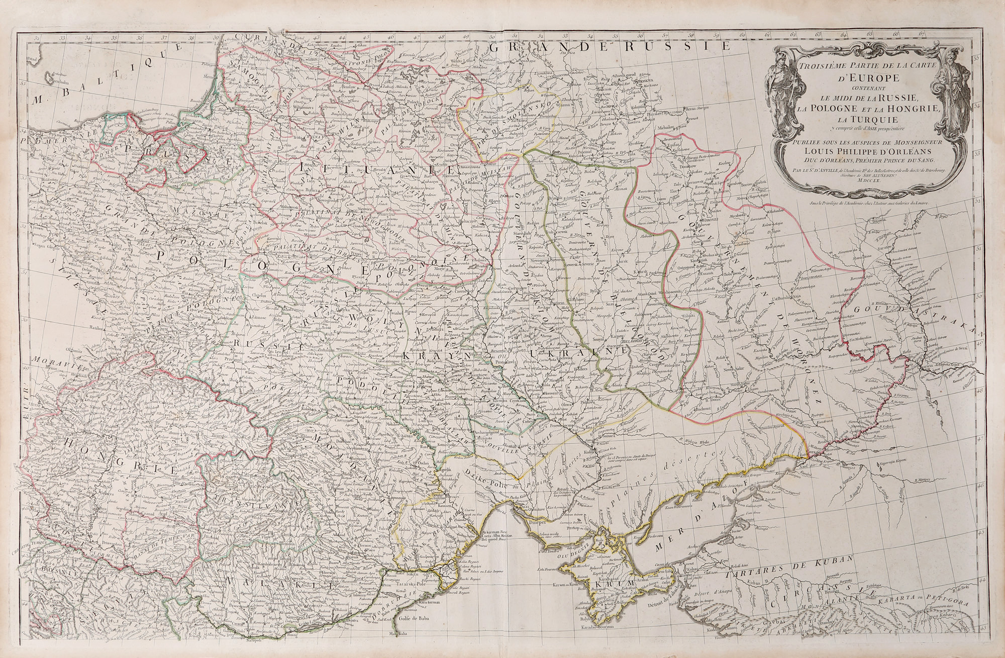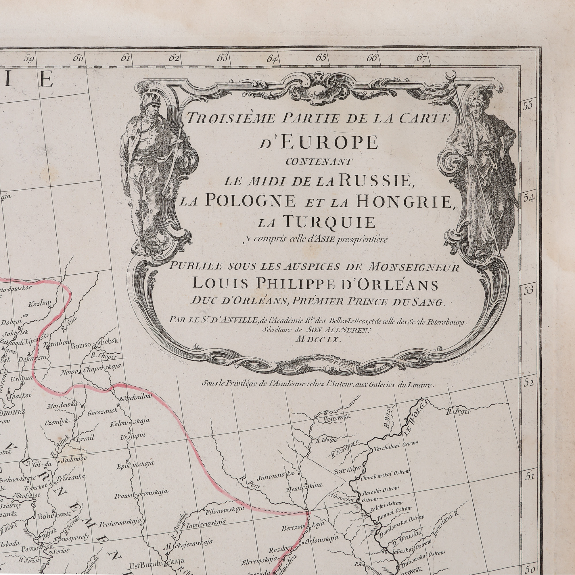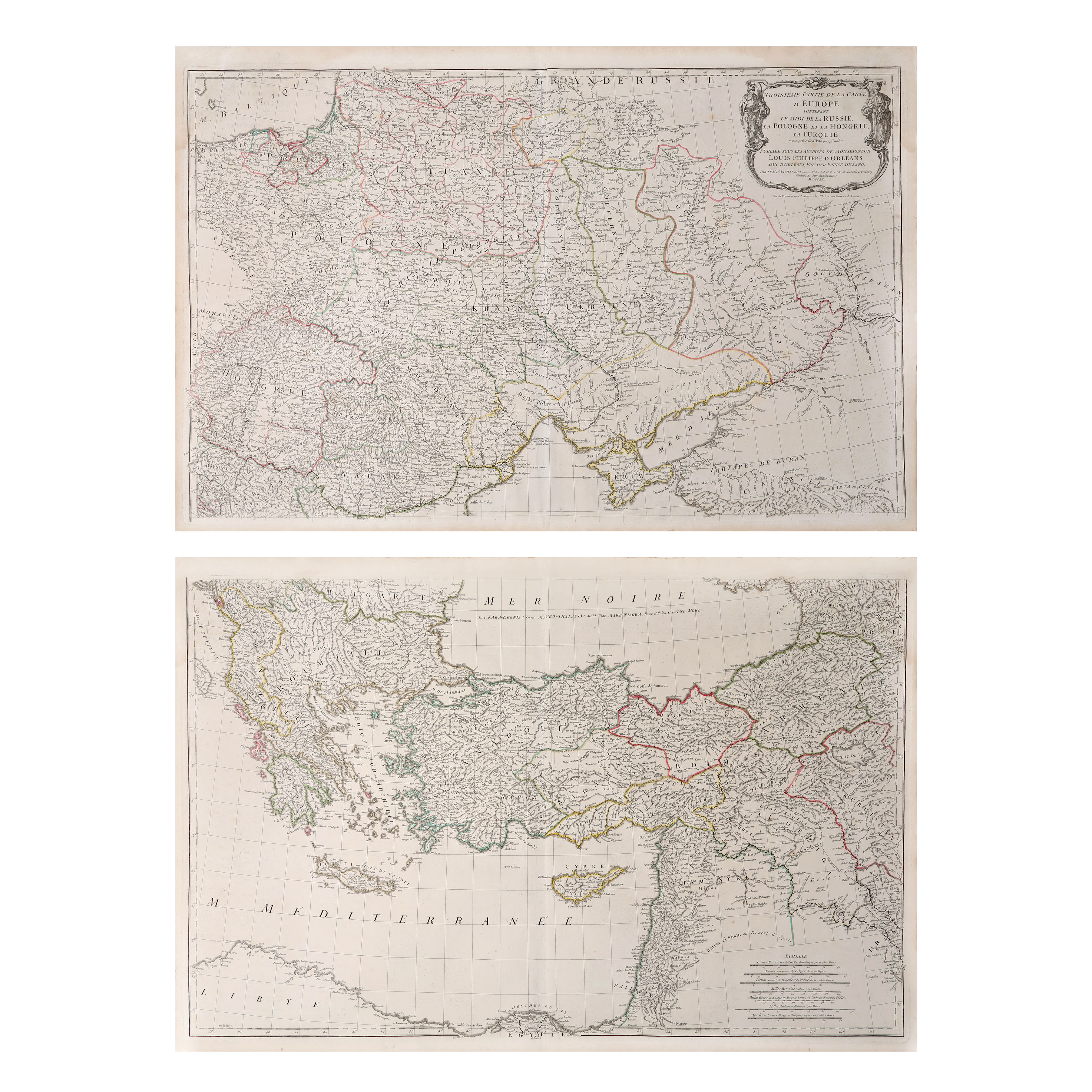 316. Lot format din două hărți ”A treia parte a hărții Europei, conținând sudul Rusiei, Poloniei și Ungariei, și partea Asiatică a Turciei”, de Jean Baptiste Bourguignon d’Anville, 1760