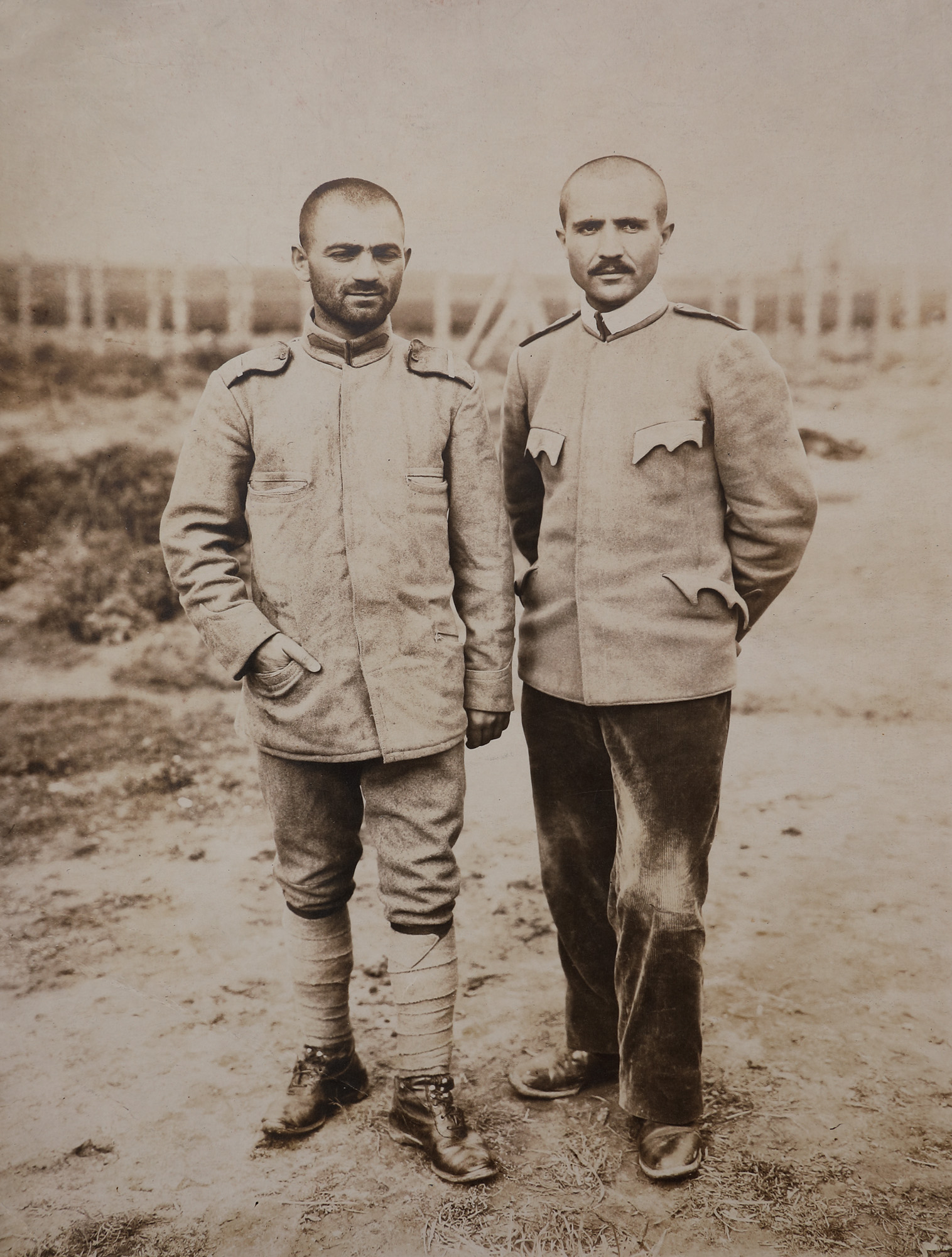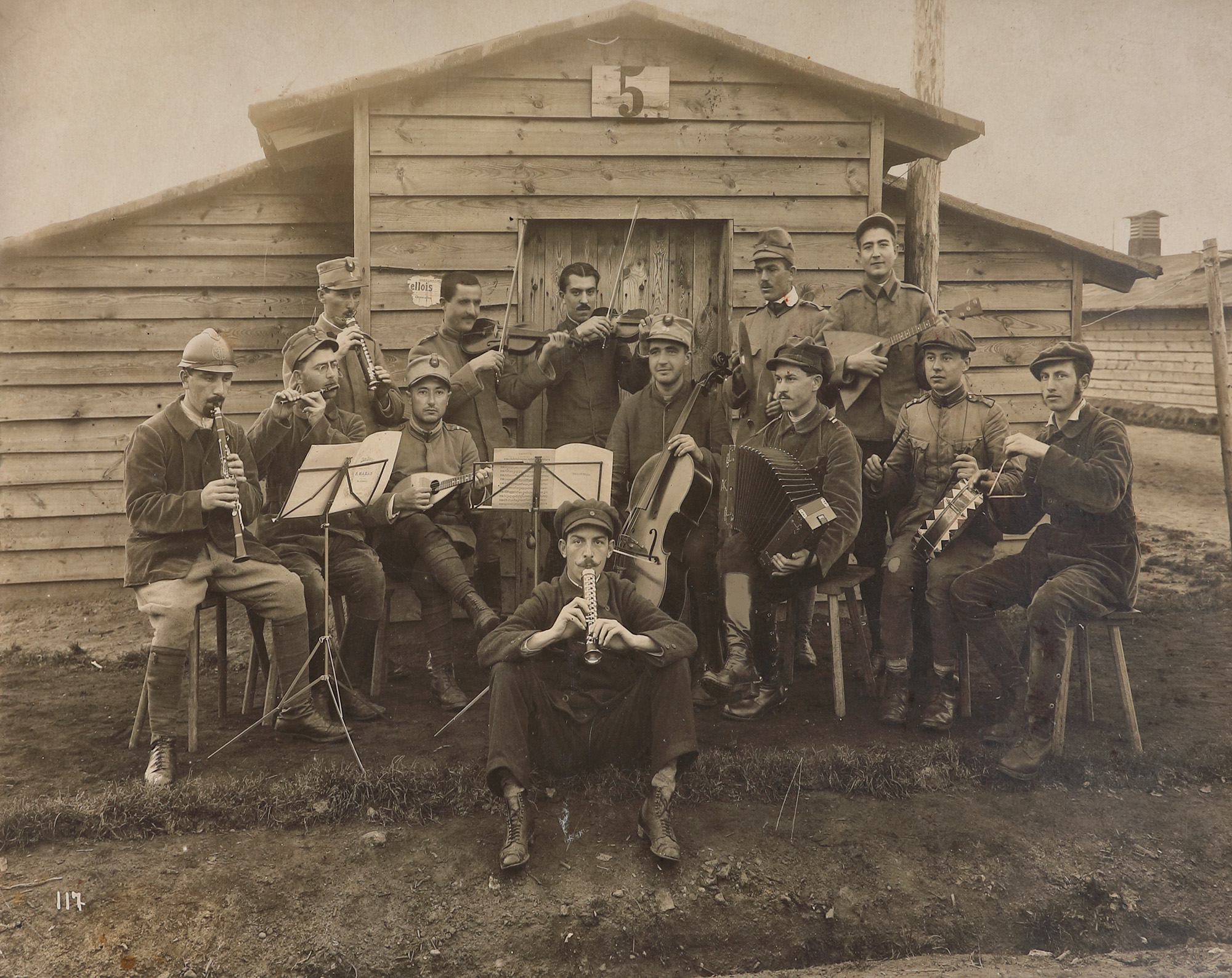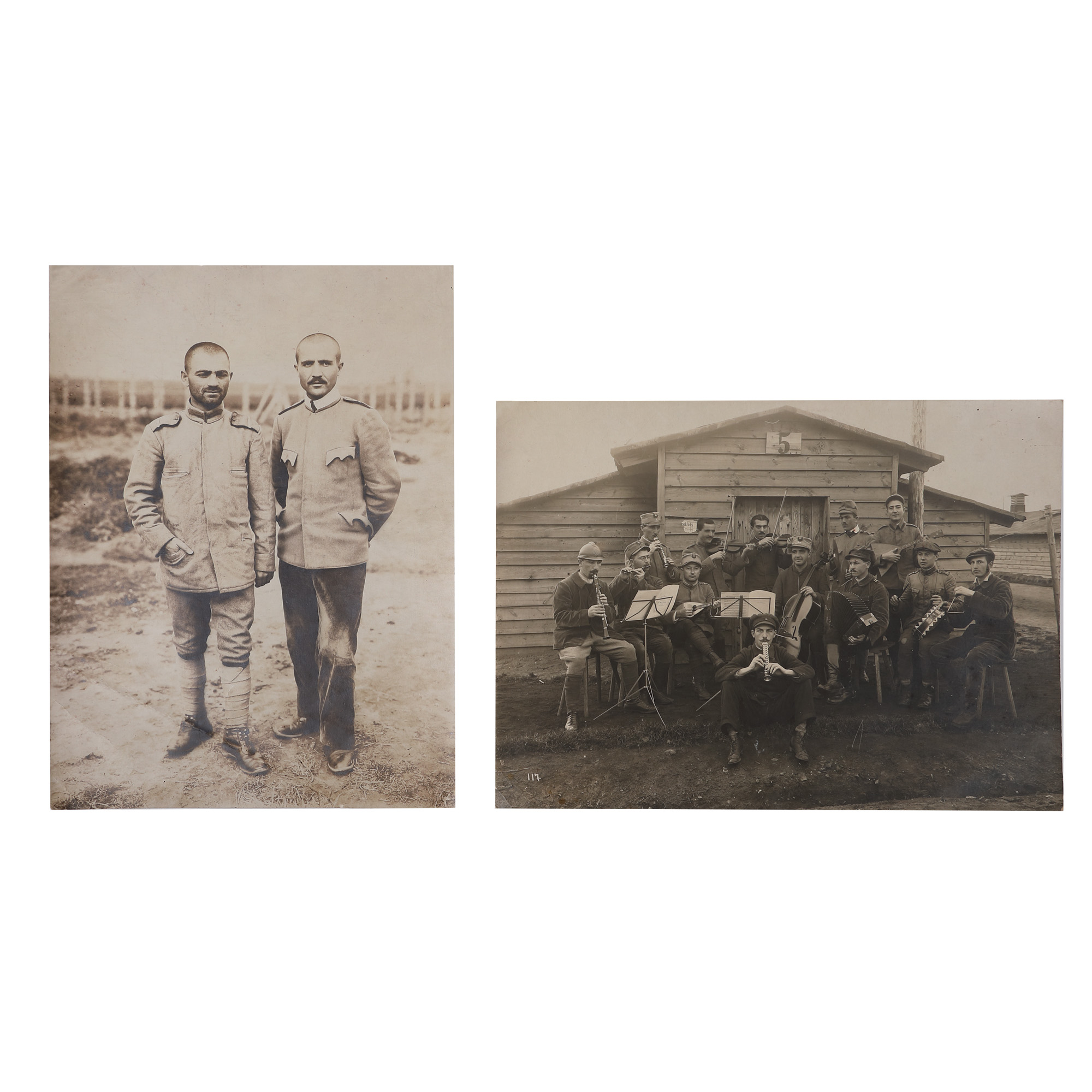 291. Lot format dintr-o fotografie ilustrând un grup de soldați români cu instrumente de orchestră, și o fotografie ilustrând doi prizonieri de război români pe teritoriu german, cu semnături olografe, cca. 1917