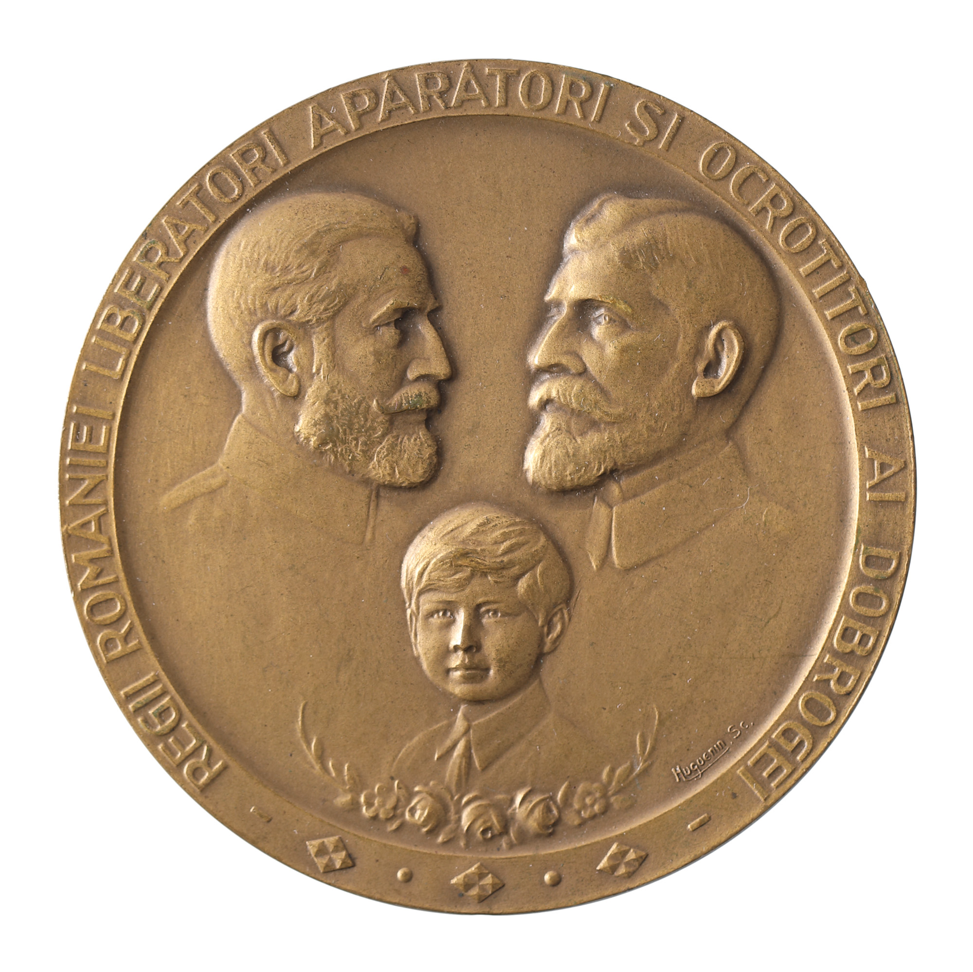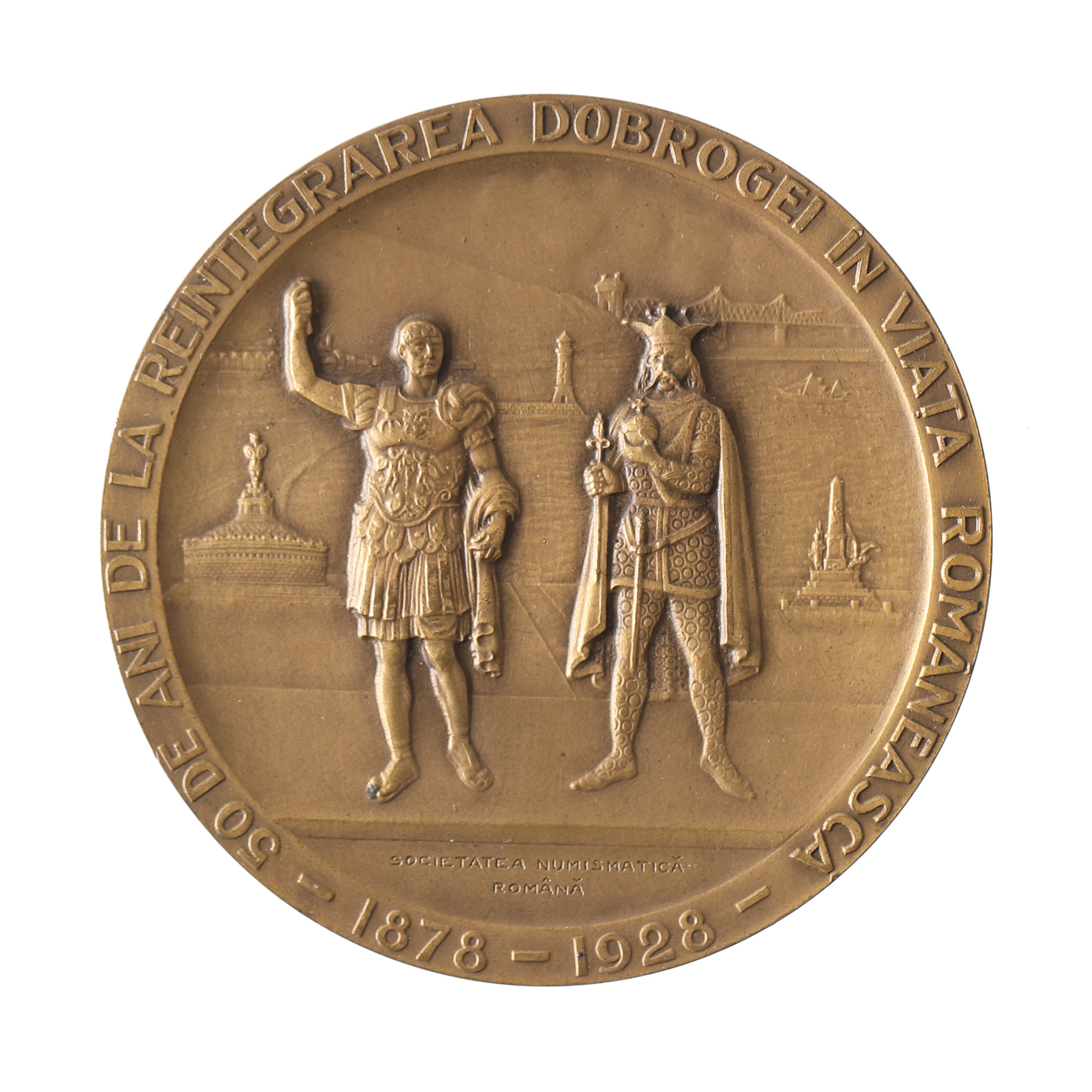 Aversul medaliei, realizate în atelierul gravorului Huguenin din Le Locle, Elveția, cuprinde bustul regelui Ferdinand I, orientat spre stânga. al regelui Carol I, spre dreapta, și al tânărului Mihai I, aflat în Regență, privit din față, înconjurați de sintagma „Regii României liberatori apărători și ocrotitori ai Dobrogei" și de semnătura artistului, în timp ce reversul îi include pe Împăratul Traian și pe Sfântul Ștefan cel Mare, alături de o serie de monumente reprezentative ale istoriei autohtone și regionale și de inscripția „50 de ani de la reintegrarea Dobrogei în viața românească 1878 - 1928 / Societatea Numismatică Română".