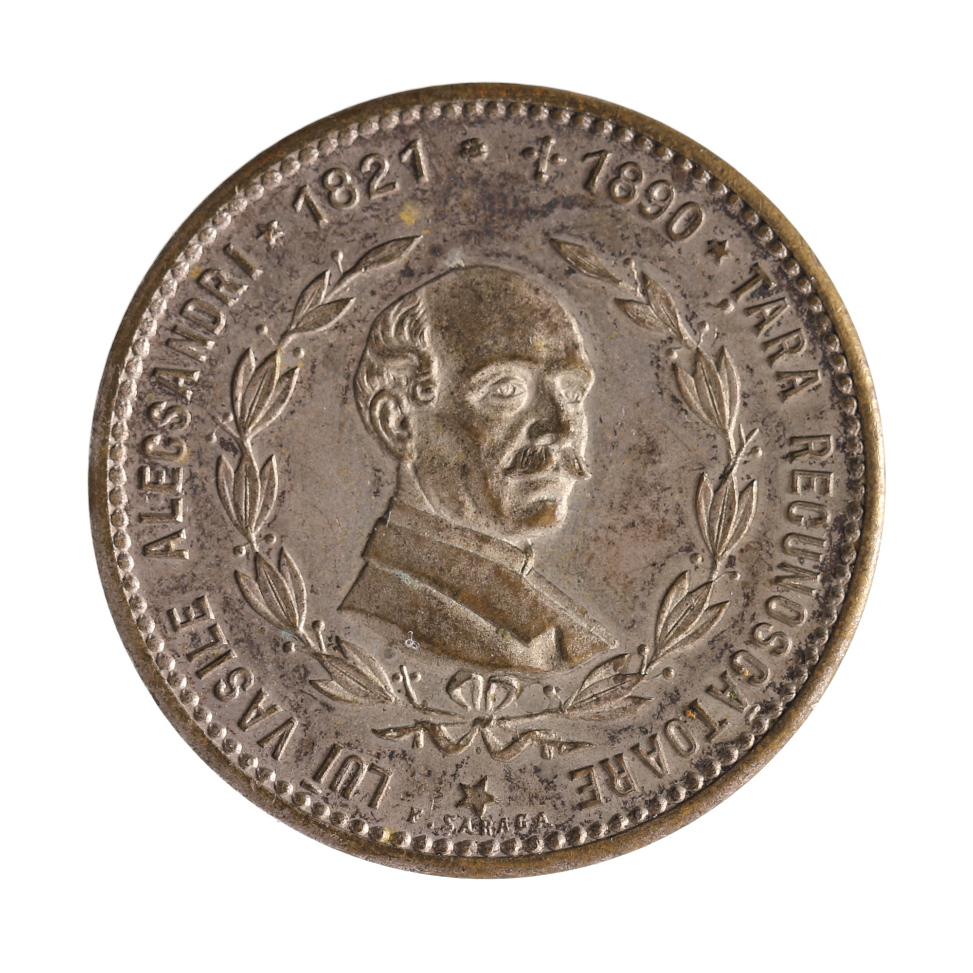 Aversul medaliei cuprinde bustul poetului și omului de cultură Vasile Alecsandri, orientat spre dreapta, cu semnătura gravorului Fany Șaraga sub acesta și înconjurat de inscripția „Lui Vasile Alecsandri 1821 + 1890 Țara Recunoscătoare", în timp ce reversul include sintagma „Statuia ridicată / în / Iași anul 1905 / în zilele M. S. regelui / Carol I / prim-ministru fiind / G. Gr. Cantacuzino / ministrul instrucțiunei / M. Vlădescu / primar Gh. Lascăr". Personalitate însemnată a Moldovei și apoi a României secolului al XIX-lea, Vasile Alecsandri a fost, în afara carierei sale dedicate literelor, și ministru, diplomat și membru fondator al Academiei Române.