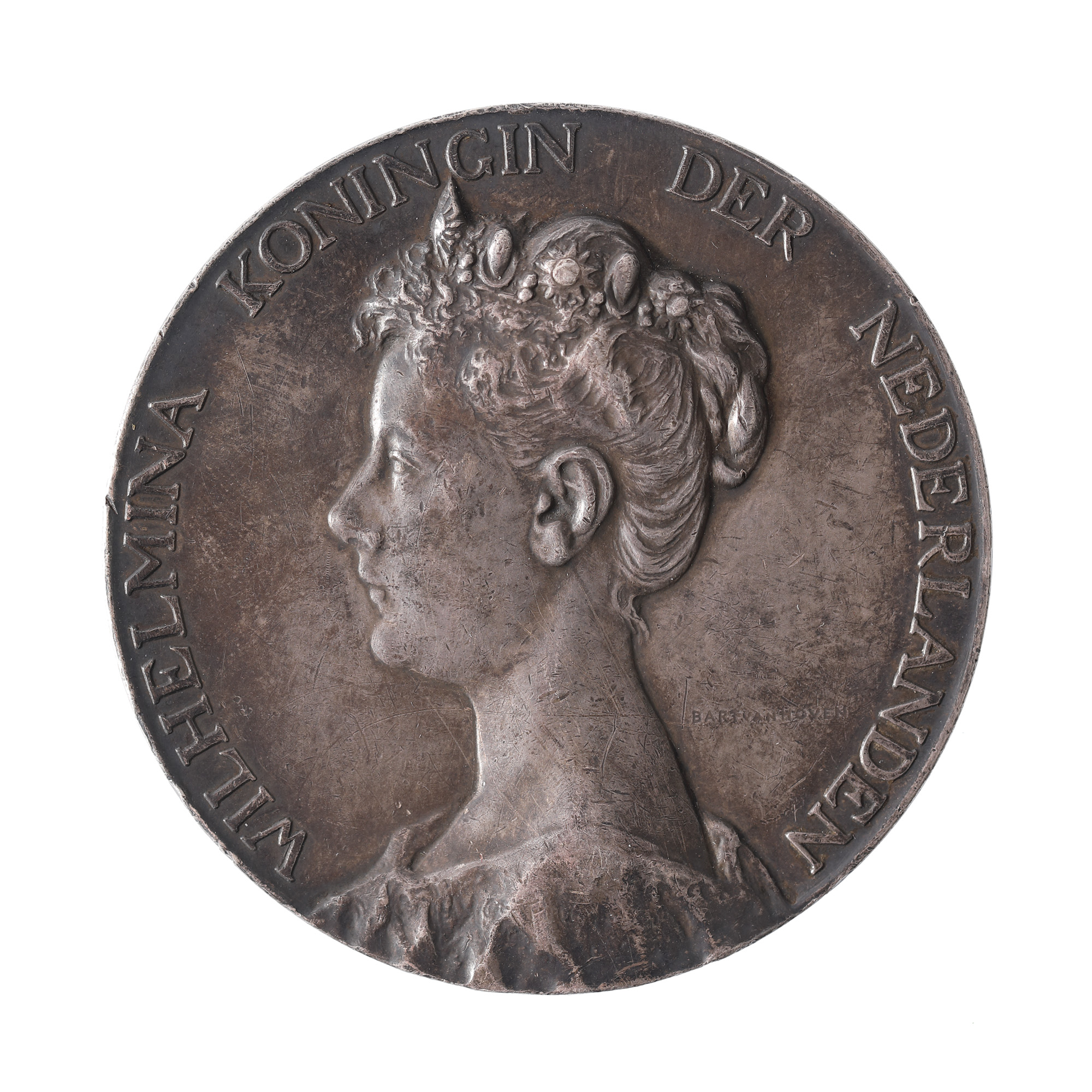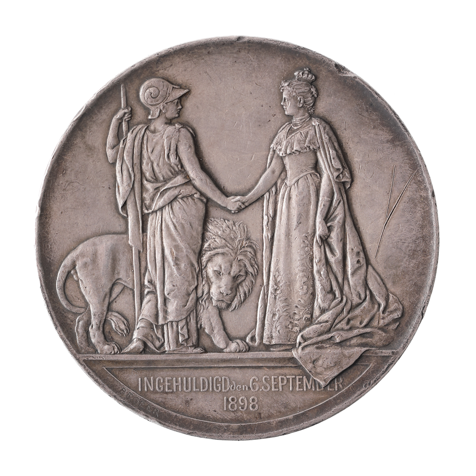 Principesa Wilhelmina, născută în 1880, devenea regină a Olandei în 1890 în urma decesului tatălui său, regele William al III-lea. Fiind minoră, mama sa, regina Emma, și-a asumat regența. Pe data de 6 septembrie 1898 Wilhemina devenea majoră și își asuma responsabilitatea de regină, poziție pe care a ocupat-o până în 1948. Medalia era bătută cu această ocazie. Pe avers se observă portretul în profil al tinerei regine iar pe revers se află un grup alegoric format din două personaje feminine, regina în dreapta și națiunea neerlandeză în stânga.