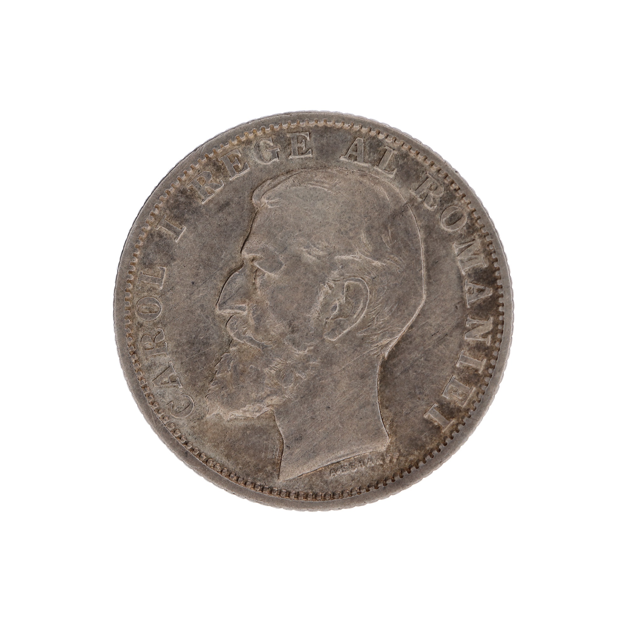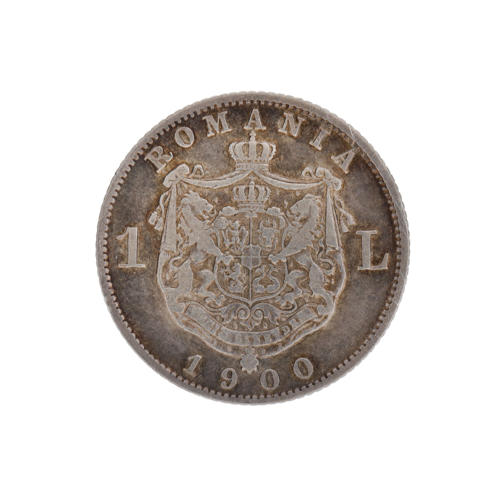 Avers: bustul regelui Carol I, orientat spre stânga, alături de inscripția „Carol I rege al Romaniei / A. Scharff", semnătura gravorului Anton Scharff Revers: stema regatului și inscripția „Nihil sine Deo / Romania / 1 L / 1900"