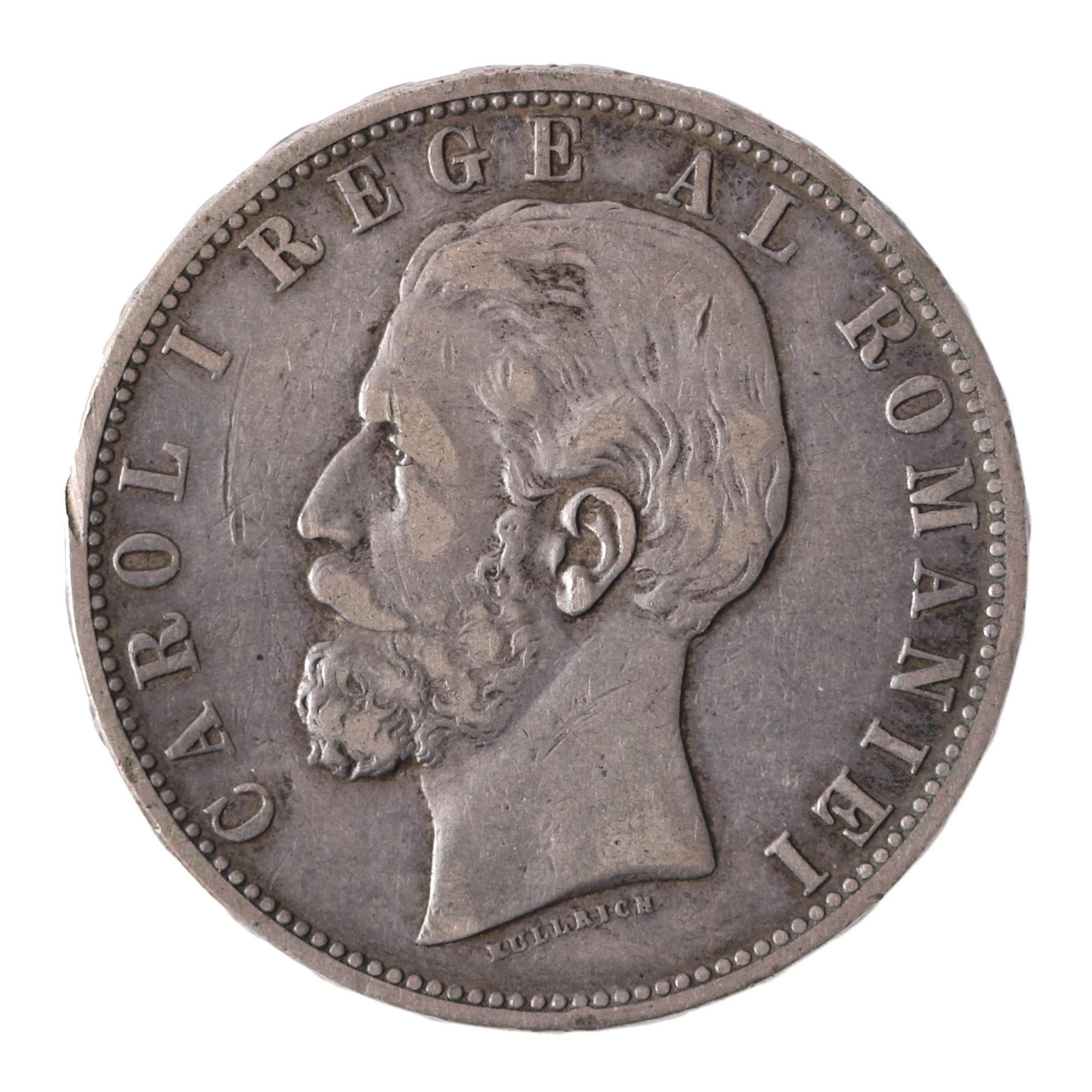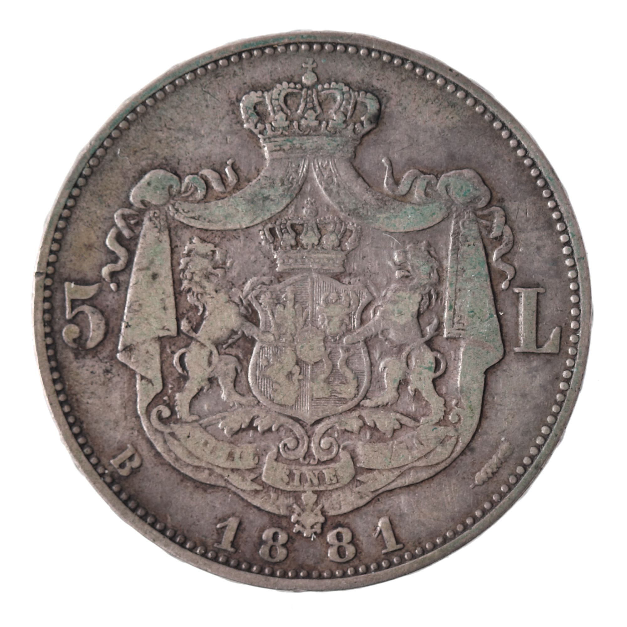 Avers: bustul regelui Carol I, orientat spre stânga, alături de inscripția „Carol I rege al Romaniei / Kullrich" Revers: stema regatului și inscripția „Nihil sine Deo / 5 L / B / 1881"