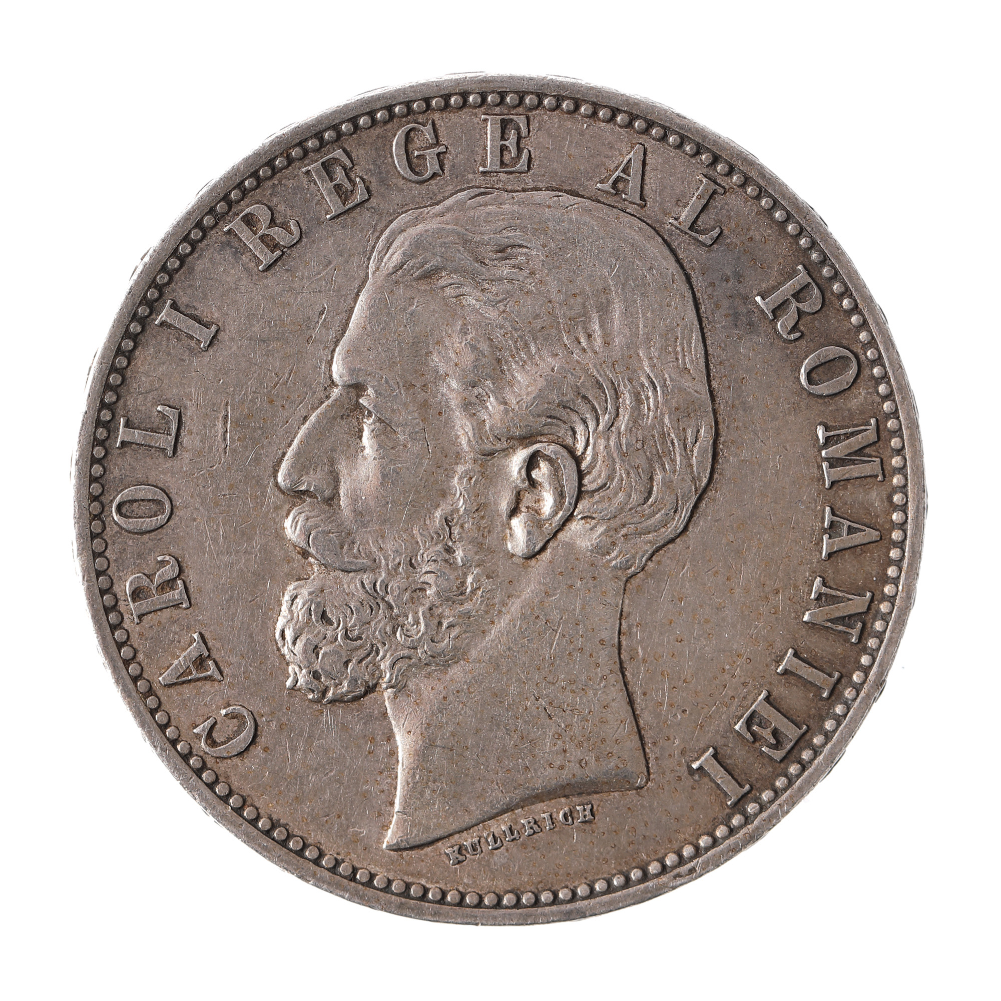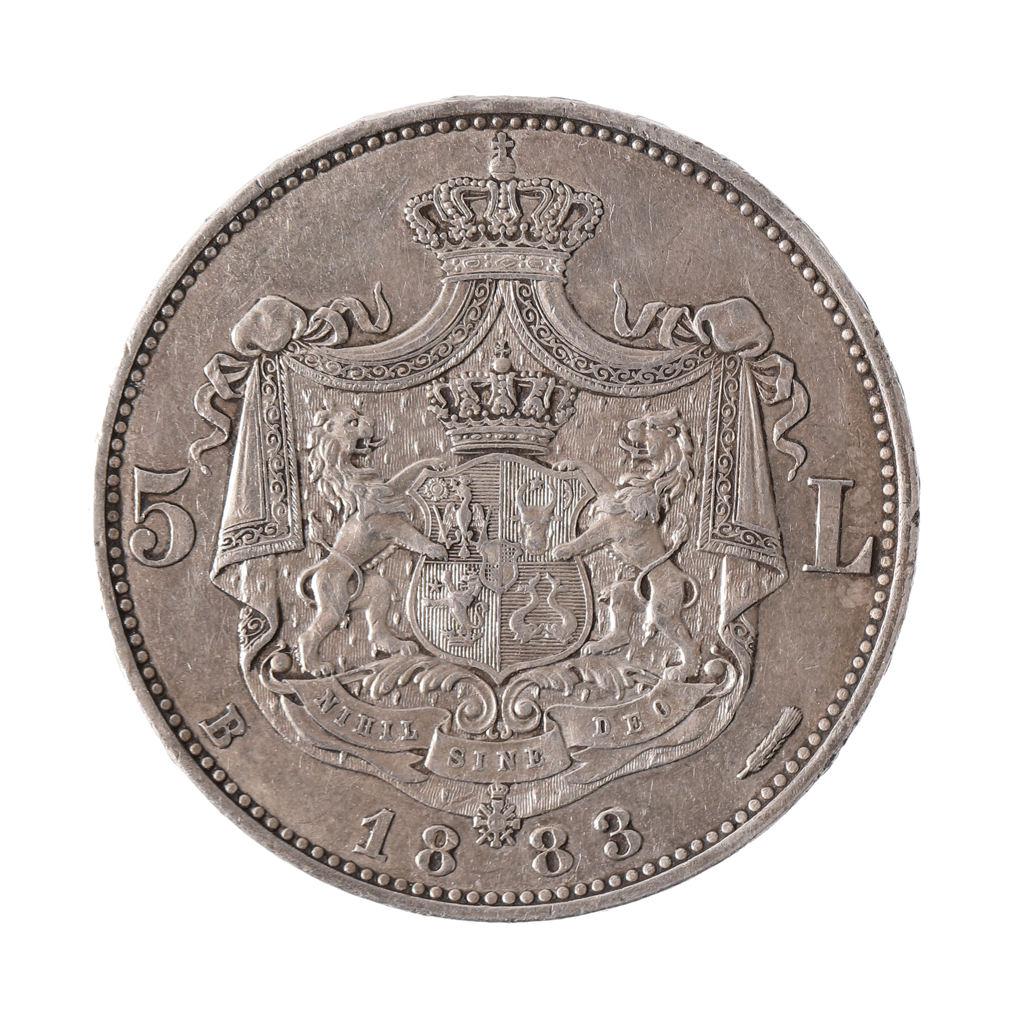 Avers: bustul regelui Carol I, orientat spre stânga, alături de inscripția „Carol I rege al Romaniei / Kullrich" Revers: stema regatului și inscripția „Nihil sine Deo / 5 L / B / 1883"