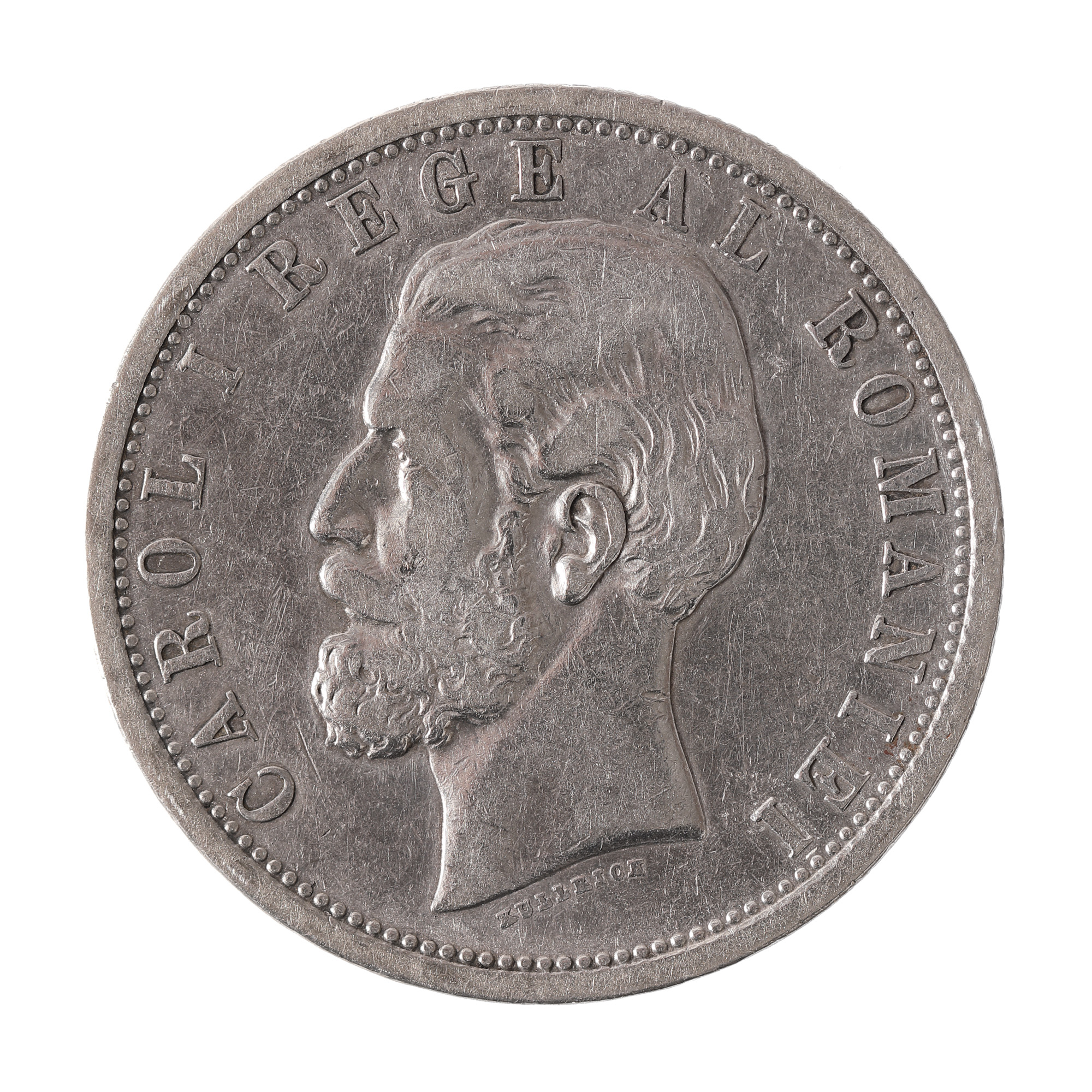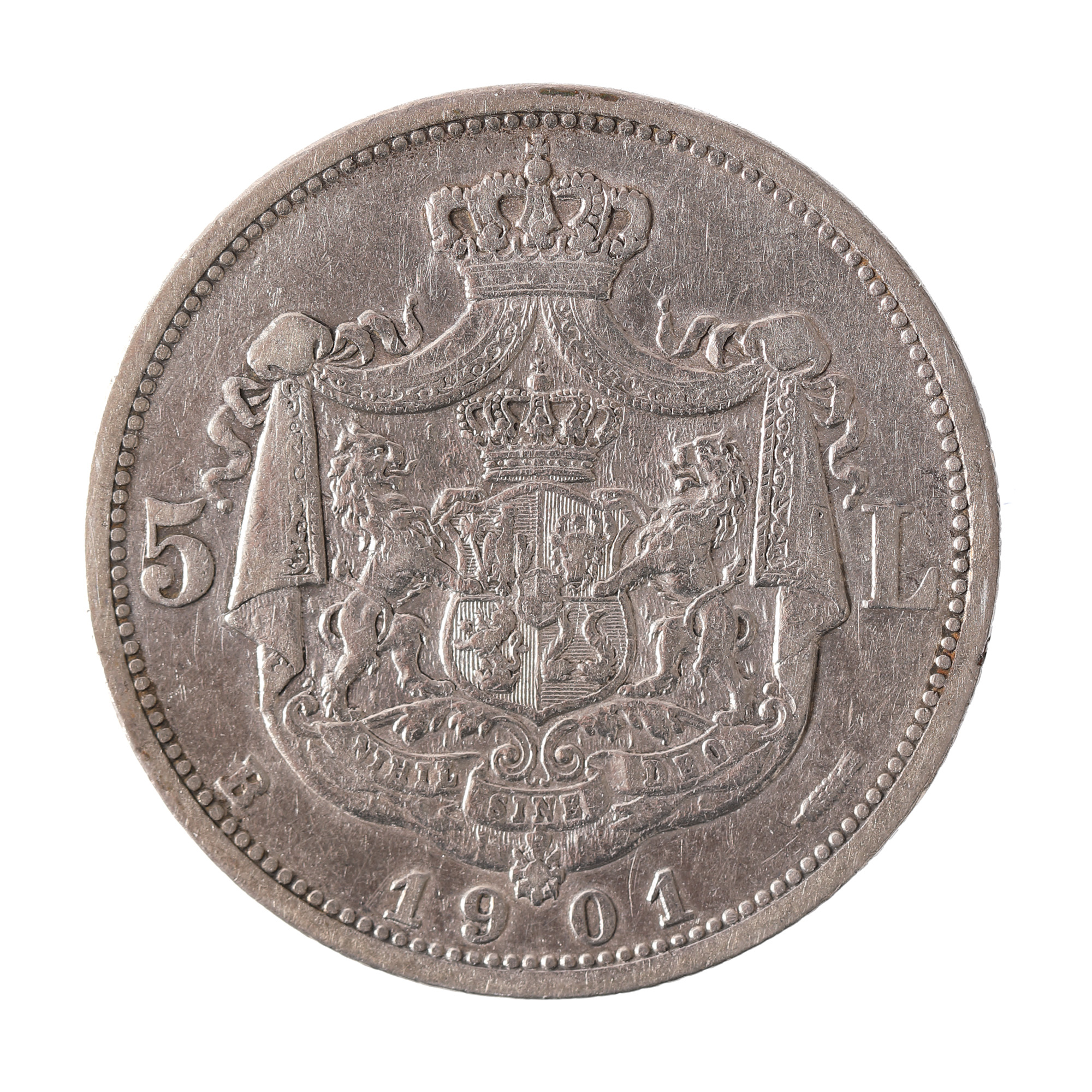 Avers: bustul regelui Carol I, orientat spre stânga, alături de inscripția „Carol I rege al Romaniei / Kullrich" Revers: stema regatului și inscripția „Nihil sine Deo / 5 L / B / 1901"