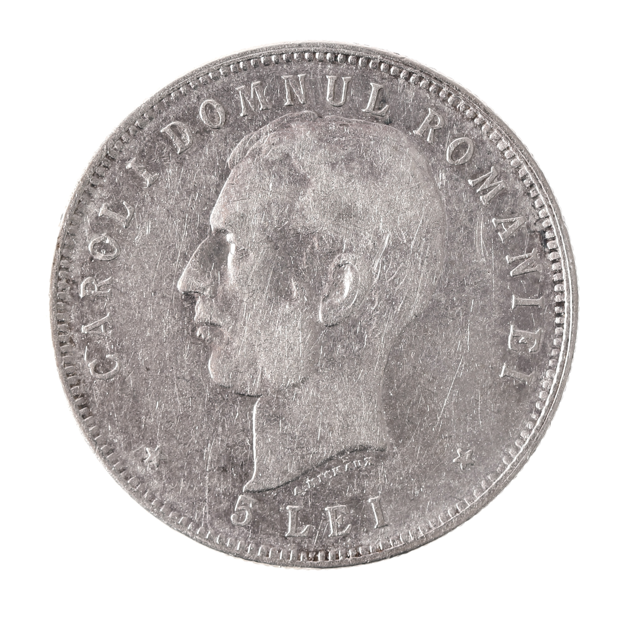 Avers: bustul regelui Carol I, orientat spre stânga, alături de inscripția „Carol I rege al Romaniei / 1866 - 1906 / A. M.", semnătura gravorului Alphonse Michaux Revers: bustul lui Carol I, de data aceasta mai tânăr și în calitate de domn, orientat spre stânga, alături de inscripția „Carol I domnul Romaniei / 5 lei / A. Michaux"