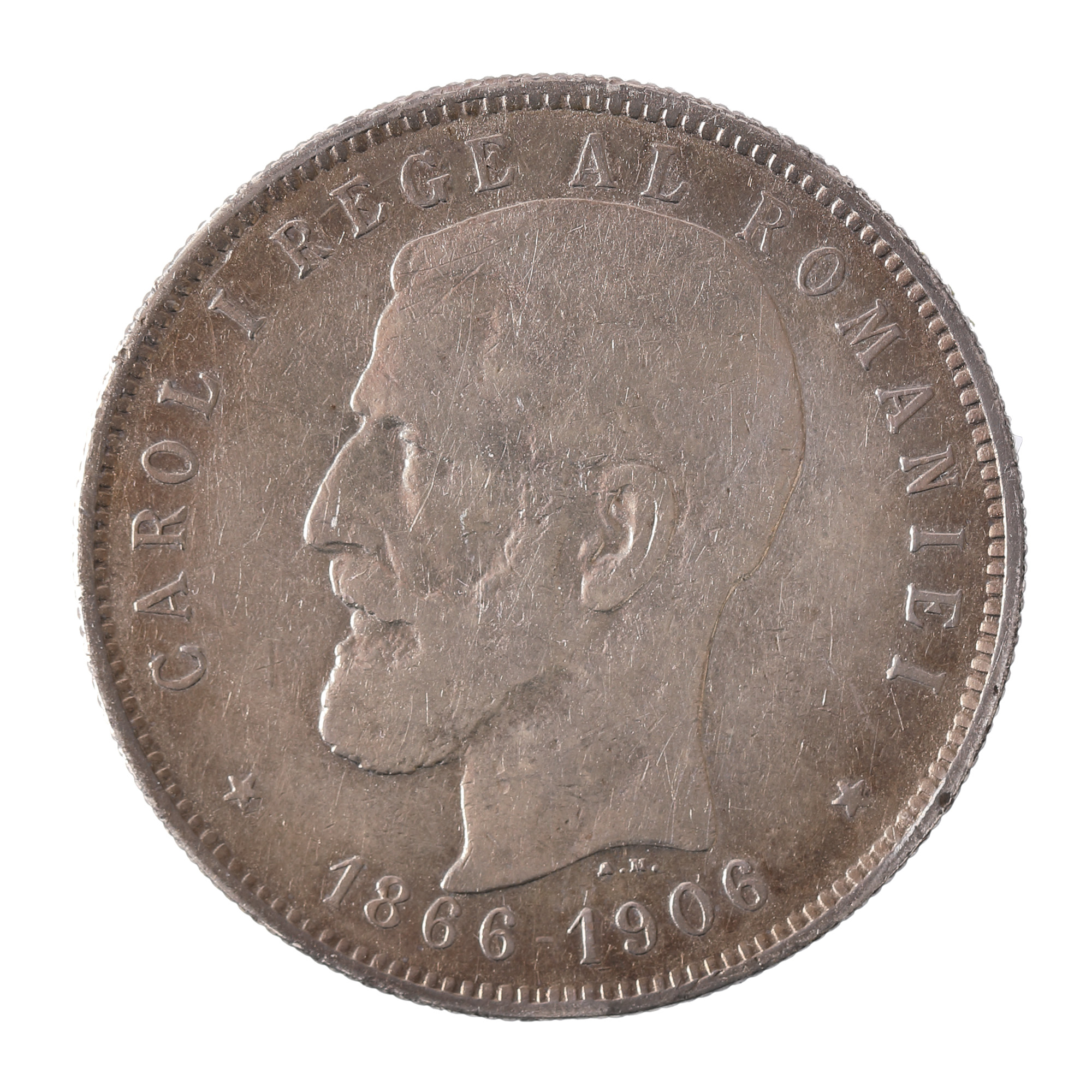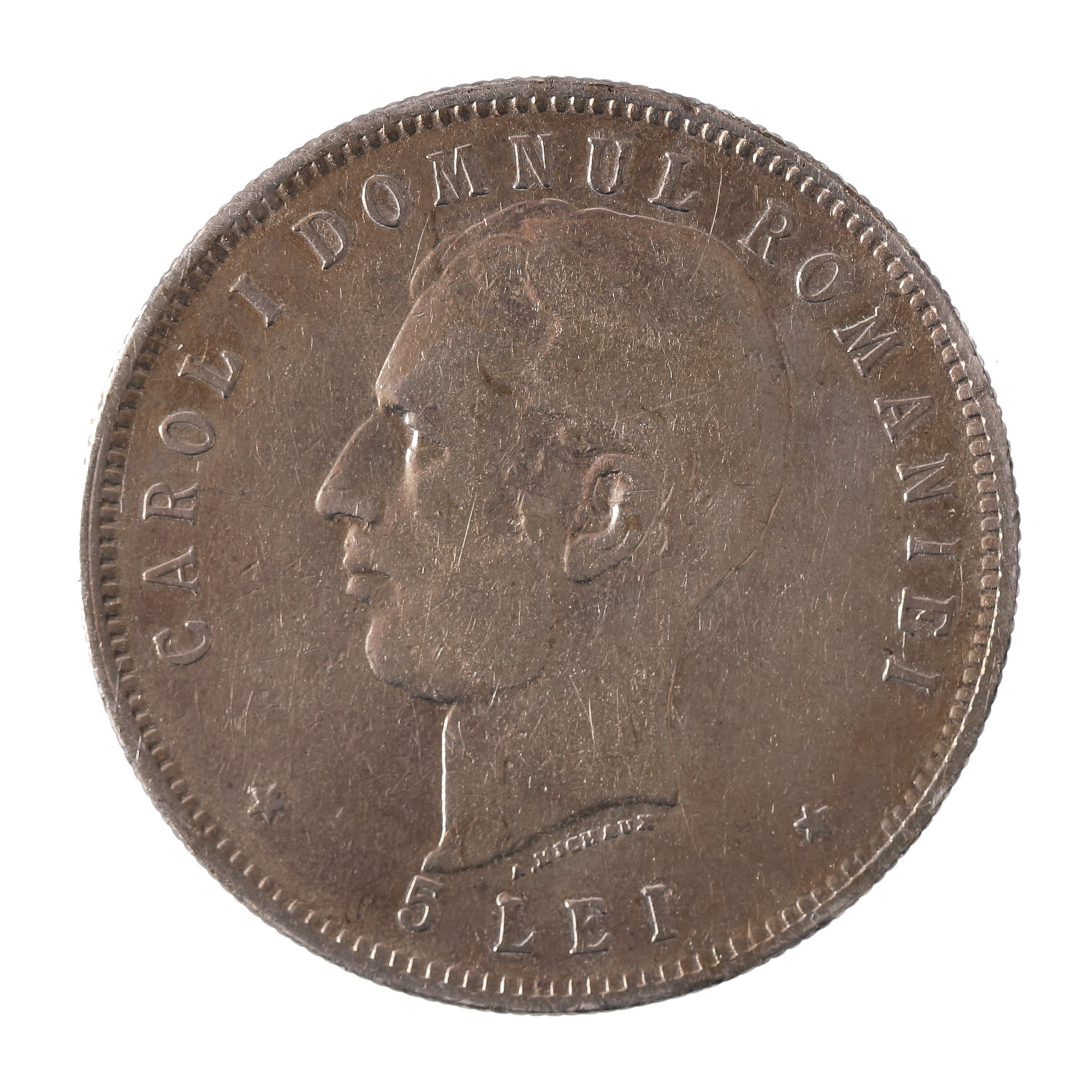 Avers: bustul regelui Carol I, orientat spre stânga, alături de inscripția „Carol I rege al Romaniei / 1866 - 1906 / A. M.", semnătura gravorului Alphonse Michaux Revers: bustul lui Carol I, de data aceasta mai tânăr și în calitate de domn, orientat spre stânga, alături de inscripția „Carol I domnul Romaniei / 5 lei / A. Michaux"