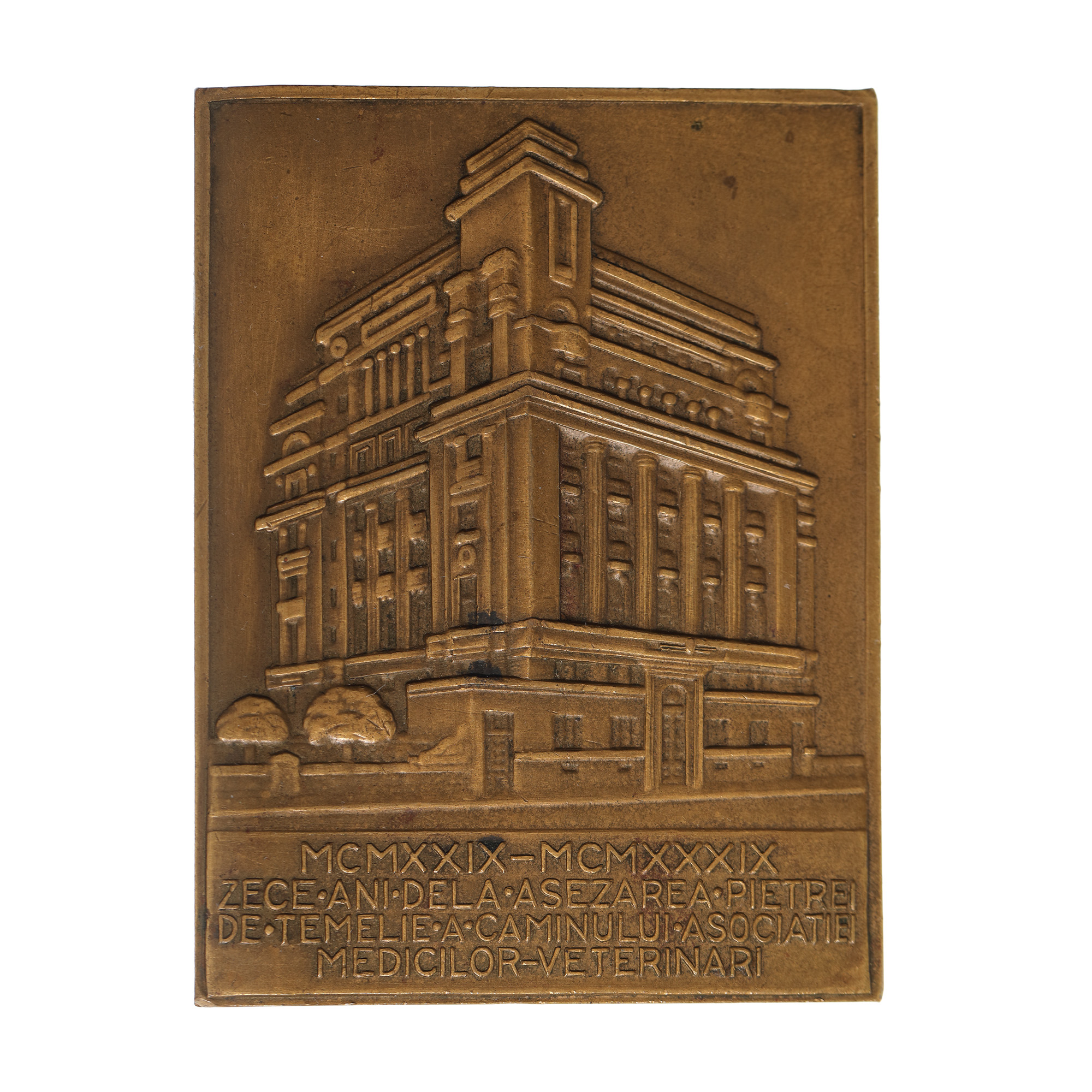 234. Placheta „10 ani de la așezarea pietrei de temelie a căminului Asociației Medicilor Veterinari", gravor Gheorghe Stănescu, 1929-1939
