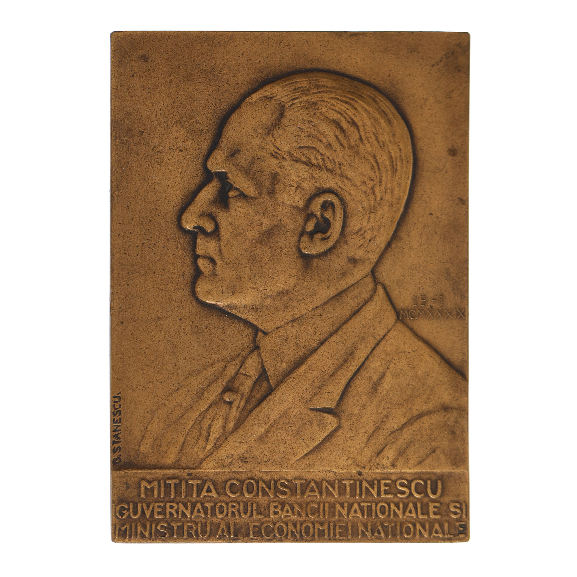 236. Placheta „Mitiță Constantinescu Guvernatorul Băncii Naționale și Ministru al Economiei Naționale'', gravor Gheorghe Stănescu, 1939