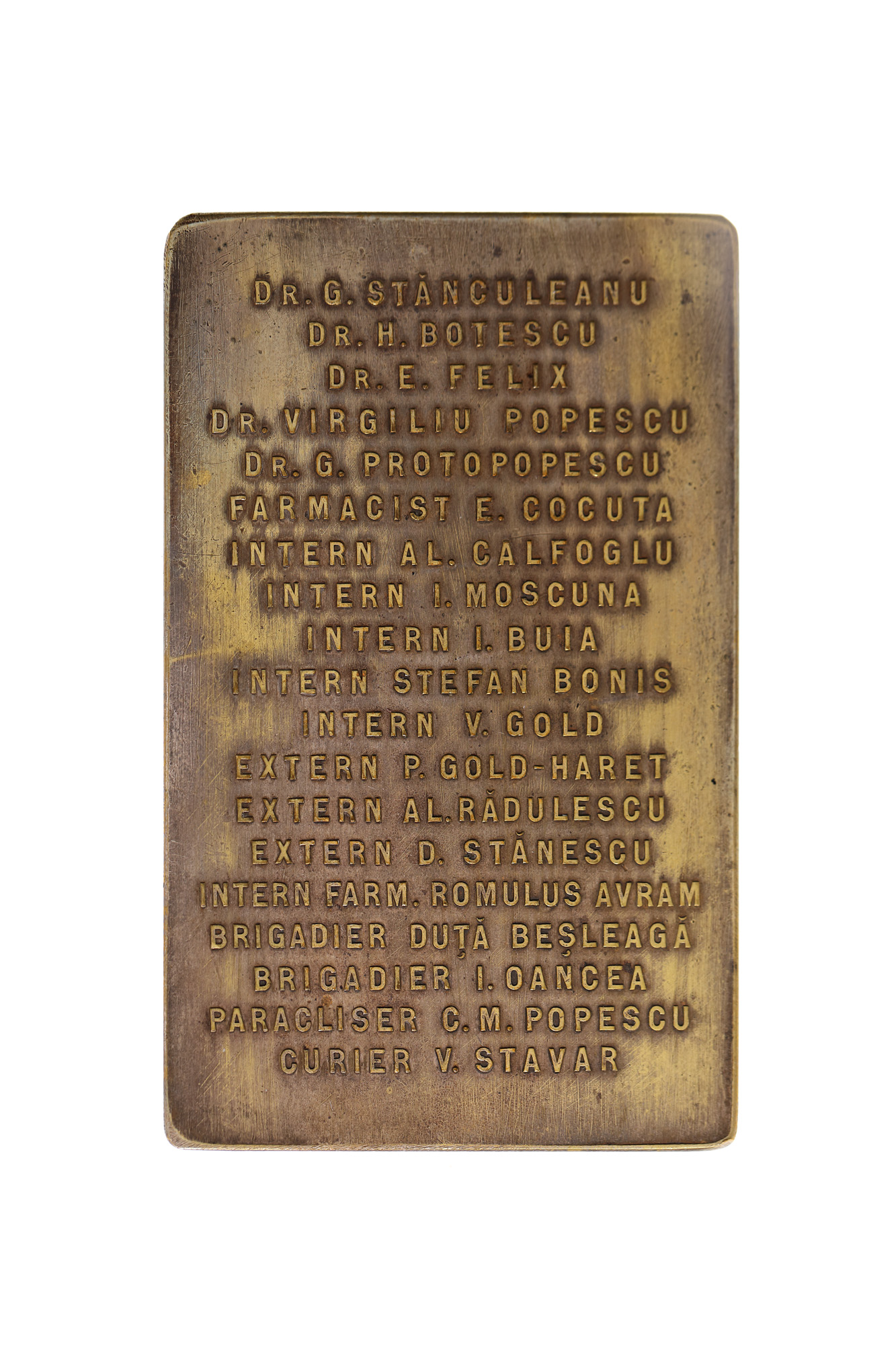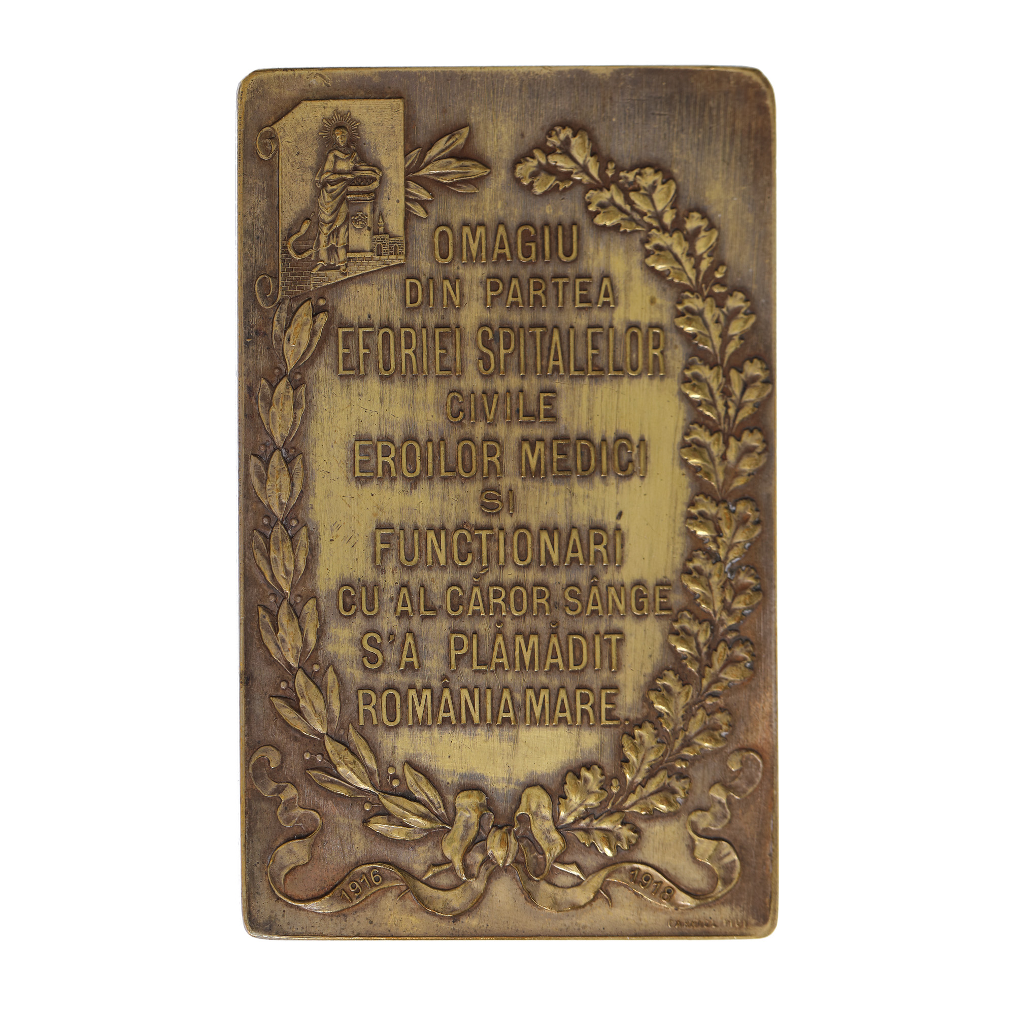 235. Placheta „Omagiu din partea Eforiei Spitalelor civile eroilor medici și funcționari'', gravor Mauriciu Carniol Fiul, 1916-1918