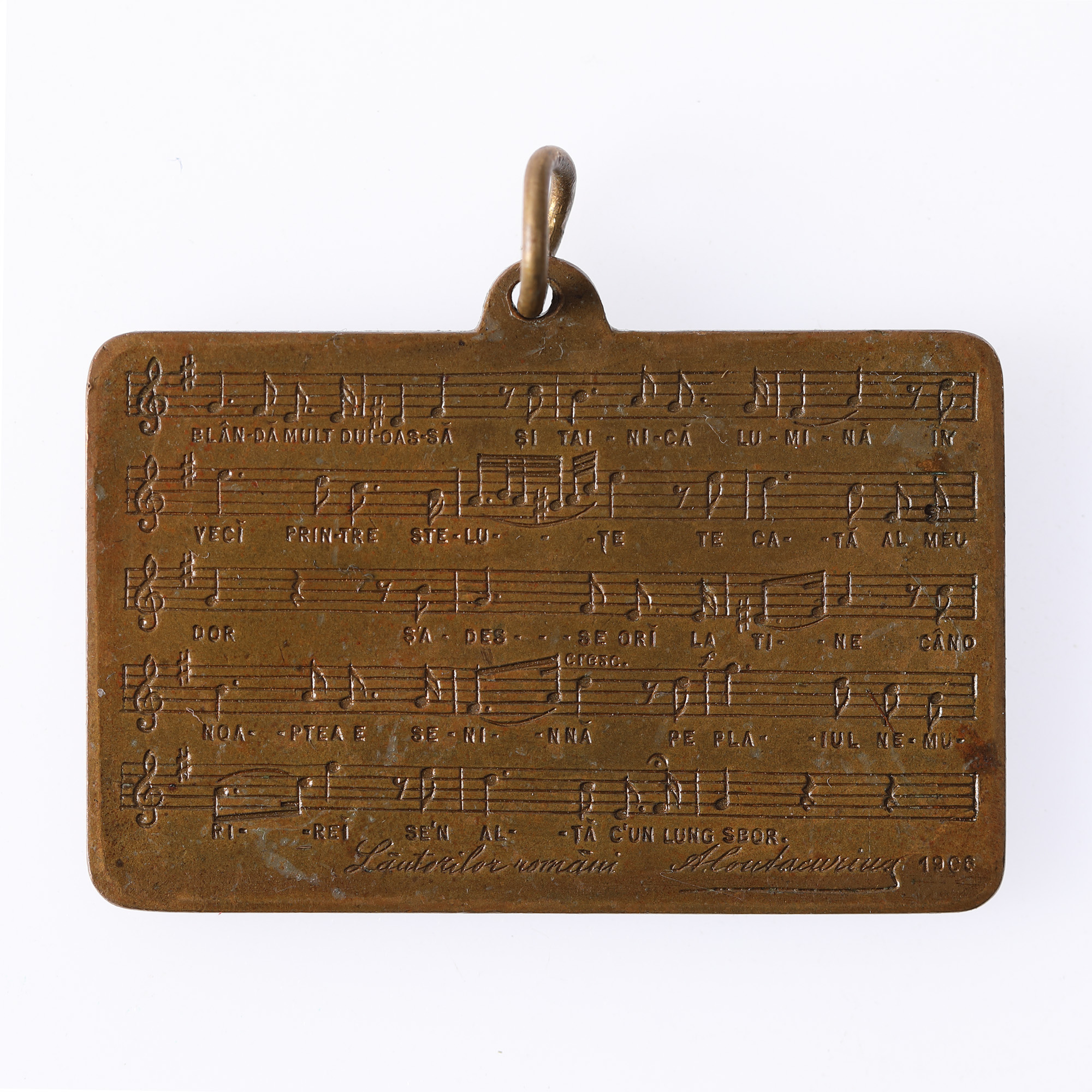 Placheta cuprinde în partea centrală partitura „Steluței", inițial o poezie a lui Vasile Alecsandri și adaptată ulterior de compozitorul și cântărețul Dimitrie Florescu pentru a deveni o lucrare populară în vremea celor doi, în timp ce partea superioară a medaliei include numele operei și al artiștilor, alături de anii de viață ai acestora. Reversul este alcătuit din sintagma „Lăutarilor români" și de milesimul 1906.