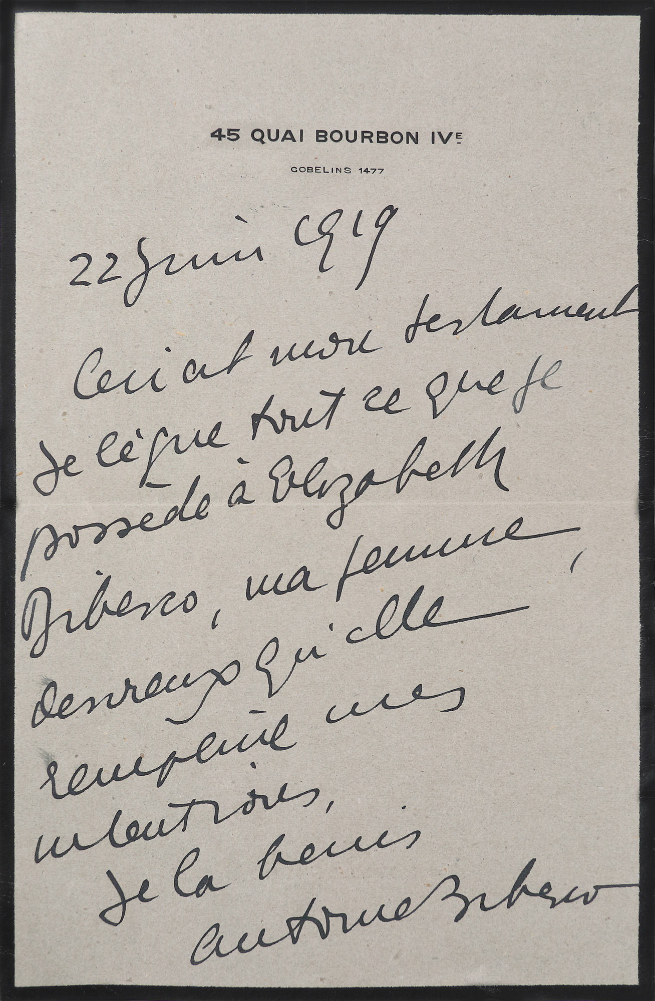 324. Testamentul olograf al diplomatului Anton Bibescu, în care menționează că își lasă toate bunurile soției sale, Elisabeta Bibescu, Paris, 1919, provine din colecția fostului ministru de externe George Macovescu