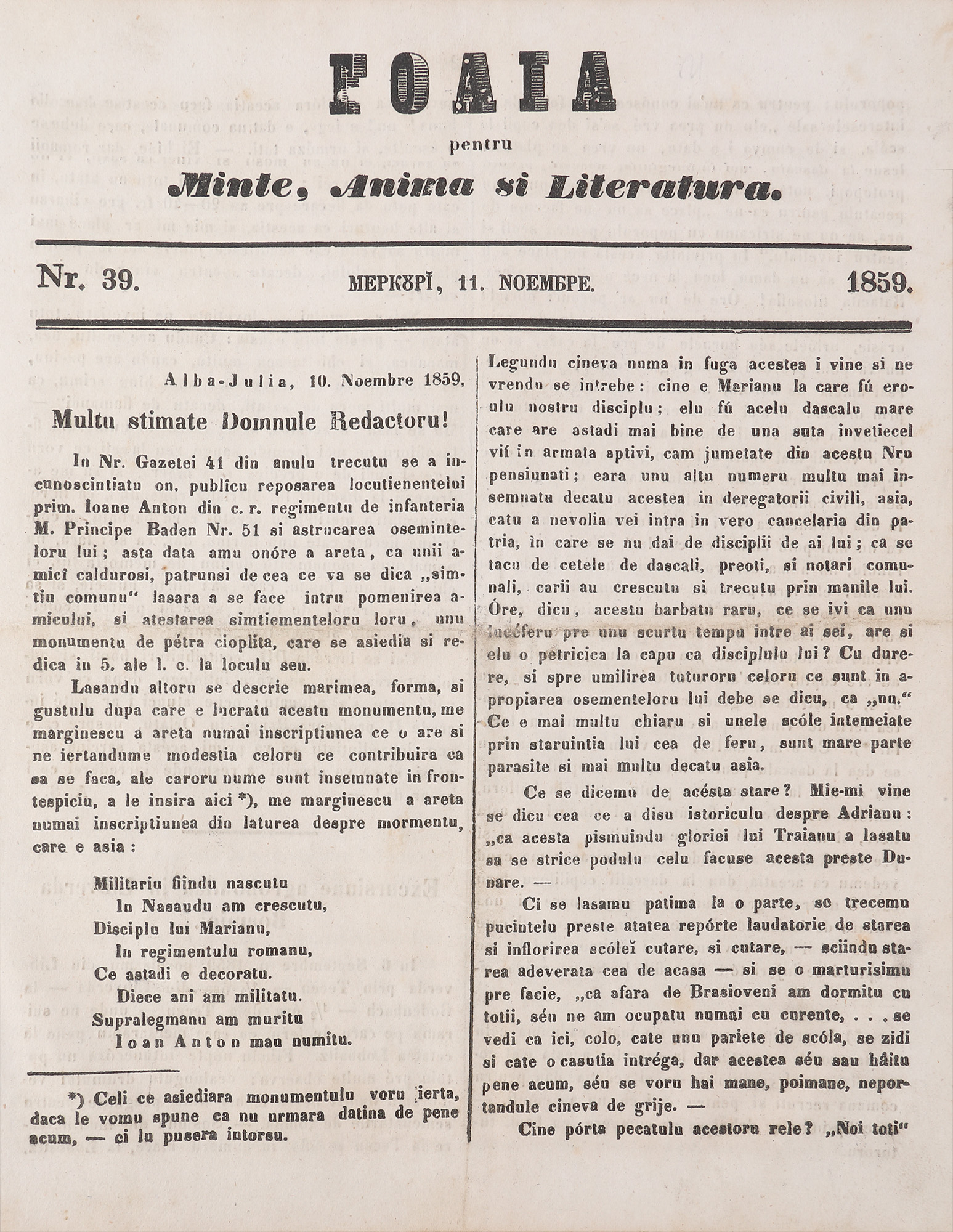 327. Ziarul ”Foaia pentru Minte, Inimă și Literatură”, numărul 39, Brașov, 11 noiembrie 1859