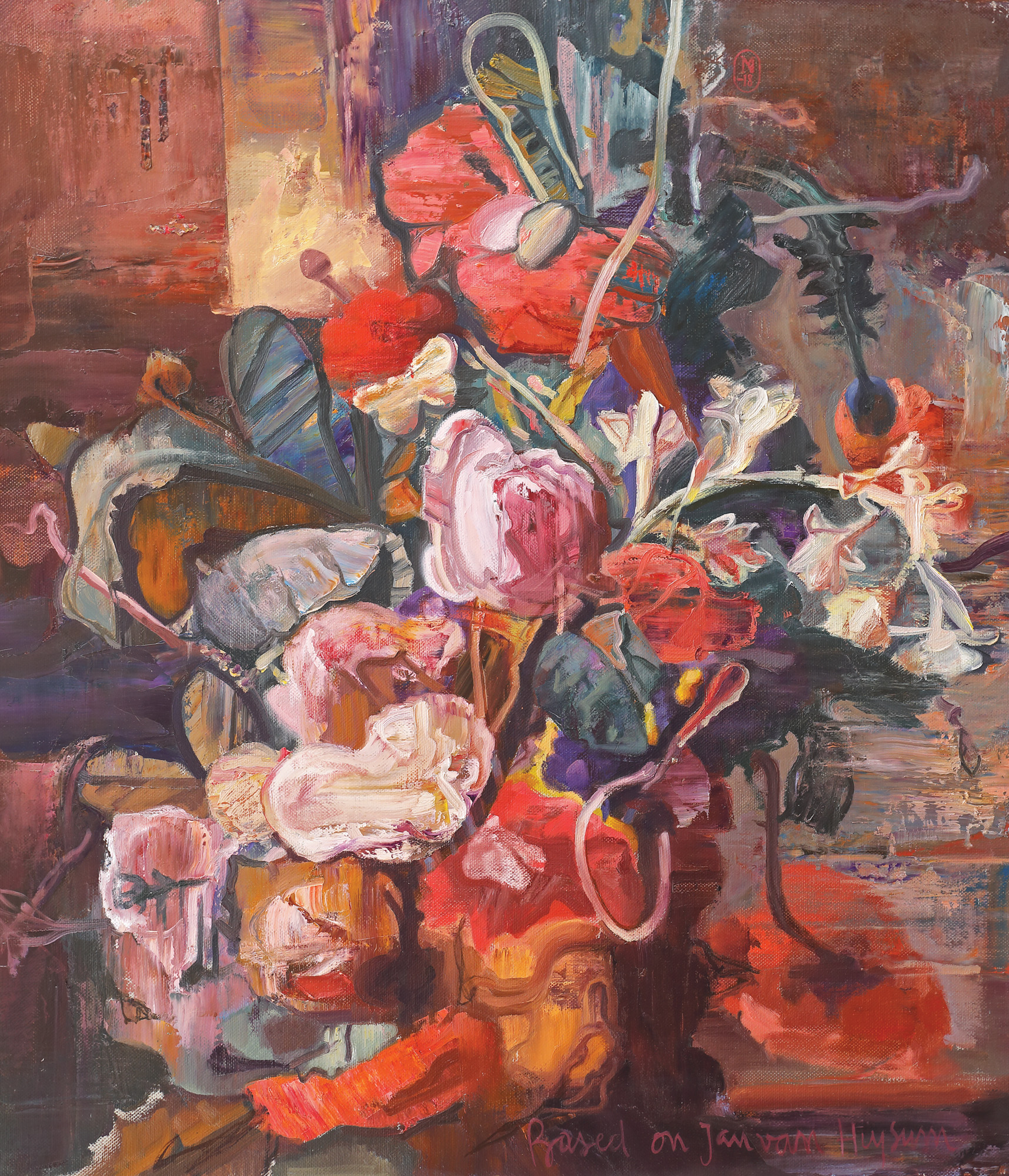 semnat și datat dreapta sus, cu roșu, în monogramă, "MN, (20)18"; intitulat dreapta jos, cu roșu, "based on Jan van Huysum"