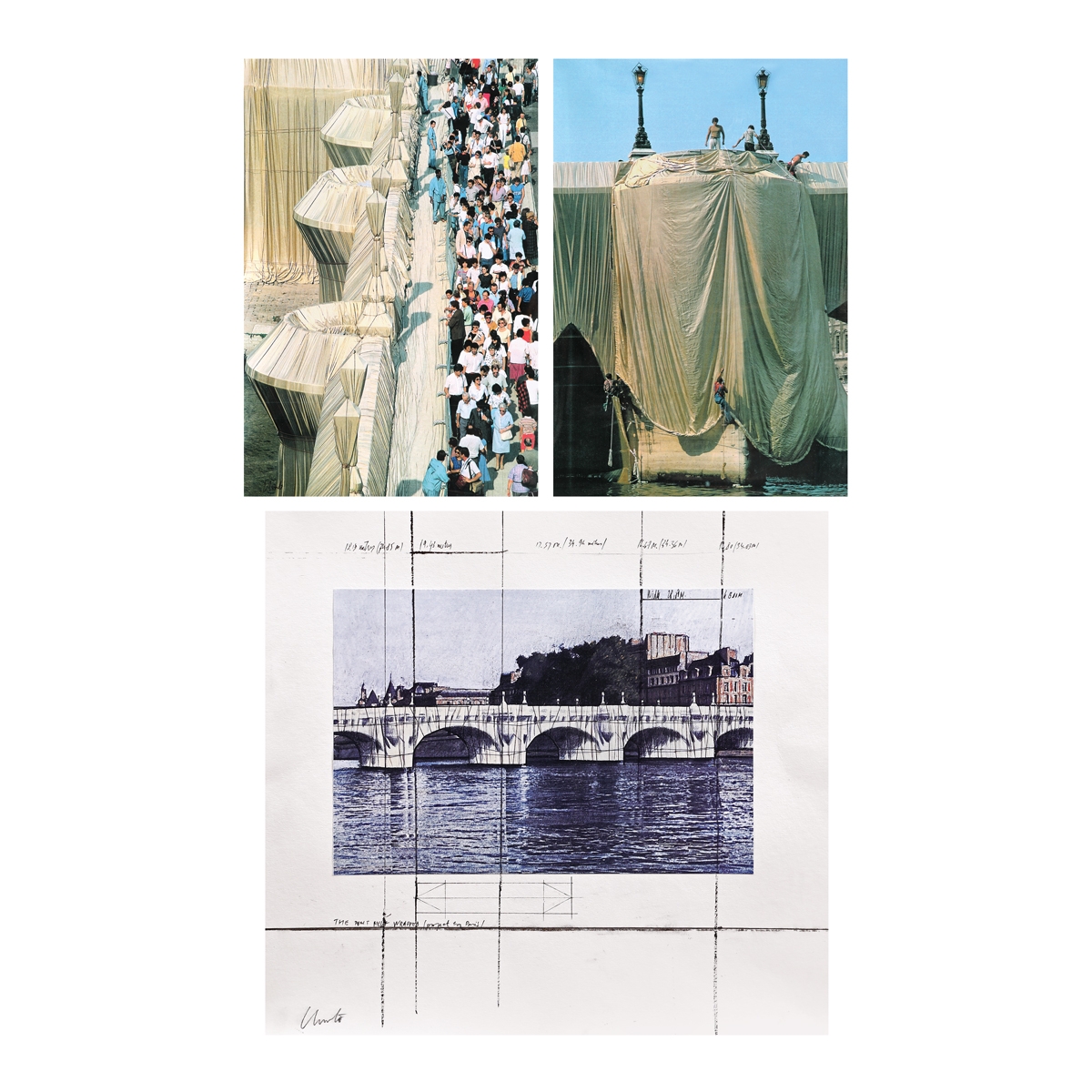 1. semnat stânga jos, în creion, "Christo"; intitulat stânga jos, cu negru, "The Pont Neuf Wrapped (project for Paris)"; 2. semnat stânga jos, cu negru, "Christo"; 3. semnat stânga jos, cu negru, "Christo"