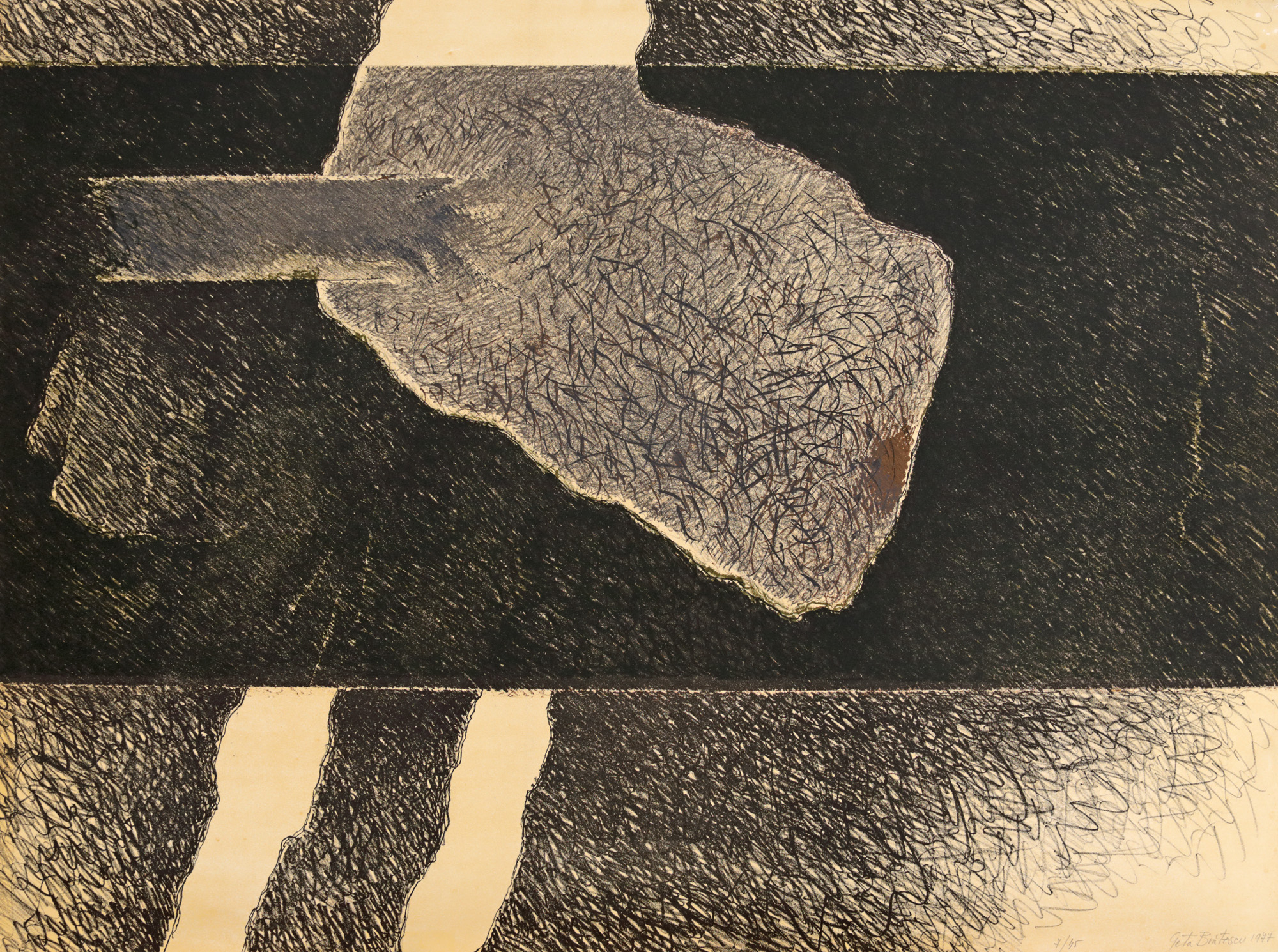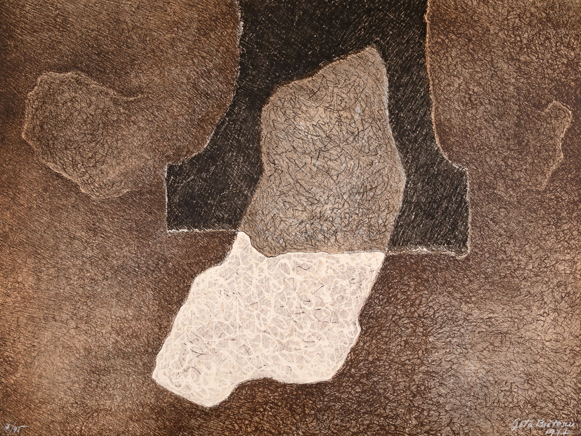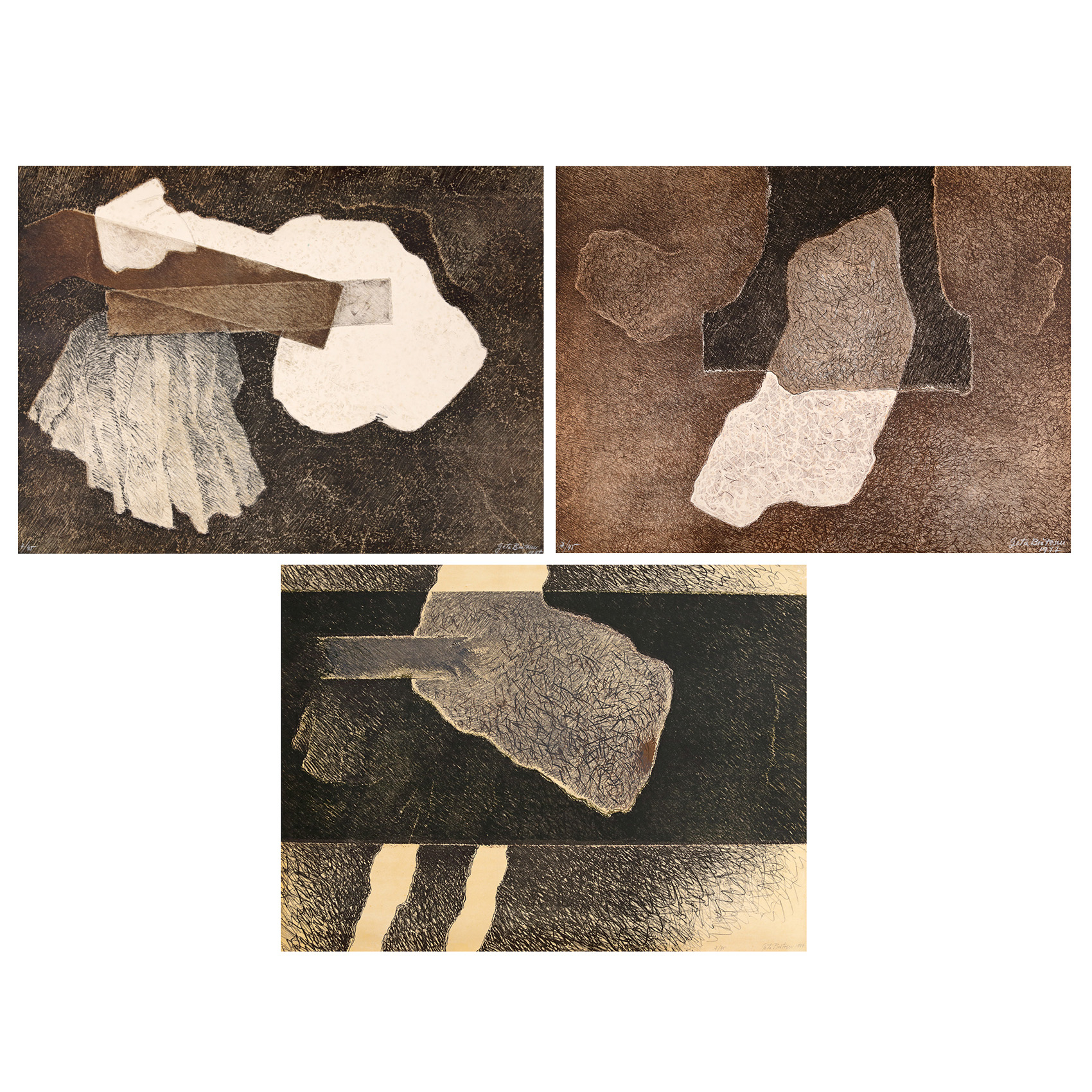 1. semnat și datat dreapta jos, cu alb, "Geta Brătescu, 1977"; numerotat stânga jos, cu alb, "7/45"; 2. semnat, datat și numerotat dreapta jos, în creion, "Geta Brătescu, 1977, 7/45"; 3. semnat dreapta jos, cu alb, "Geta Brătescu", numerotat stânga jos, cu alb, "7/45"
