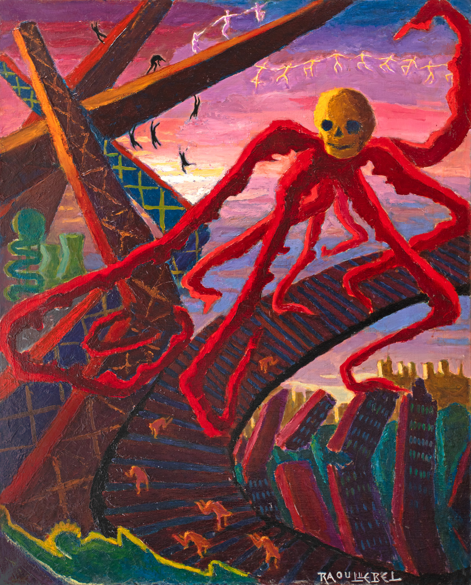 semnat dreapta jos, cu alb, "Raoul Lebel"; intitulat pe verso, cu negru, "Le Danger"