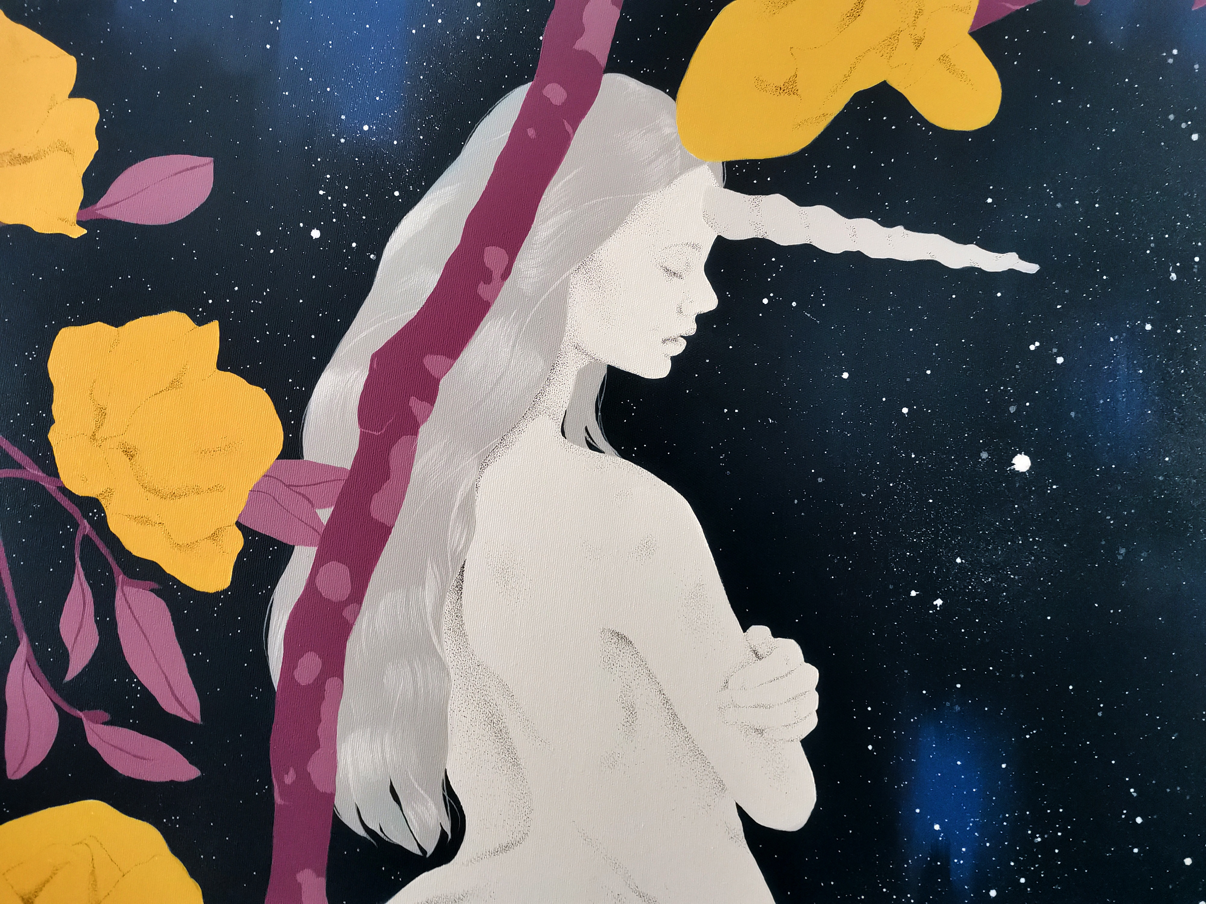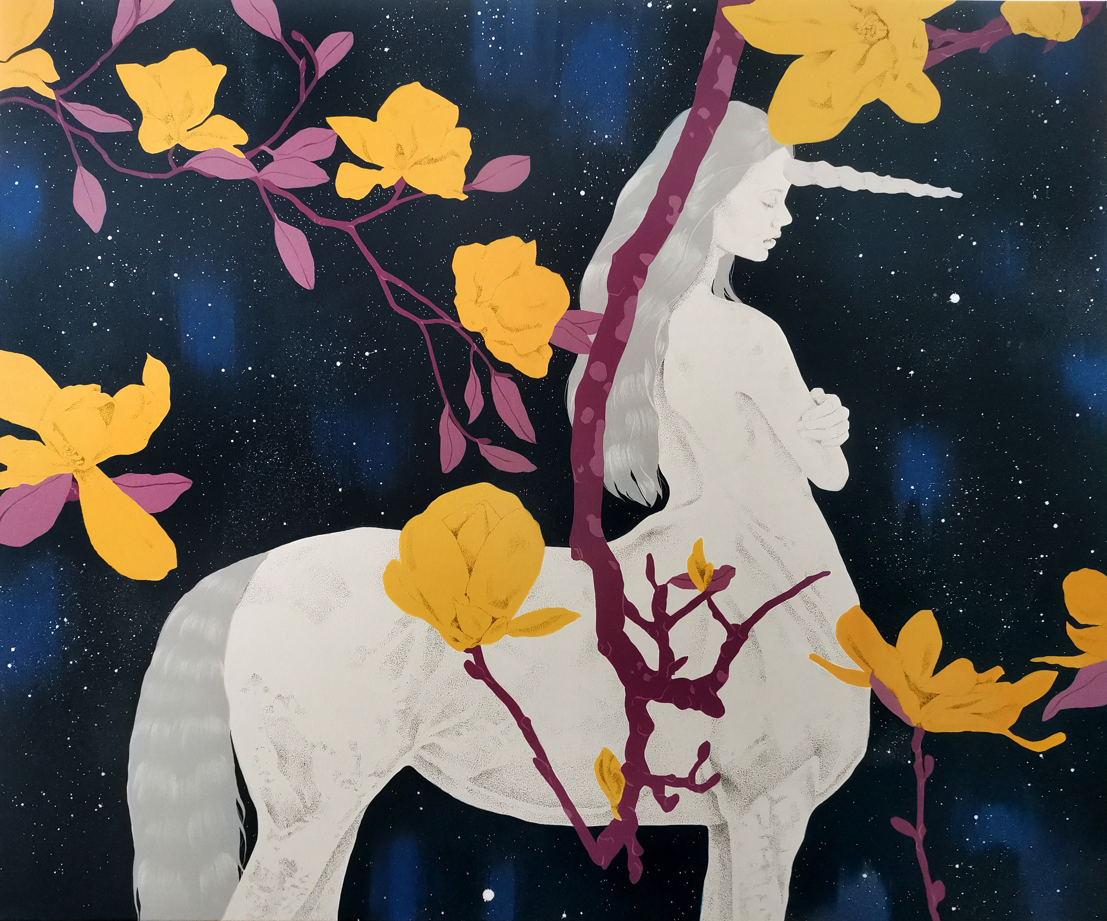 Lucrarea “The Truth Teller” propune un spațiu alternativ al unei realitati contemporane greu de conceput care depășește cu mult imaginarul. Simbolul mitologic al centaurului – războinic, înțelept, puternic și determinat în acțiunile sale de tot ceea ce îi perturbă existența este utilizat în lucrare ca și colportor al ideii de adevăr. Greu de discernut, presărat de imagini false, adevarul este deținut ancestral iar universul îl relevează într-un anumit moment istoric. Motiv pentru care artista apelează la simboluri mitologice cu un mare impact cultural. Simbolistica centaur-femeie-inorog sugerează contopirea unor atribute fundamentale ale vieții, potențate prin aura mitologicului întru dorița de luciditate si adevar. Cornul, fascicul de lumină pură, devine instrumentul iluminării în sens propriu și figurat. Artista propune o juxtapunere curajoasă a tehnicilor artistice variate, optând pentru minuțiozitatea pointilismului în reprezentarea elementului central, și a suprefețelor cromatice vibrante pentru fundal.