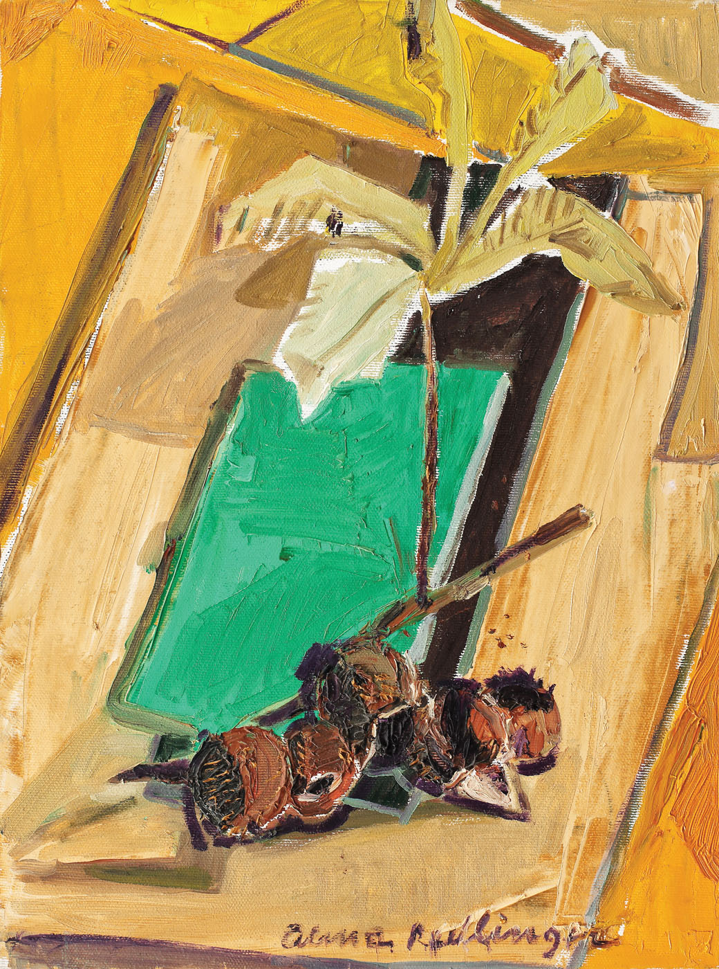 semnat central jos, cu violet, "alma redlinger"; semnat, datat, intitulat şi dedicat pe verso, "Castane cu frunză pe galben, 2009, Dlui Călin Popa, Alma Redlinger"
