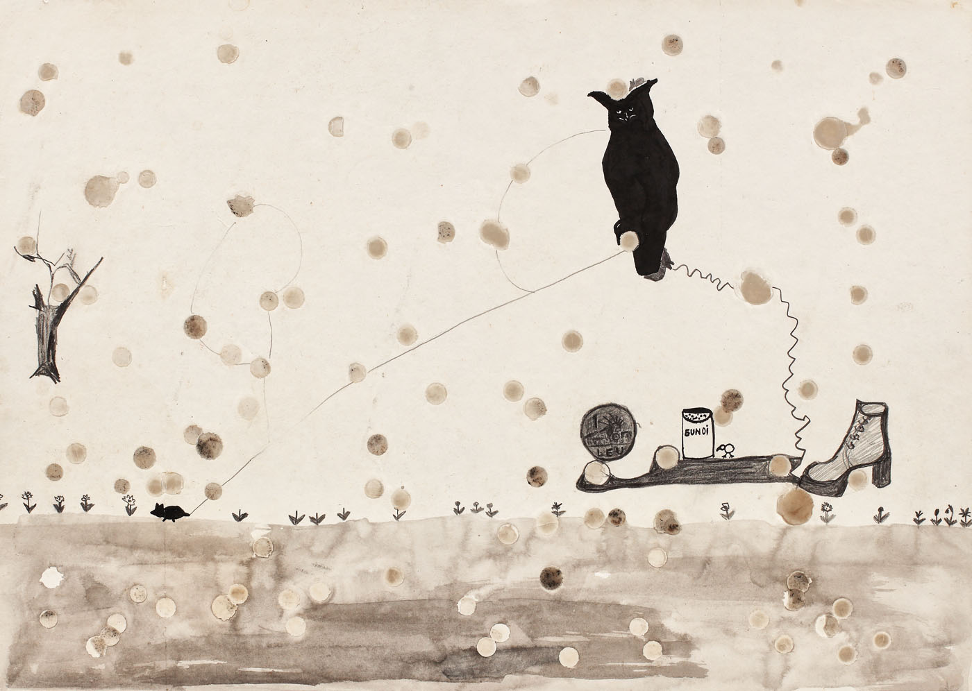 creion, acuarelă, ceară şi tuş pe hârtie lipită pe carton
