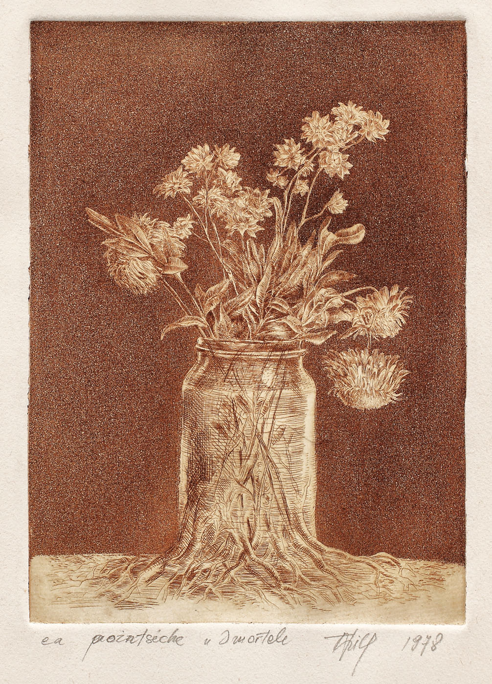 semnat, datat, intitulat şi notat central jos, în creion, ""T.Filip, 1978, Imortele, point seche, e.a.