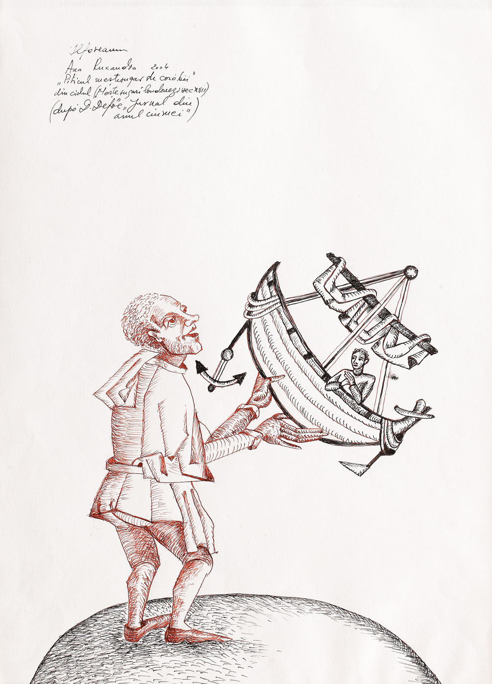 semnat, datat şi intitulat stânga sus, în peniţă, "Ilfoveanu Ana Ruxandra, 2004, Piticul meşteşugar de corăbii, din ciclul Meşteşugari londonezi, sec XVII"
