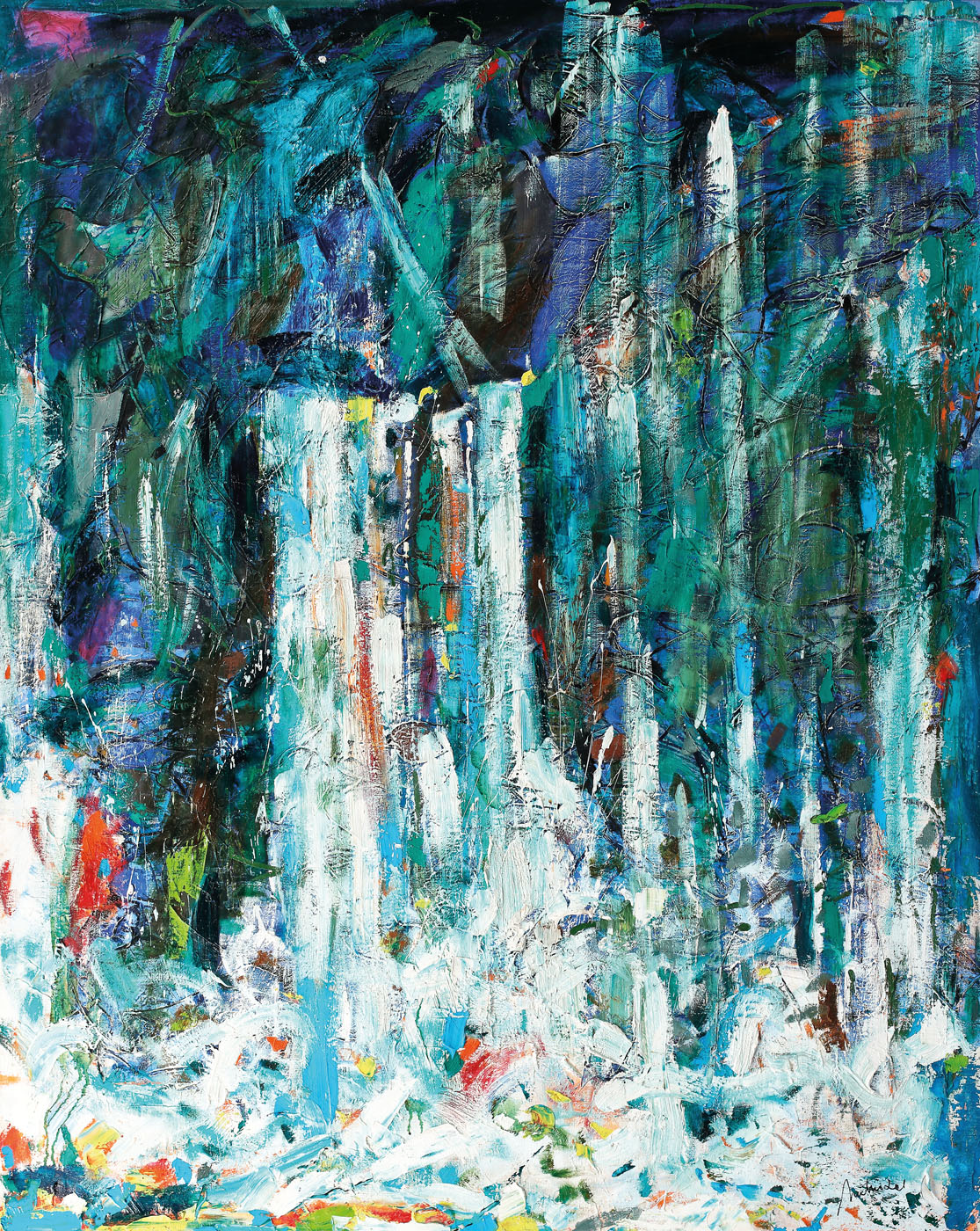 semnat dreapta jos, cu negru, "Nuţiu"; dedicat pe verso, cu negru, "Ca simbol, cascada este semnul bogăţiei. Dar nu totul se reduce la simbol, ea fiind integrată în natură, şi protejează peşti, animale, păsări, are un susur. Caut în permanenţă să găsesc muzicalitatea curgerii, dar şi a ambientului în care se desfăşoară, copaci, plante. Complexitatea fenomenului de fantezia gândurilor, 26 IV 2006, Nuţiu Romul"