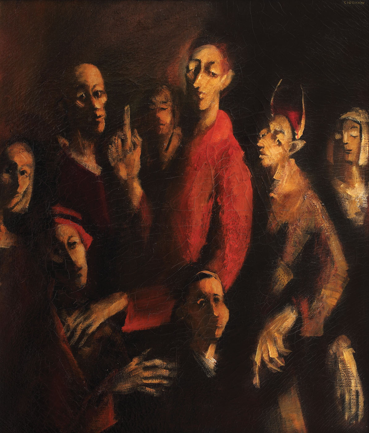 Mircea Ciobanu, deşi a petrecut doar 40 de ani printre muritori, rămâne pentru posteritate un om de geniu ale cărui creaţii depăşesc limitări impuse de timp şi spaţiu. S-a remarcat ca pictor de excepţie, scriitor, sculptor, dar şi filosof. Din produsul eforturilor sale au rămas picturi prin care reverberează intens flama propriei sale trăiri şi căliri spirituale în vâltorile destinului tumultos pe care l-a avut de înfruntat şi dus la bun sfârşit. Absolvent al Institutului de Arte Plastice „Nicolae Grigorescu” la clasa maestrului Corneliu Baba, Mircea Ciobanu s-a evidenţiat printr-un talent debordant care l-a propulsat spre un debut artistic exploziv. Iubit şi apreciat în ţara sa de origine, a fost considerat a fi artist de excepţie, devenind membru al uniunii artiştilor plastici în 1976. La Bucureşti, lucrările sale au fost expuse în spaţii culturale de prestigiu, precum Ateneul Român în 1975. În 1977, artistul are o expoziţie de pictură la Paris la Muzeul „Ernest Rupin”. În 1980 picturile artistului sunt expuse la Bruxelles, la Galeria „Baron Rene Steens”. În 1981, Mircea Ciobanu se mută în Elveţia, unde îşi continuă cariera artistică. Pictorul este cel ce realizează frescele şi vitraliile catedralei Sainte-Claire din Saint-Sulpice, aproape de Lausanne. Lucrările pictorului Ciobanu au încărcătură spirituală adâncă; aceasta transpare atât prin subiect, cât şi prin tehnica impecabilă. După cum Pietro Maria Bardi (directorul Muzeului de Artă Modernă din Sao Paolo) exclama în 1984 cu ocazia expoziției Mircea Ciobanu în Brazilia: „În cei 38 de ani de carieră nu am întâlnit un alt artist cu acelaşi control tehnic”. Prin tehnica şi stilul său, Ciobanu aduce Renaşterea direct în contemporaneitate, oricare şi oriunde ar fi aceasta, întoarcând rigorile tehnice în avantajul propriei sale creaţii, făcându-le să lucreze în interesul propriului său eu creator exprimat cu largheţe în compoziţiile sale. Prin combinări de lumini şi umbre, atât în redare, cât şi în subiect, picturile lui Ciobanu emană tensiune dramatică de o energie pură, ardentă, care fascinează şi copleşeşte în egală măsură. Clar-obscurul şi antiteticul sunt uneltele prin care pictorul reuşeşte să emane propria viziune, acestea devenind mărci ale artei sale. În lucrarea Consiliul înţelepţilor extremele predomină şi sunt armonizate de pictor prin tehnici precum clar-obscurul, dar şi prin spectrul de culori ce emană un sentiment ardent de pasiune umană, dar şi de supranatural şi nelumesc. Lucrarea lui Ciobanu este de o teatralitate covârşitoare, ce provoacă şi atrage privitorul într-o lume cuprinsă între rai şi iad, între lumină şi întuneric, între sus şi jos. Contemporană şi barocă, clasică şi romantică, mistică şi teatrală, Consiliul înţelepţilor este o lucrare complexă prin care Mircea Ciobanu convinge că nu s-a manifestat doar ca artist de înaltă talie, ci şi ca vizionar lucid cu adâncime filosofică. În compoziţie sunt înfăţişate şapte personaje strânse în cerc în jurul unuia singur - predominant şi absolut, prezenţă magnetică ce pare a fi urmată, protejată şi venerată cu docilitate de cei prezenţi. Ideea acestei ierarhii transpare din dinamica personajelor, precum şi din coloristică. Dinamica în spirală a personajelor sugerează evoluţia umană pe o scară ierarhică, dar şi interdependenţa între acestea. Unele personaje dau iluzia de umil, altele au rolul de a reda făţiş demonicul – precum personajul încornorat plasat în partea din dreapta-spate, raportat la personajului central în roşu. Tonurile calde şi nuanţele de auriu ce învăluie lucrarea conferă acesteia aura sa spirituală şi mistică. Coloristica vine în sprijinul poveştii şi învăţăturii pe care creatorul – în egală măsură artist şi filosof - o transmite. Roşul intens al veşmintelor personajului central emană ideea de energie dominatoare şi putere. Acesta este şi cel mai luminat dintre personaje, pe o poziţie mai înaltă decât a altor personaje. Degetul arătător al acestuia este îndreptat în sus, în contrast cu degetul arătător îndreptat in jos al personajului încornorat amplasat chiar în spatele său. Restul personajelor, redate într-o lumină mai difuză şi în nuanţe mai terne de burn, prin amplasarea lor în cerc, vin să întărească şi să confirme mesajul transmis tacit, prin imagine, de prezenţele centrale. Într-adevăr, prin lumina ce le învăluie, dar şi prin redarea alungită, filiformă, gotică a chipurilor lor, personajele par mai aproape de prezenţele plutitoare şi efemere, de miraje, proiecţii şi apariţii ezoterice decât de concretul tangibil, tactil şi teluric. Dramatismul teatral este redat atât prin lumină şi culoare, cât şi prin subiect şi reprezentarea personajelor în compoziţie. Scena pictată de artist dă impresia de parabolă, de pildă precum adevăratele lecţii biblice redate în frescele pictate în biserici. Personajelor se constituie într-o prezenţă eternă, generică, prin coagularea lor ritualică, conferind senzaţia de static şi bine înţepenit, dar şi de dinamism în egală măsură. Acestea se identifică prin priviri şi în aceeaşi măsură îşi pierd din identitatea particulară - căpătând una generică - prin îndreptarea privirii spre un public imaginar: privitorul însuşi. (I.G.)