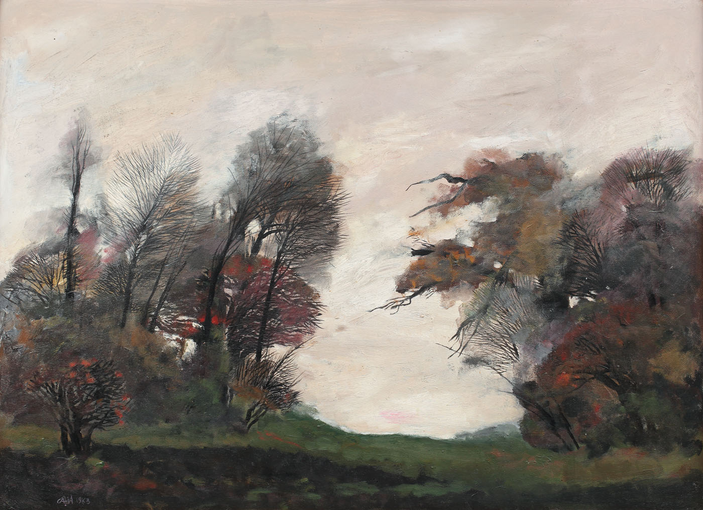 semnat şi datat stânga jos, cu roz, "Câlţia, (1)983"