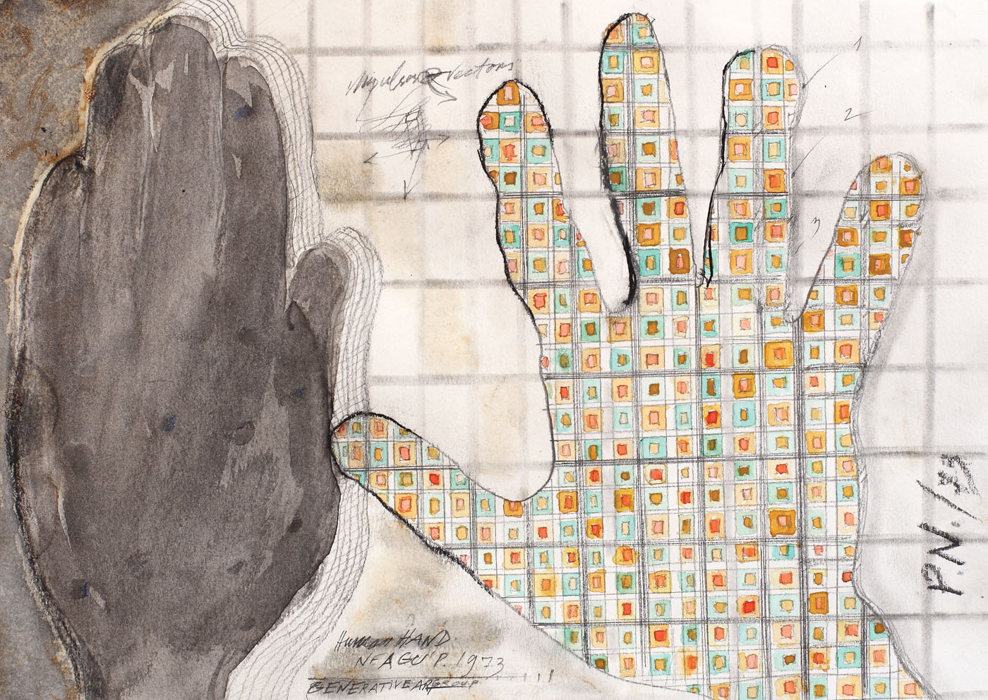 semnat și datat lateral dreapta, cu negru, "PN, (19)73"; semnat, datat și intitulat central jos, în creion, "Neagu P., 1973, Human Hand, Generative Art Group"